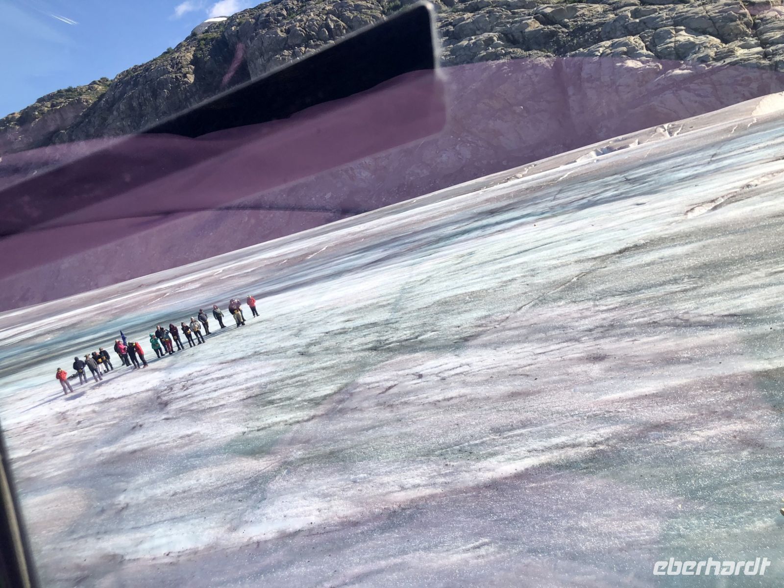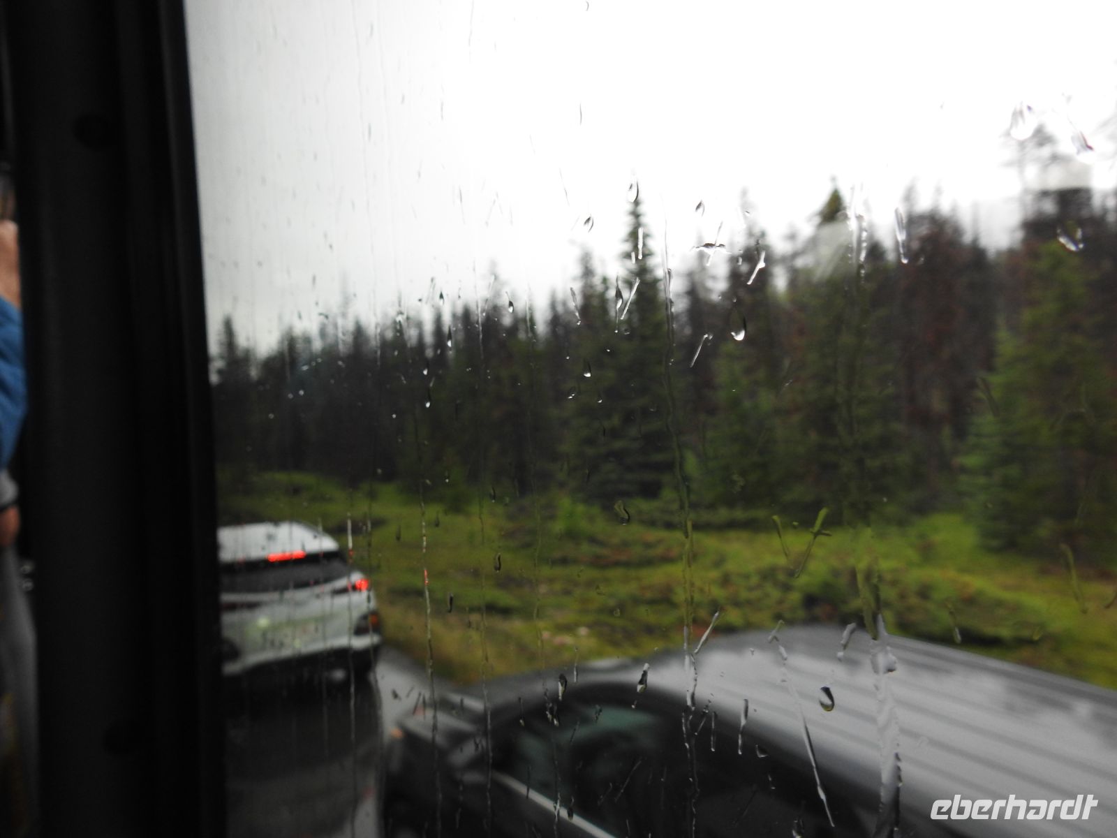 Die Stimmung bei uns ist angesichts des Wetters eher schwierig. Was soll das denn werden in dem strömenden Regen? Auch die Leute, die uns dem Bus vom Gletscher entgegen kommen, sehen nicht sehr glücklich, sondern durchgefroren und verzweifelt aus. Doch es hilft nichts, wir haben das gebucht und los gehts. Kaum steigen wir in den Bus, hört es auf zu regnen. Mit einem ganz normalen Reisebus fahren wir bis zur Parkstation der Spezialfahrzeuge. Hier steigen wir um in einen Snow Coach mit riesengroßen Rädern, der zu unserer Überraschung von einer klitzekleinen jungen Frau gefahren wird. Sie heißt Kathleen und ist sehr unterhaltsam. Über unglaublich steile Wege bringt sie uns auf den Gletscher. Hier haben wir eine halbe Stunde Zeit, um auf herum zu spazieren, uns fotografieren zu lassen und andere Menschen zu fotografieren. Man fühlt sich hier als eingeschworene Gemeinschaft. Alle wollen dasselbe - ein spektakuläres Erinnerungsfoto.