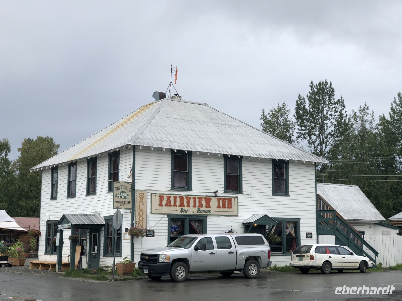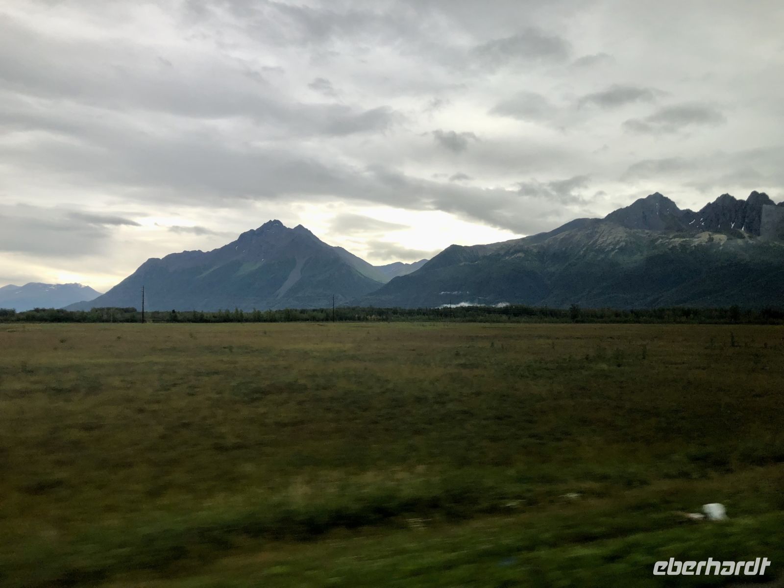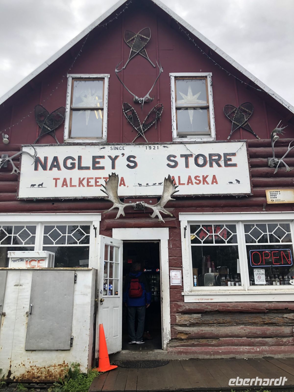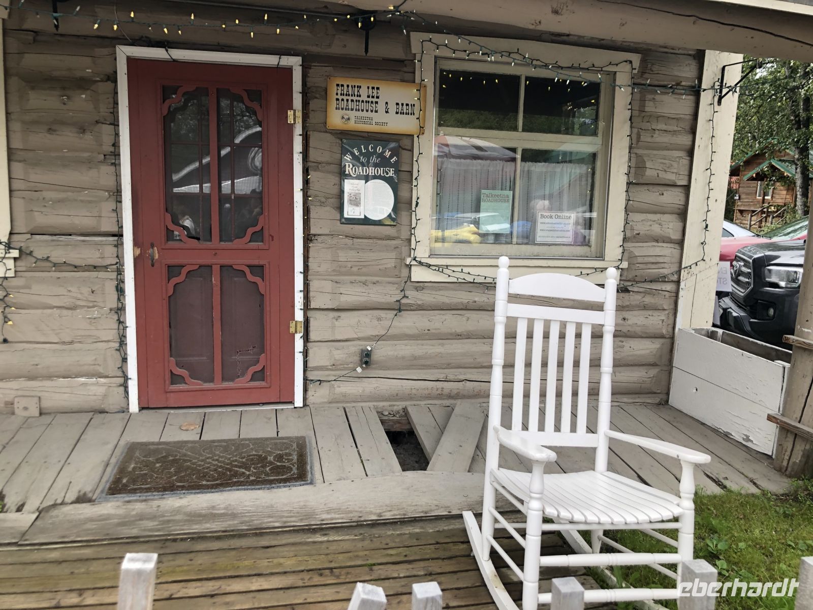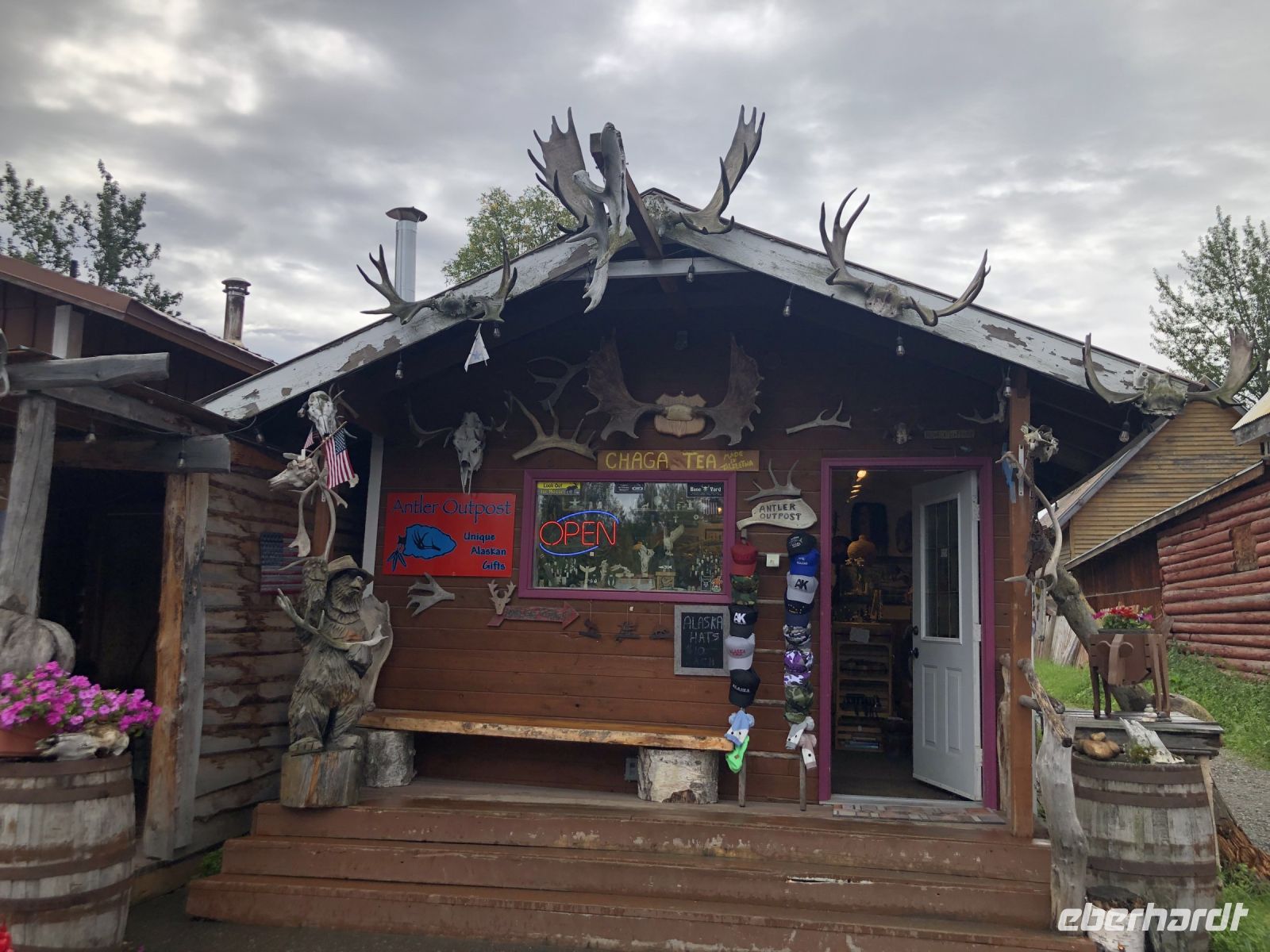 Am Vormittag durchqueren wir Palmer, ein Städtchen, das in den Talkeetna Mountains liegt. Das enge Tal zwischen den Bergen wurde einst vom Gletscherfluss Matanuska ausgewaschen. 1935 wurden hier etwa zweihundert Familien aus dem Mittleren Westen angesiedelt. Sie erhielten Land für den Anbau von Gemüse, zur Heuproduktion und für die Viehzucht. Die äußerst harten Lebensbedingungen führten jedoch zu Hunger und Krankheit, so dass nur wenige Familien die Gründerzeit überstanden. Heute wohnen hier viele Menschen, die in Anchorage arbeiten, aber nicht dort leben wollen. Auf dem Weg nach Denali machen wir Stopp an einer Mall, einem amerikanischen Einkaufszentrum, um uns vor allem mit Getränken zu versorgen, die im Denali sehr teuer sein sollen. Gegen Mittag erreichen wir Talkeetna. Am Bahnhof treffen wir auf einen Zug der Alaska Railroad, mit der wir auch noch unterwegs sein werden. Talkeetna ist weltweit die einzige Stadt, die fünfzehn Jahre lang eine Katze als Bürgermeister hatte, da kein geeigneter Kandidat zur Verfügung stand. Wir spazieren vorbei an Häusern, die zum Teil noch authentisch erhalten sind und anderen, die neu erbaut wurden. Ohne Annas Erklärungen würden wir das von allein nicht erkennen. Das Haus namens Nagley's Store hat eine besondere Geschichte. Es gehörte einem Mann namens Horace Nagley. Eines Tages wollte er mit seinem Haus, in dem er einen Gemischtwarenladen betrieb, umziehen. Er legte sein gesamtes Haus auf Rollen und bewegte es so zu seinem neuen Standort. Während des Umzugs blieb der Laden geöffnet. Eine andere Geschichte rangt sich um das Haus Fairview Inn. Nicht nur, dass sich einst die erste Badewanne von Takeetna hier befand, im Juli 1923 nächtigte hier der 29. Präsident der Vereinigten Staaten, der kurz darauf an einer Lebensmittelvergiftung starb. Gerüchte machten die Runde, dass er absichtlich vergiftet wurde. Im Inneren des Fairview Inn befindet sich heute eine kleine Kneipe mit Geweihen und Tierköpfen an den Wänden und ein paar verblichenen Zeitungsartikeln, die über den Kriminalfall berichten.