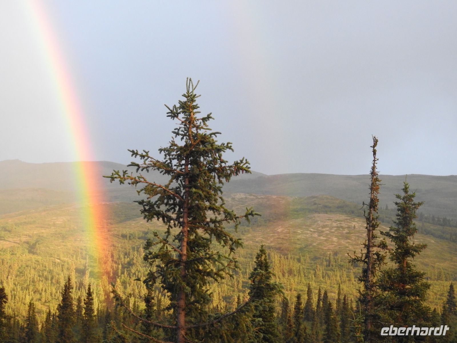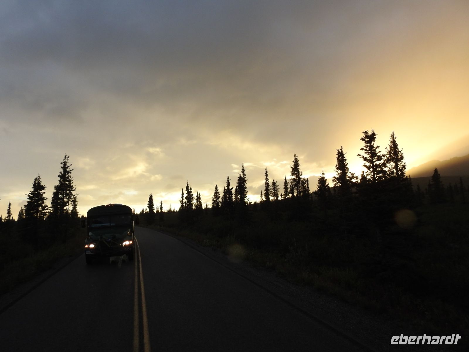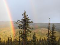 Eigentlich sollte heute der ganze Tag für die Erkundung des Denali Nationalparks zur Verfügung stehen. Allerdings gab es einen Erdrutsch und so ist ein großer Teil des Parks nicht befahrbar. Als Alternative ist für uns ein Wildwasser-Rafting vorgesehen. Im Besucherzentrum werden wir mit wasserdichten Anzügen ausgestattet. Jedes Schlauchboot fasst zehn Passagiere und einen Bootsmann. Dann geht es auf den Nenana River. Zunächst nehmen die Boote eine gemütliche Fahrt auf. Doch das bleibt nicht lange so. Bald schon spritzt uns die Gischt um die Ohren und Wellen eiskalten Gletscherwassers schlagen über unseren Köpfen zusammen. Es ist ein Heidenspaß, doch nach fast zwei Stunden sind wir ziemlich durchgefroren und freuen uns auf eine heiße Dusche im Hotel. Zum Mittagessen kehren wir im Restaurant Prospectors ein. Es gibt Pizza all you can eat. Den Nachmittag verbringen wir im Denali Nationalpark. An den Berghängen entdeckt unser Fahrer eine Herde Dallschafe. In einem Busch am Straßenrand hat es sich ein Schneehuhn gemütlich gemacht. Auch ein Grizzly wird entdeckt. leider sehr weit weg und für uns nur über die Kamera des Busfahrers zu sehen. Ab und zu halten wir zu Fotostopps an. Auf dem Rückweg begleiten uns mehrere Regenbogen. Wer spät abends noch einmal sein Zimmer verlässt, kann erleben, wie der Himmel beim Sonnenuntergang glüht.
