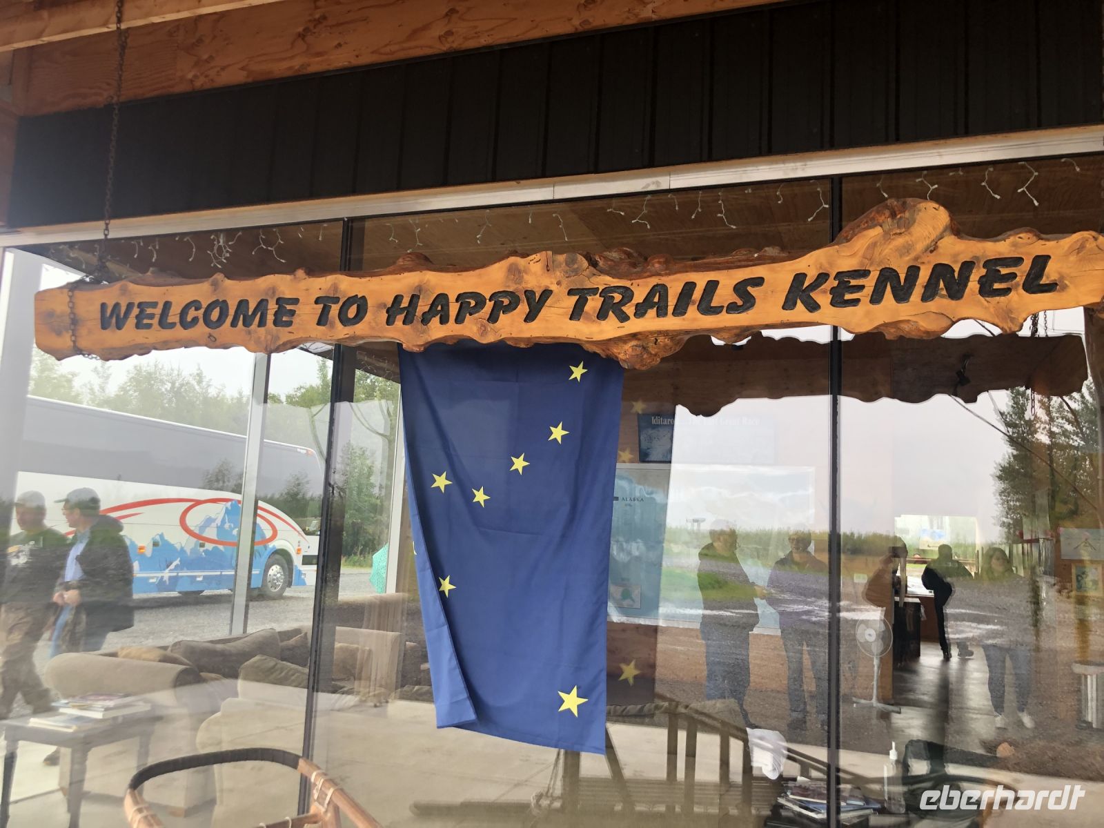Wir fahren zurück zum Hotel. Nun steht der Tag zur freien Verfügung. Einige Gäste beschließen, schon heute das Native Heritage Center zu besuchen, andere buchen sich einen Ausflug an der Hotelrezeption. Die Gäste, die den Bärenausflug nicht gebucht hatten, haben sich alternativ eine Fahrt zu einem Husky-Zentrum organisiert. Leider war es nicht möglich, einen Bus zu chartern, um gegebenenfalls weitere Gäste mit einzubeziehen. Das Husky-Camp wird von Martin Buser betrieben. Ursprünglich stammt er aus der Schweiz, ist aber 1979 nach Alaska ausgewandert, um Schlittenhunde zu züchten. Seit 1980 nahm er zwanzig Mal am berühmten Iditarod-Rennen teil, das er viermal gewann. Diesen sympathischen Mann lernen wir persönlich kennen. Zunächst sehen wir einen Film über das Husky-Rennen, danach erhalten wir eine Vorführung, wie ein Husky für den Wettkampf gekleidet wird. Anschließend spannt Martin seine Hunde ein und fährt für uns ein paar Runden. In diesem Jahr hat das Camp auch Welpen, die wir auf den Arm nehmen und streicheln dürfen. Martin lässt es sich nicht nehmen, unsere neugierigen Fragen zu beantworten, sich mit uns fotografieren zu lassen und sich persönlich zu verabschieden.