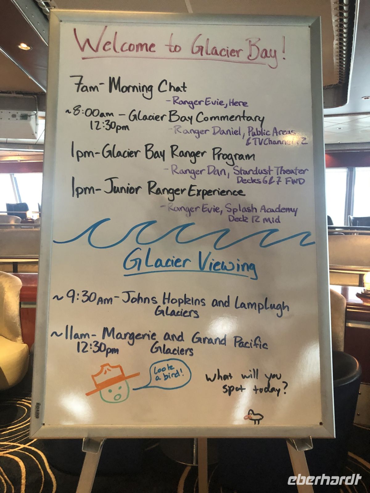 Wer will, kann heute ausschlafen. Frühstück gibt es entweder im Garden Café oder auch im Palace Restaurant. Den ganzen Vormittag über gibt es Informationsveranstaltungen oder diverse Unterhaltungsmöglichkeiten wie Bingo oder Deal or No Deal, Schmuck- und T-Shirt Verkauf oder Verschönerungsangebote. Um 9.30 Uhr findet im Stardust Theater eine Präsentation „Das ist Alaska“ statt. Mit amerikanischem Humor und tollen Bildaufnahmen erhalten wir einen Überblick über unser Ziel in den nächsten Tagen. Um 11.30 Uhr werden im Atrium die Offiziere vorgestellt. Wer es ruhig mag, kann sich in die Bibliothek zurückziehen. Die Zeit vergeht wie im Flug und schon gibt es Mittagessen und bald darauf das Abendessen. Anschließend können wir zwischen verschiedenen Live-Musikveranstaltungen wählen. Country-Musik, Rock und Pop, Tanzmusik oder auch Klassik, für jeden Geschmack ist etwas dabei. In den Bars und Lounges kann man einen Cocktail genießen und mit anderen Gästen ins Gespräch kommen. Das Getränk des Tages ist der Rebellische Fisch, ein Wodka mit Passionsfrucht, Cointreau, Orange und Prosecco. Prost! Und nicht vergessen: heute wird die Uhr um eine Stunde zurück gestellt.