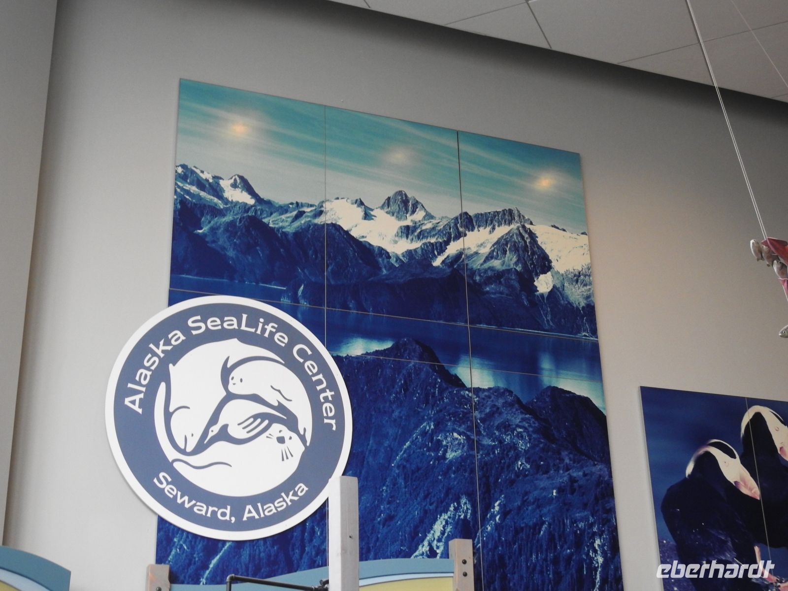 Reiseleiter/Busfahrer Drew (Andrew) holt unsere sieben Gäste, für die heute die Reise endet, am Kofferband ab. Schnell umarmen wir uns, wünschen guten Rückflug oder gute Weiterreise. Kurz darauf trifft auch Anna ein. Sie wird den anderen Teil der Gruppe in den nächsten Tagen begleiten. Auch sie ist heute Reiseleiterin und Busfahrerin zugleich. Für uns steht der Besuch des Sealife Centers von Seward auf dem Programm. Vorher zeigt uns Anna noch die Stadt bzw. stellt uns die paar Häuser vor, die Seward ausmachen. So gibt es zum Beispiel die Raven Gallerie, in der indigene Kunst ausgestellt wird, ein Haus, dass mit grünlich schimmernden Fliesen bedeckt ist, beherbergt ein Museum und die Bibliothek.