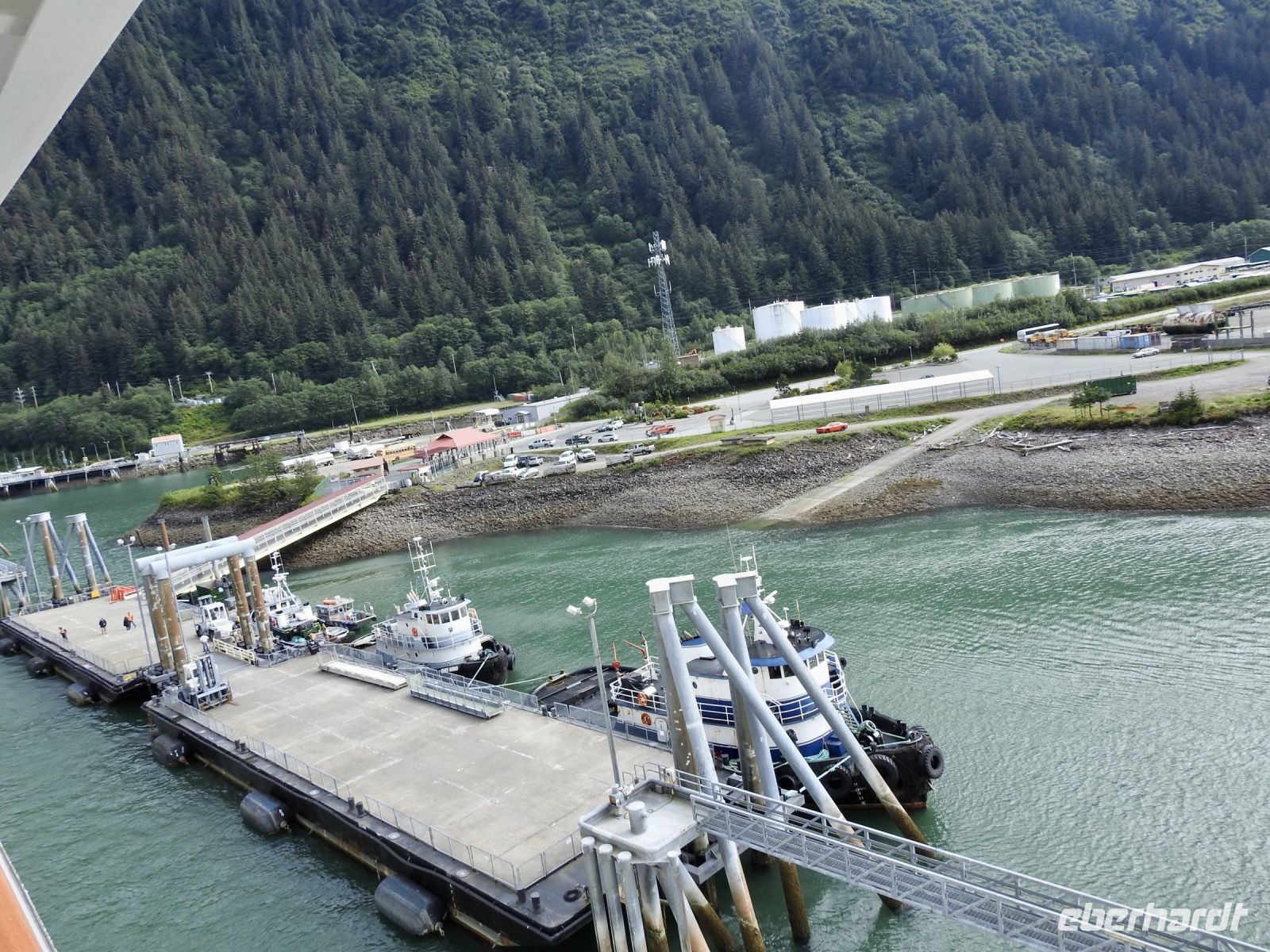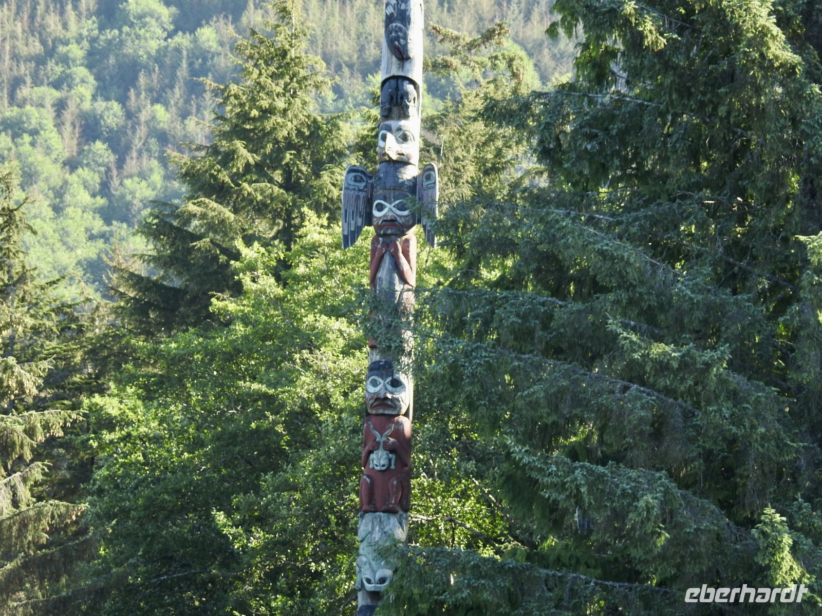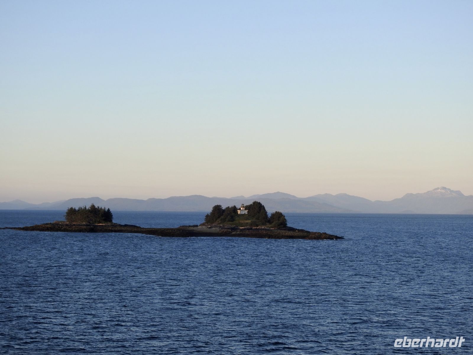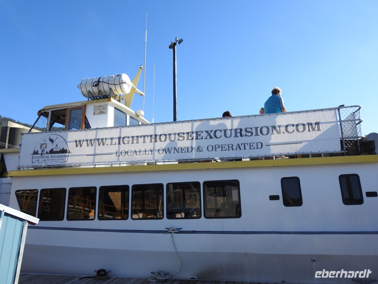 Einiges ist anders als bei vorherigen Kreuzfahrten mit NCL. Zum Beispiel treffen sich die Ausflügler nicht mehr an Bord, sondern an Land. Erstaunlicherweise geht das ruck zuck und wir sind in Kürze von Bord. In Ketchikan führt uns der Weg zunächst in eine riesige Lagerhalle, in der ein (vermutlich temporärer) Markt aufgebaut ist, um die gutbetuchten Kreuzfahrer zum Kauf zu verführen. Alles, was das Touristenherz begehrt oder auch nicht, ist im Angebot. Bald schon finden wir den Startpunkt unseres Ausflugs und bekommen jeder einen Aufkleber, an dem zu erkennen ist, zu welcher Gruppe wir gehören. Irgendwann dürfen wir dann losmarschieren, folgen unserem Guide. Der Weg führt durch einen Güterwagon in ein ehemaliges Industriegebiet bis zu einem kleinen Ausflugsboot. Die Tour scheint ausgebucht, alle beliebten Sitzplätze draußen sind schnell besetzt. Dass das keine Rolle spielt, zeigt sich später unterwegs. Wir haben eine Kapitänin, die genau weiß, wo sich die Nester Weißkopfadler befinden. Also sehen wir tatsächlich einen Horst mit Babyadlern, die noch keinen weißen Kopf haben, denn die Federn färben sich erst später von braun auf weiß. Immer wieder tauchen in den Bäumen versteckt, weiße Punkte auf, die wir bald als Weißkopfadler zu identifizieren wissen. Einen kurzen Stopp legen wir in angemessener Entfernung an einem indigenen Dorf ein. Von weitem sind das bemalte Haus und die Totempfähle zu sehen. Letzter Stopp ist der erste hier errichtete Leuchtturm, der inzwischen ein moderner ist und sich auf einem kleinen Inselchen befindet. Unsere Gastgeber verwöhnen uns mit einem Imbiss und Getränken und bald darauf sind wir zurück am Schiff.