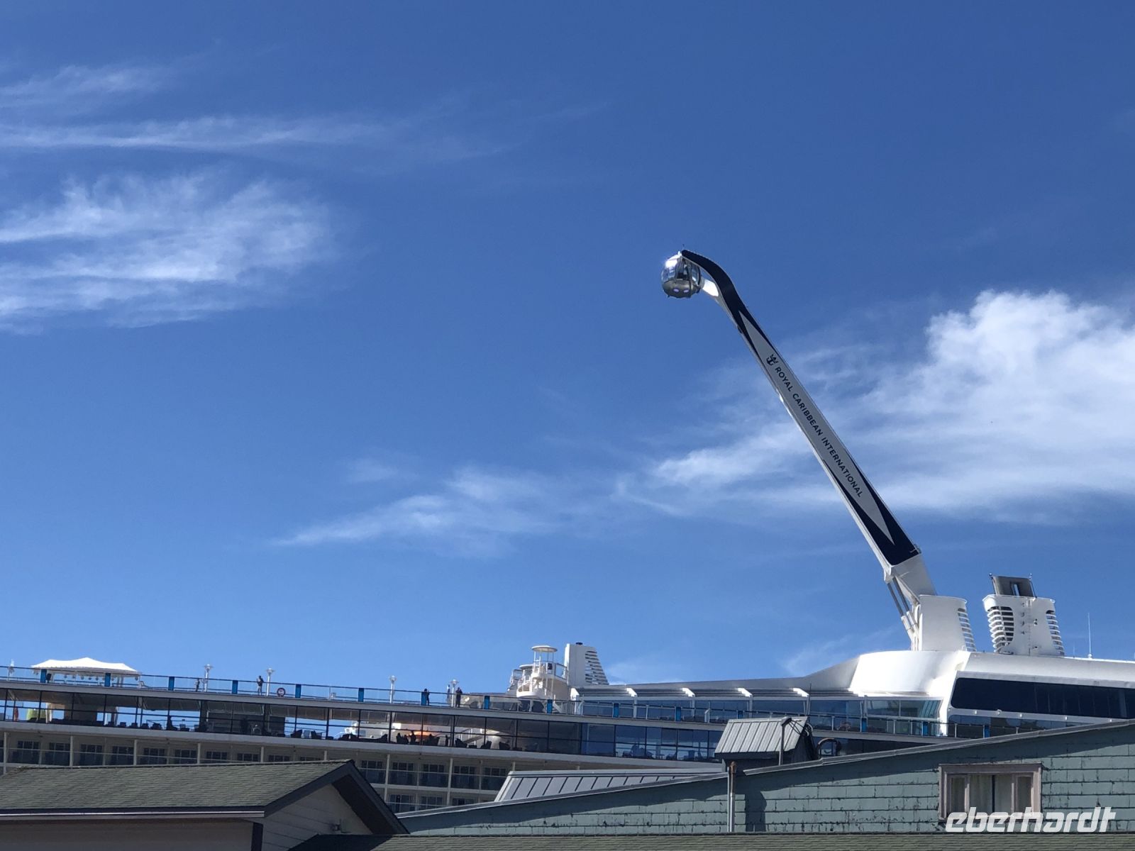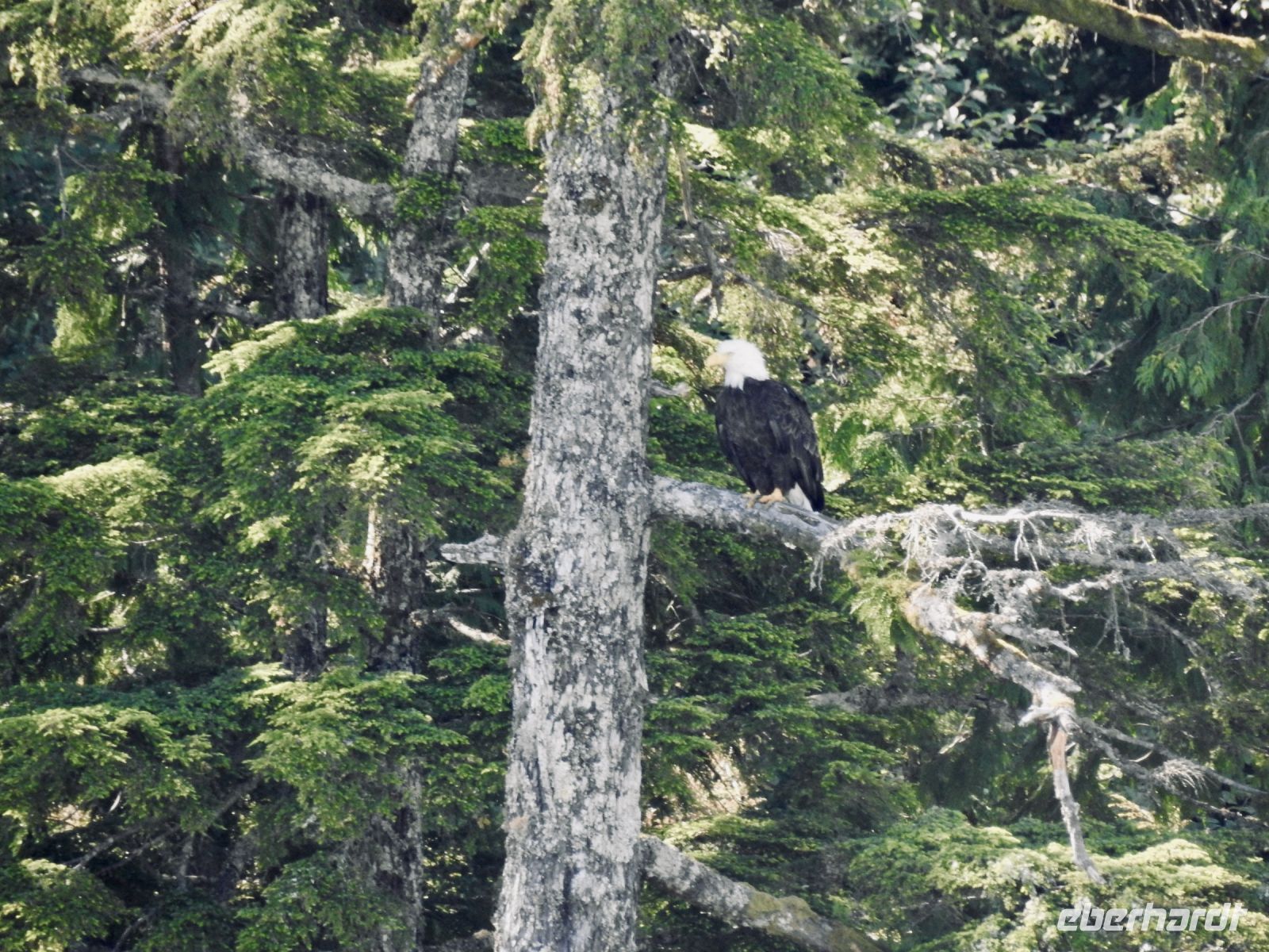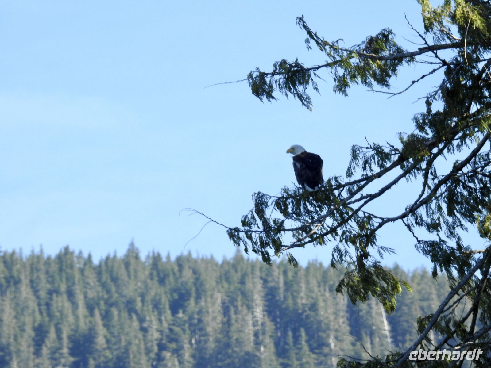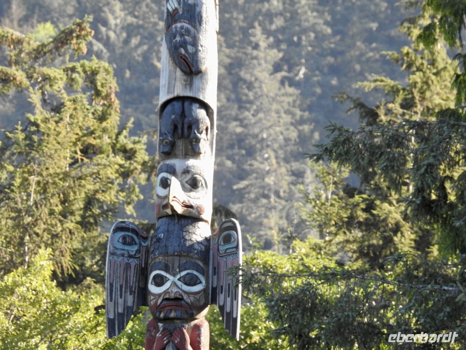 Einiges ist anders als bei vorherigen Kreuzfahrten mit NCL. Zum Beispiel treffen sich die Ausflügler nicht mehr an Bord, sondern an Land. Erstaunlicherweise geht das ruck zuck und wir sind in Kürze von Bord. In Ketchikan führt uns der Weg zunächst in eine riesige Lagerhalle, in der ein (vermutlich temporärer) Markt aufgebaut ist, um die gutbetuchten Kreuzfahrer zum Kauf zu verführen. Alles, was das Touristenherz begehrt oder auch nicht, ist im Angebot. Bald schon finden wir den Startpunkt unseres Ausflugs und bekommen jeder einen Aufkleber, an dem zu erkennen ist, zu welcher Gruppe wir gehören. Irgendwann dürfen wir dann losmarschieren, folgen unserem Guide. Der Weg führt durch einen Güterwagon in ein ehemaliges Industriegebiet bis zu einem kleinen Ausflugsboot. Die Tour scheint ausgebucht, alle beliebten Sitzplätze draußen sind schnell besetzt. Dass das keine Rolle spielt, zeigt sich später unterwegs. Wir haben eine Kapitänin, die genau weiß, wo sich die Nester Weißkopfadler befinden. Also sehen wir tatsächlich einen Horst mit Babyadlern, die noch keinen weißen Kopf haben, denn die Federn färben sich erst später von braun auf weiß. Immer wieder tauchen in den Bäumen versteckt, weiße Punkte auf, die wir bald als Weißkopfadler zu identifizieren wissen. Einen kurzen Stopp legen wir in angemessener Entfernung an einem indigenen Dorf ein. Von weitem sind das bemalte Haus und die Totempfähle zu sehen. Letzter Stopp ist der erste hier errichtete Leuchtturm, der inzwischen ein moderner ist und sich auf einem kleinen Inselchen befindet. Unsere Gastgeber verwöhnen uns mit einem Imbiss und Getränken und bald darauf sind wir zurück am Schiff.