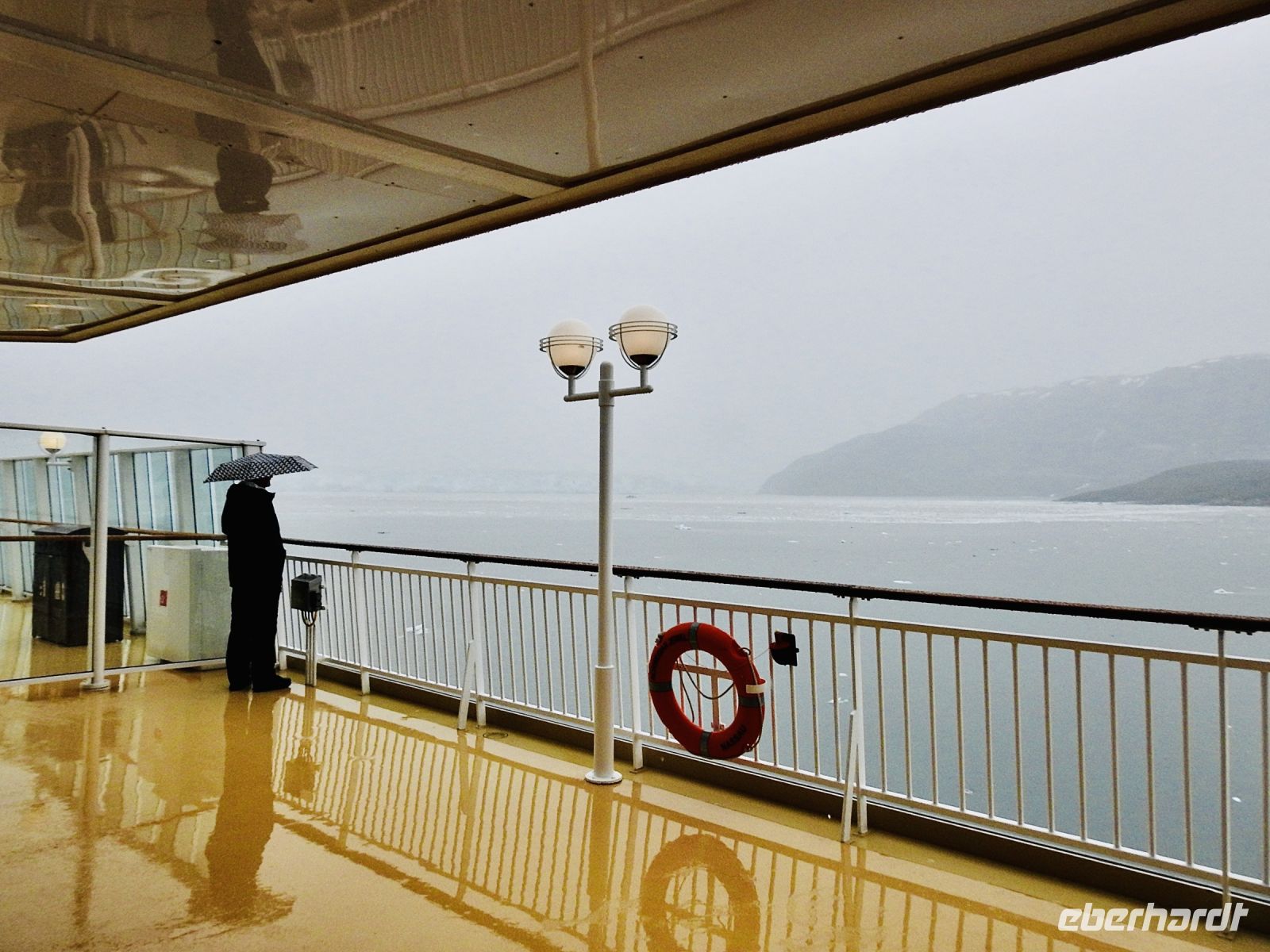 Dass der Hubbard-Gletscher einer der aktivsten in Alaska ist, können wir zwar nicht sehen, aber immerhin hören. Gegen 9.15 Uhr steht die Norwegian Jewel direkt vor diesem Gletschermassiv. Anfangs ist es ziemlich neblig, aber unser Kapitän hat Geduld und hält das Schiff fast eine Stunde am Gletscher auf. Als wir wegfahren, wird die Sicht immer besser. Sogar ein paar Bergspitzen sind zu sehen.