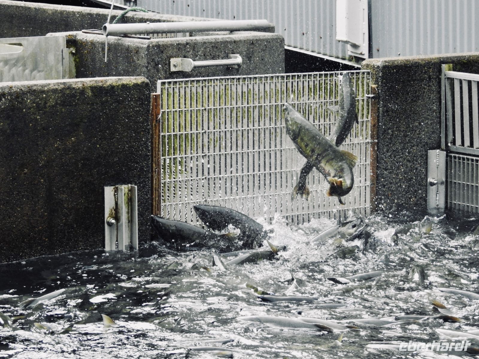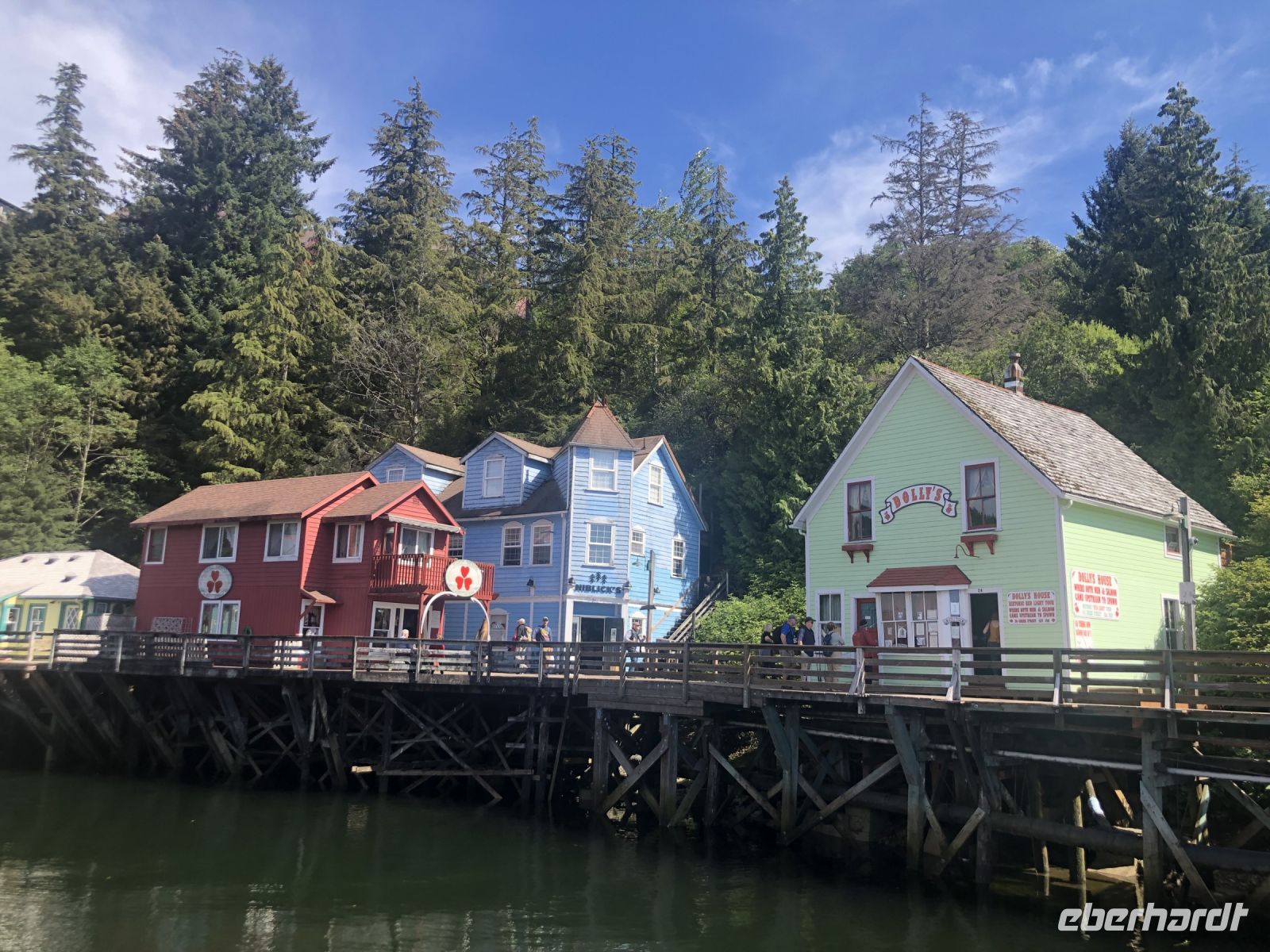 Nun bleibt Zeit, Ketchikan Downtown zu erkunden. Zwei riesige Kreuzfahrtschiffe (Quantum of the See und …) liegen heute hier im Hafen, deshalb musste unsere Norwegian Jewel sieben Meilen außerhalb der Stadt anlegen. Ein regelmäßiger Shuttlebusservice ist eingerichtet. Ketchikan zeigt sich zunächst nicht gerade verkehrsberuhigt, laut und quirlig. Bis wir dann abbiegen und ins historische Zentrum kommen. In der Creek Street reihen sich bunte Holzhäuser aneinander rund um einen kleinen Fluss. In dem Flüsschen tummeln sich Lachse und eine Robbe ist dabei, sich ihr Mittagessen zu holen. Eines der bunten Häuser gehörte einst Dolly, die hier ihrem Gewebe nach ging. Heute haben die nachfolgenden Damen das Haus in ein Museum umgewandelt und verdienen so ihr Geld. Für zehn Dollar darf man sich Dollys Haus ansehen und den Geschichten einer ihrer Nachfolgerinnen lauschen. Auch eine Dame namens Beatrice Green, an die in der Creek Street ein Schild erinnert, war hier aktiv. 1954 wurde Prostitution verboten und viele Ladys verließen Ketchikan, nicht aber Beatrice. Sie lieferte sich in den folgenden Jahren ein Katz und Maus Spiel mit der Polizei und ging im Untergrund ihrem Gewerbe nach. Sie gilt als letzte arbeitende Frau dieser Straße. Weitere historische Gebäude sind das Star House und Annie‘s Place. Alle zeugen von der lebhaften Vergangenheit dieses Viertels. Wir spazieren zurück zum Schiff und vertreiben uns die Zeit bis zum Abendessen mit dem Ausspähen von Weißkopfadlern in den Bäumen gegenüber vom Schiff.