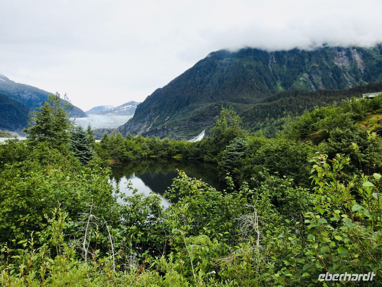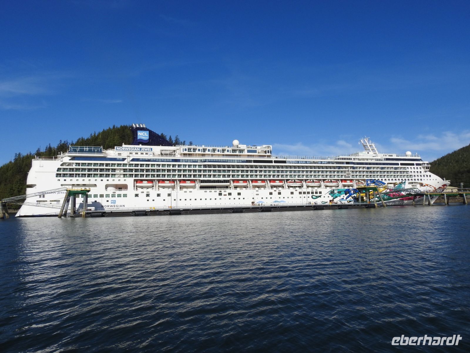 Wieder sind wir zu früh. Das Ausschiffen geht so schnell, dass wir bereits 8.30 Uhr am Treffpunkt sind. Brett, unser Busfahrer, kommt pünktlich um neun. Zu unserer großen Überraschung spricht er deutsch und übernimmt auch gleich und ungeplant, die Reiseleitung. Zum Mendenhall-Gletscher fahren wir eine knappe halbe Stunde über die einzige Autobahn der Stadt. Brett unterhält uns inzwischen mit Informationen rund um Juneau. Am Mendenhall Gletscher setzt er uns ab und fast alle nehmen den Wanderweg zum Wasserfall, wo besonders schöne Fotos vom Gletscher gelingen. Es folgt eine Stippvisite im Besucherzentrum und ein Spaziergang zum Lachsfluss. Hier können wir von oben auf den Fluss schauen und beobachten, wie die Lachse versuchen flussaufwärts zu schwimmen. In der Lachsaufzuchtsstation, die wir anschließend besuchen, können wir noch einmal erstaunt zur Kenntnis nehmen, wie hoch die Lachse springen können. In der Nähe der künstlich angelegten Lachstreppe tummeln sich Robben auf der Suche nach Futter. Des Weiteren sind einige Becken mit jungen Lachsen zu sehen, die hier an ihren Ursprungsort gewöhnt werden, damit sie nach einem freien Leben im Meer hierher zurückkehren. In einem großen Aquarium herrscht reges Leben. Flundern und Krabben sind aktiv und erfreuen uns mit ihrem Anblick. Keine Frage, dass man hier auch reichlich Souvenirs kaufen kann. Brett bringt uns zur Bodenstation der Seilbahn. Wir fahren auf den Mount Roberts. Pflichtprogramm ist hier der Gang durch den Souvenirshop, anders kommt man nicht zum Wanderweg. Einzige Höhepunkte sind der am Auge verletzte Adler und das Brett, an dem jeder messen kann, welchem Vogel seine Armspannweite entspricht. Wer aktiv unterwegs ist, kann natürlich auch einen Waldspaziergang unternehmen. Außerdem haben wir einen tollen Blick von oben auf unsere Norwegian Jewel. Die nun zur Verfügung stehende Freizeit wird unterschiedlich genutzt. Einige Gäste haben sich einen weiteren Ausflug gebucht und nehmen am Whalewatching teil, andere gehen Lachs essen und wir kehren im Saloon Roter Hund ein. Ratzifatzi fühlen wir uns rückversetzt in die Zeit des Goldrausches. Der Boden des Saloons ist mit Sägespänen ausgefüllt, so wie man es sich in Westernzeiten vorstellt, die Bedienung trägt hübsche Kleider aus der Mitte des 19. Jahrhunderts. Am Keybord sitzt ein alter Mann, der mit seinen Liedern und Scherzen das Publikum unterhält. Pizza, Baguette und Chips mit Dipp sorgen dafür, dass wir auf dem Schiff kein Abendessen mehr brauchen.