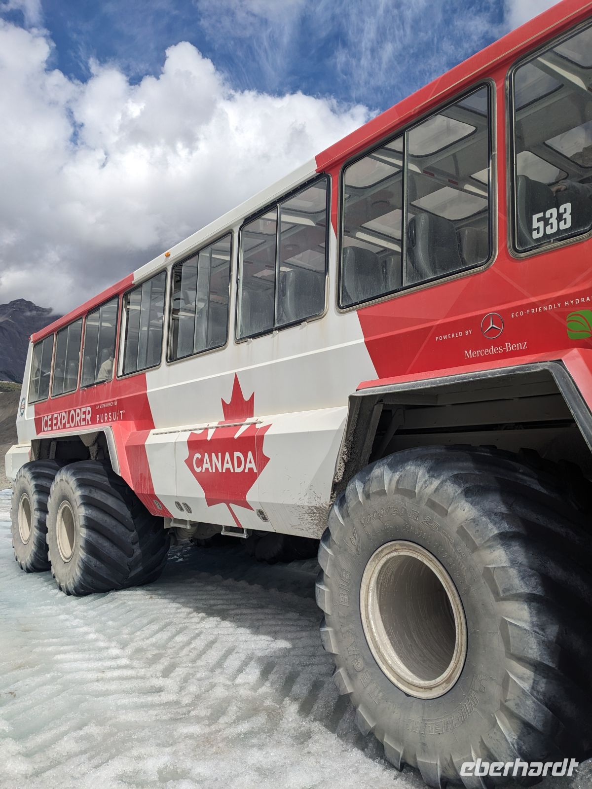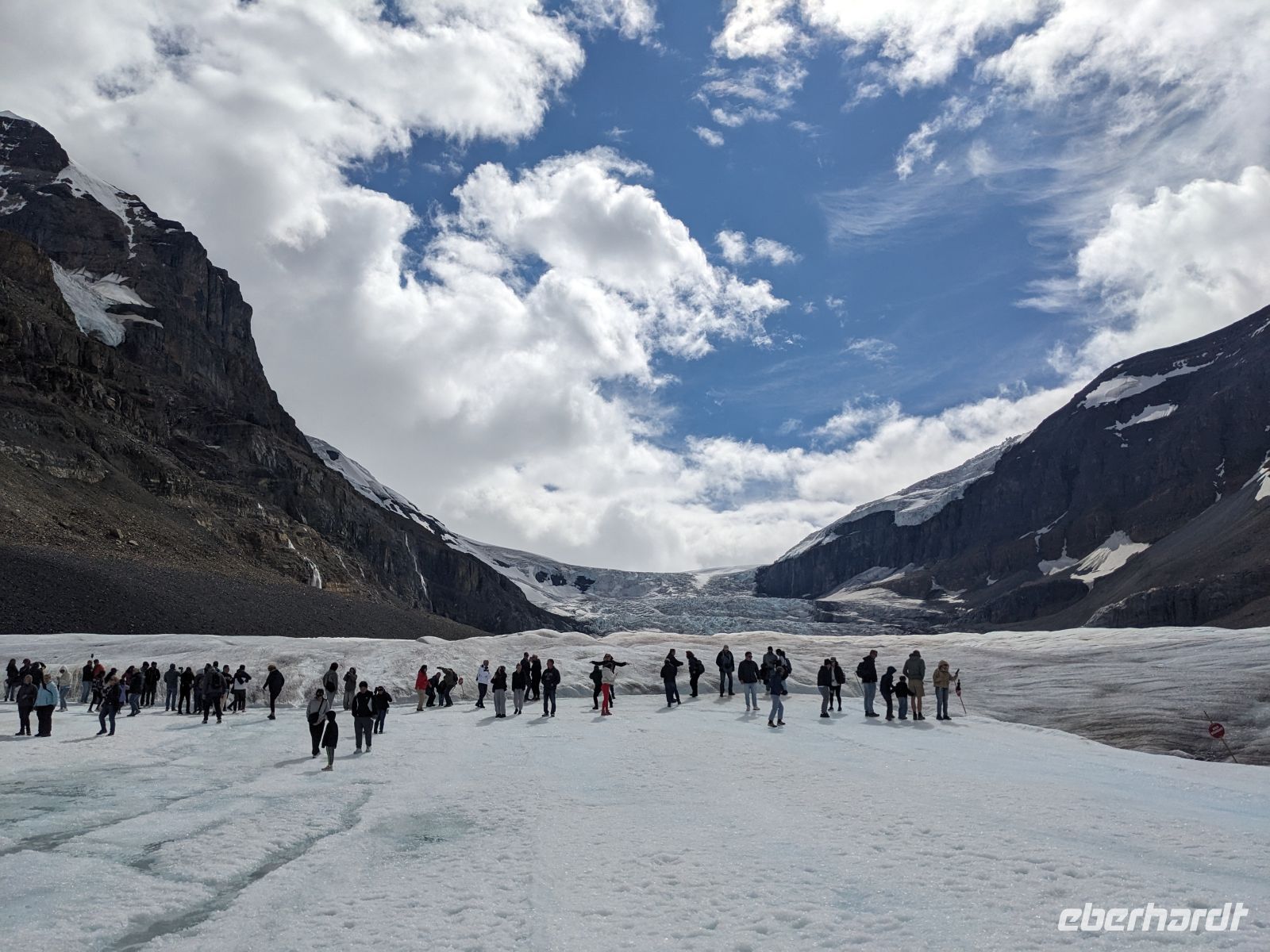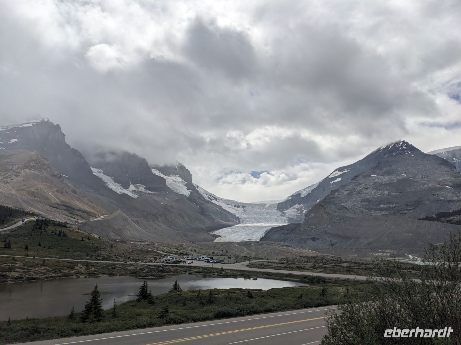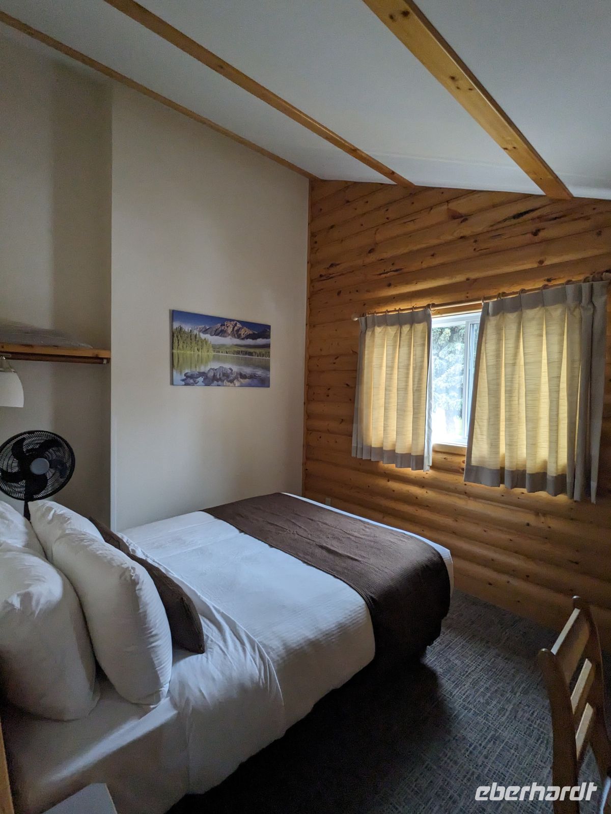 Beim Parkplatz unten an der Straße versuchten wir einen Blick auf den noch verhangenen Castle Mountain zu erhaschen, doch relativ zügig fuhren wir weiter zum Lake Louise. Hier war noch verhältnismäßig wenig los und wir konnten den weltbekannten See mit dem danebenliegenden Fairmont Hotel bestaunen, bevor unsere Fahrt weiterging zum Lake Moraine. Vom sogenannten Rockpile Trail hatte man eine tolle Sicht auf den blau strahlenden See. In der Ortschaft von Lake Louise legten wir eine kleine Mittagspause ein. Anschließend führte uns unsere Rundreise weiter zur Aussichtsplattform des Peyto Lakes mit einem fantastischen Blick auf den im Tal liegenden See und den dazugehörigen Gletscher. Bei unserem Ausflug auf den Athabasca-Gletscher mit einem Ice Explorer Fahrzeug und unserem australischen Fahrer Wyatt erlebten wir das Schmelzen dieses durch das Columbia Icefield gefütterten Gletschers hautnah. Bei einer Lebenserwartung von weiteren 50-80 Jahren werden nicht mehr viele Menschen dieselbe Erfahrung wie wir machen können. Letzter Tagestopp waren schließlich die eindrucksvollen Athabasca Falls, bei denen man die Möglichkeit hatte, relativ nah und vor allem von oben die Wassermassen herabstürzen zu sehen. Nach einem langen Tag vieler Eindrücke kehrten wir schließlich in unsere Unterkunft, das Becker`s Chalet im brandgeplagten Jasper ein. Dort erwarteten uns gemütliche Holzhäuser und ein einladendes Restaurant zum Abendessen.