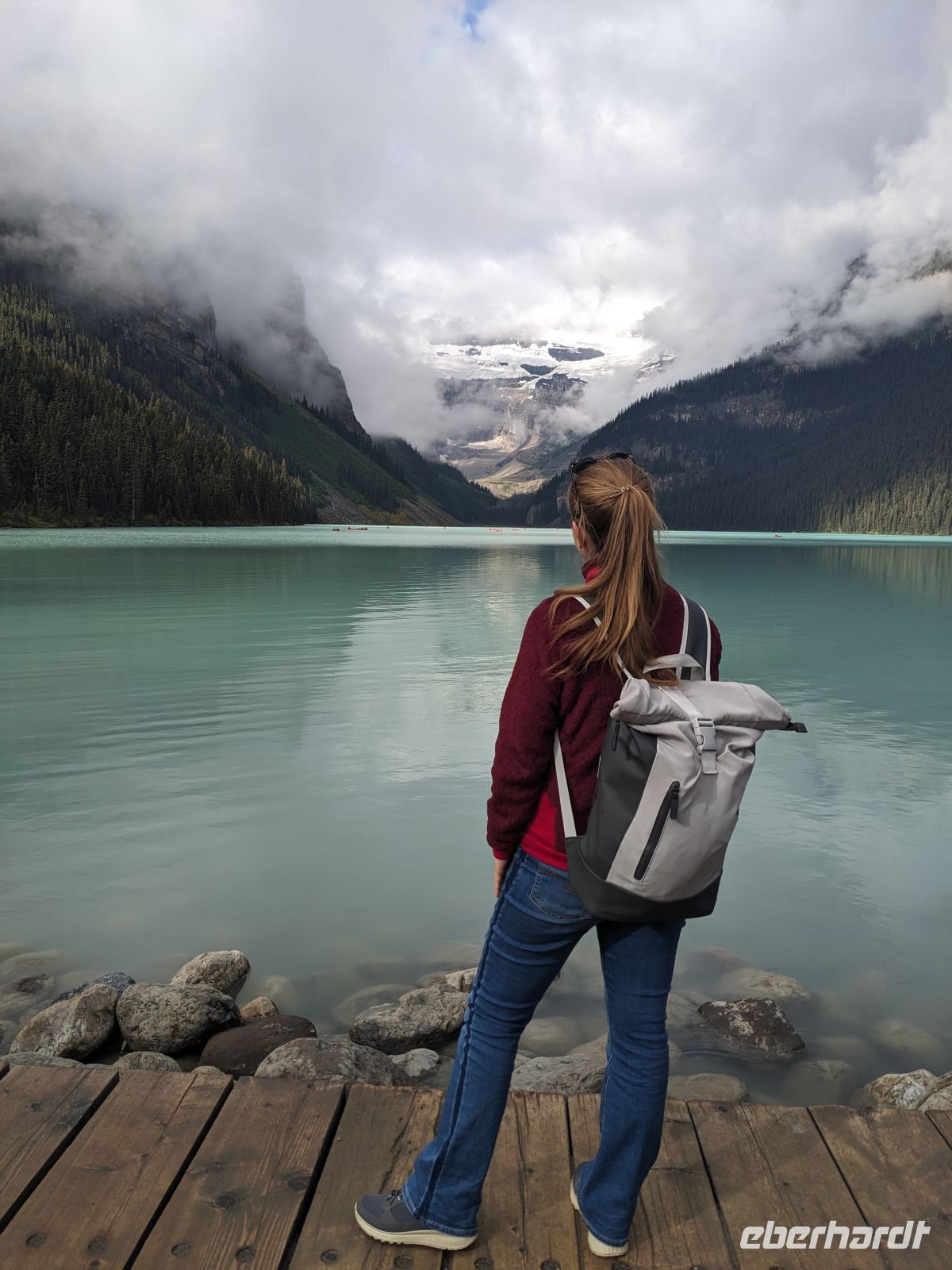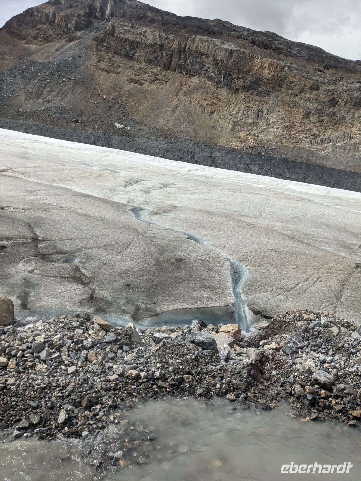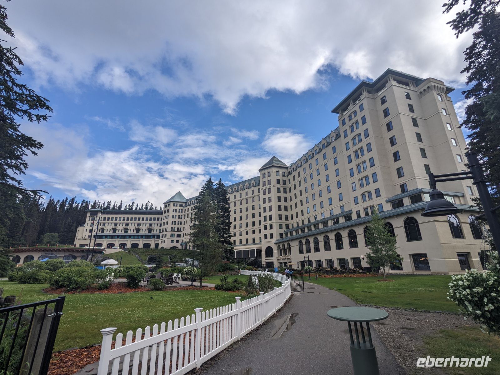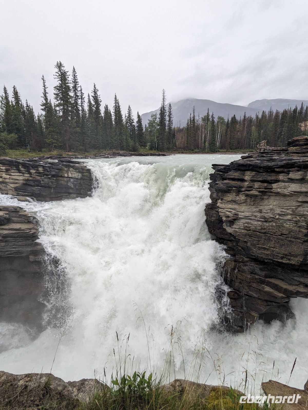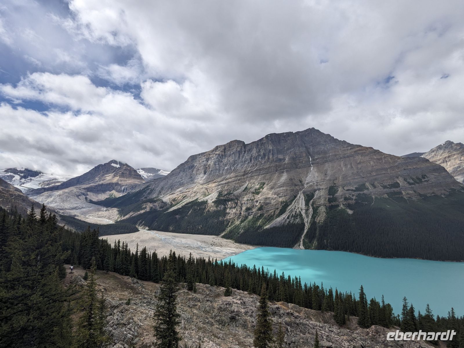 Beim Parkplatz unten an der Straße versuchten wir einen Blick auf den noch verhangenen Castle Mountain zu erhaschen, doch relativ zügig fuhren wir weiter zum Lake Louise. Hier war noch verhältnismäßig wenig los und wir konnten den weltbekannten See mit dem danebenliegenden Fairmont Hotel bestaunen, bevor unsere Fahrt weiterging zum Lake Moraine. Vom sogenannten Rockpile Trail hatte man eine tolle Sicht auf den blau strahlenden See. In der Ortschaft von Lake Louise legten wir eine kleine Mittagspause ein. Anschließend führte uns unsere Rundreise weiter zur Aussichtsplattform des Peyto Lakes mit einem fantastischen Blick auf den im Tal liegenden See und den dazugehörigen Gletscher. Bei unserem Ausflug auf den Athabasca-Gletscher mit einem Ice Explorer Fahrzeug und unserem australischen Fahrer Wyatt erlebten wir das Schmelzen dieses durch das Columbia Icefield gefütterten Gletschers hautnah. Bei einer Lebenserwartung von weiteren 50-80 Jahren werden nicht mehr viele Menschen dieselbe Erfahrung wie wir machen können. Letzter Tagestopp waren schließlich die eindrucksvollen Athabasca Falls, bei denen man die Möglichkeit hatte, relativ nah und vor allem von oben die Wassermassen herabstürzen zu sehen. Nach einem langen Tag vieler Eindrücke kehrten wir schließlich in unsere Unterkunft, das Becker`s Chalet im brandgeplagten Jasper ein. Dort erwarteten uns gemütliche Holzhäuser und ein einladendes Restaurant zum Abendessen.