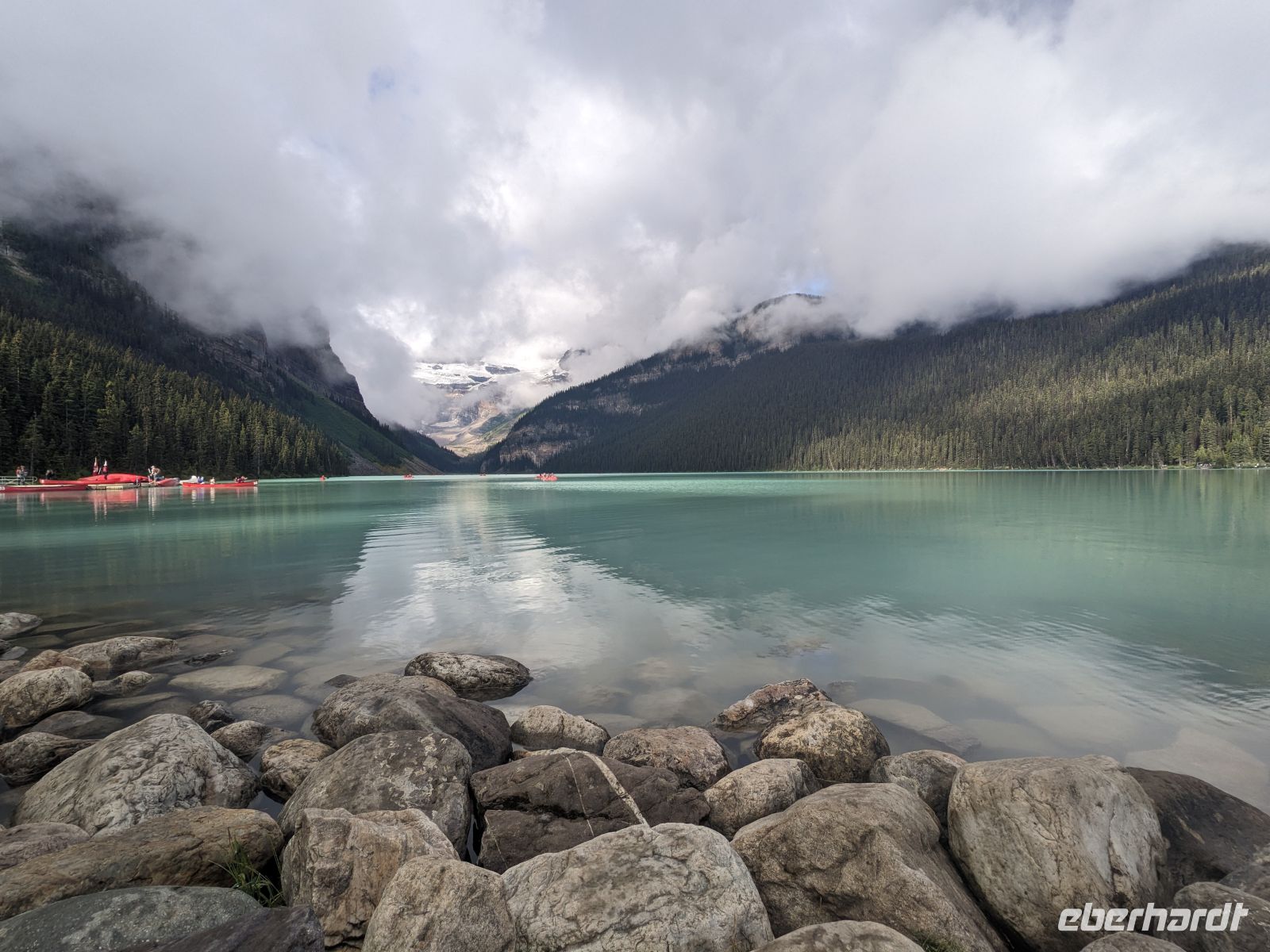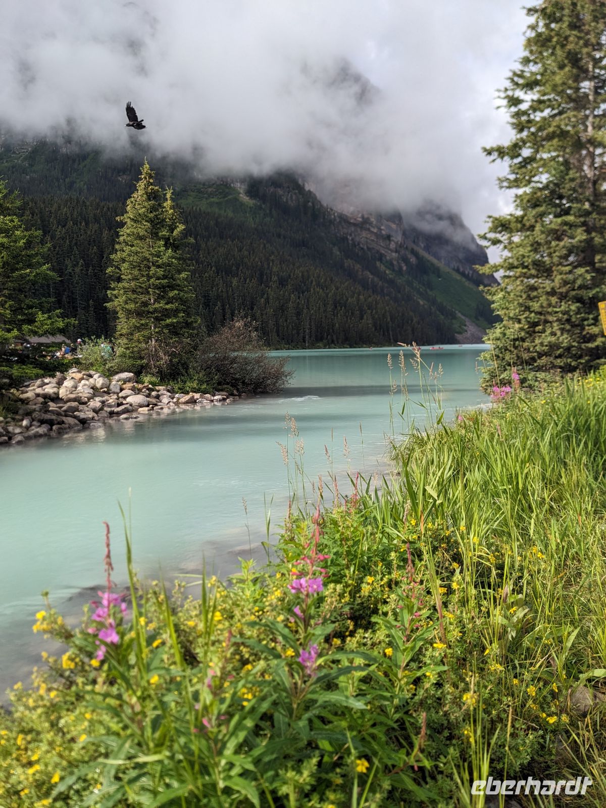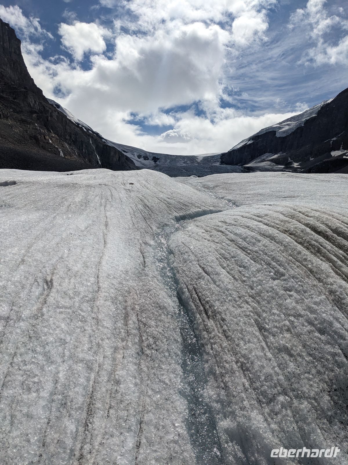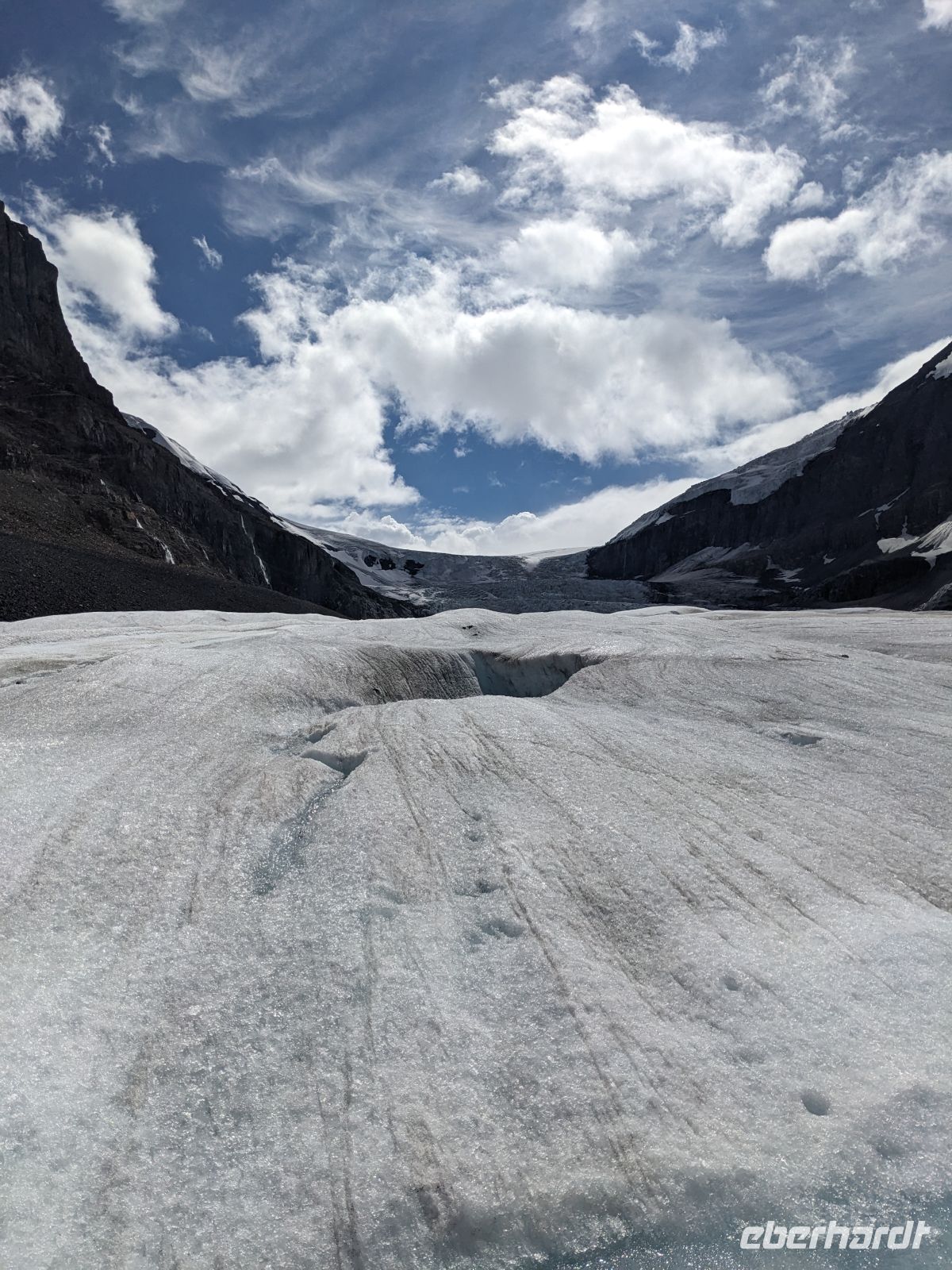 Beim Parkplatz unten an der Straße versuchten wir einen Blick auf den noch verhangenen Castle Mountain zu erhaschen, doch relativ zügig fuhren wir weiter zum Lake Louise. Hier war noch verhältnismäßig wenig los und wir konnten den weltbekannten See mit dem danebenliegenden Fairmont Hotel bestaunen, bevor unsere Fahrt weiterging zum Lake Moraine. Vom sogenannten Rockpile Trail hatte man eine tolle Sicht auf den blau strahlenden See. In der Ortschaft von Lake Louise legten wir eine kleine Mittagspause ein. Anschließend führte uns unsere Rundreise weiter zur Aussichtsplattform des Peyto Lakes mit einem fantastischen Blick auf den im Tal liegenden See und den dazugehörigen Gletscher. Bei unserem Ausflug auf den Athabasca-Gletscher mit einem Ice Explorer Fahrzeug und unserem australischen Fahrer Wyatt erlebten wir das Schmelzen dieses durch das Columbia Icefield gefütterten Gletschers hautnah. Bei einer Lebenserwartung von weiteren 50-80 Jahren werden nicht mehr viele Menschen dieselbe Erfahrung wie wir machen können. Letzter Tagestopp waren schließlich die eindrucksvollen Athabasca Falls, bei denen man die Möglichkeit hatte, relativ nah und vor allem von oben die Wassermassen herabstürzen zu sehen. Nach einem langen Tag vieler Eindrücke kehrten wir schließlich in unsere Unterkunft, das Becker`s Chalet im brandgeplagten Jasper ein. Dort erwarteten uns gemütliche Holzhäuser und ein einladendes Restaurant zum Abendessen.