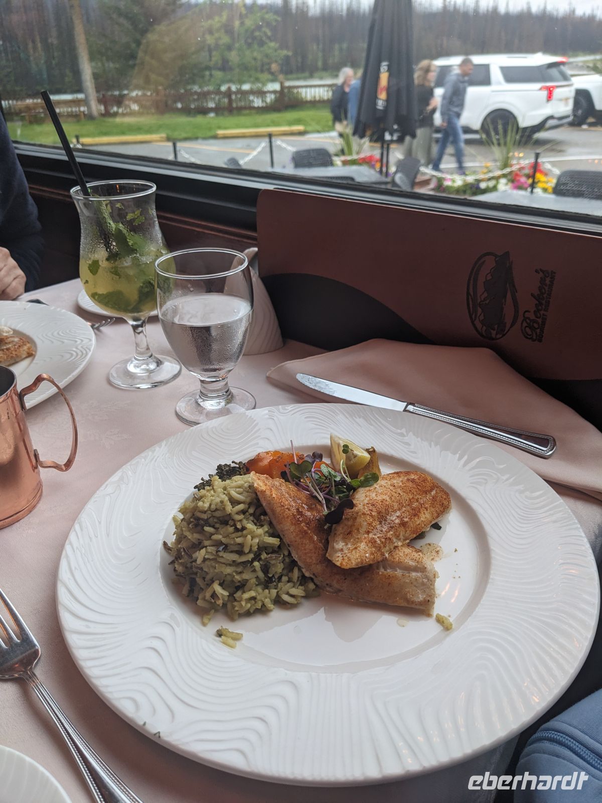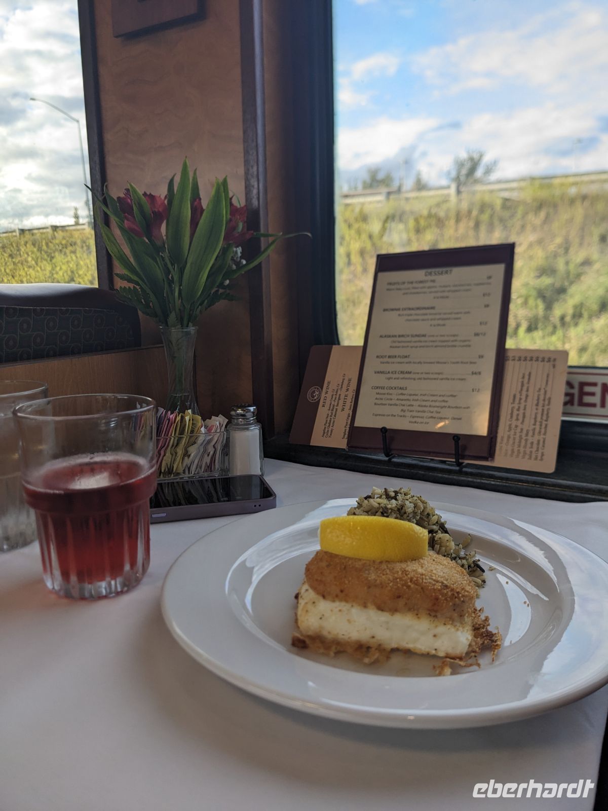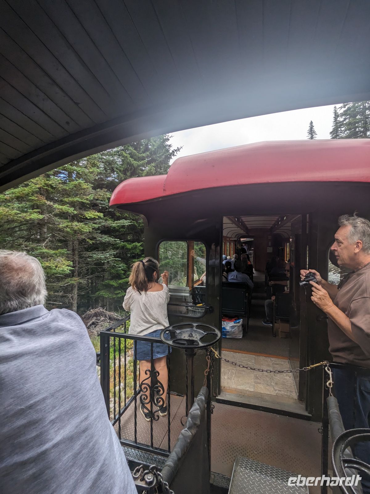 Das Mittag- und Abendessen wurde stilecht im Speisewagen serviert – regionale Spezialitäten, begleitet von der Aussicht, die man sonst nur von Postkarten kennt. Wer mochte, konnte zwischendurch auf die Aussichtsplattform treten und den Fahrtwind spüren.