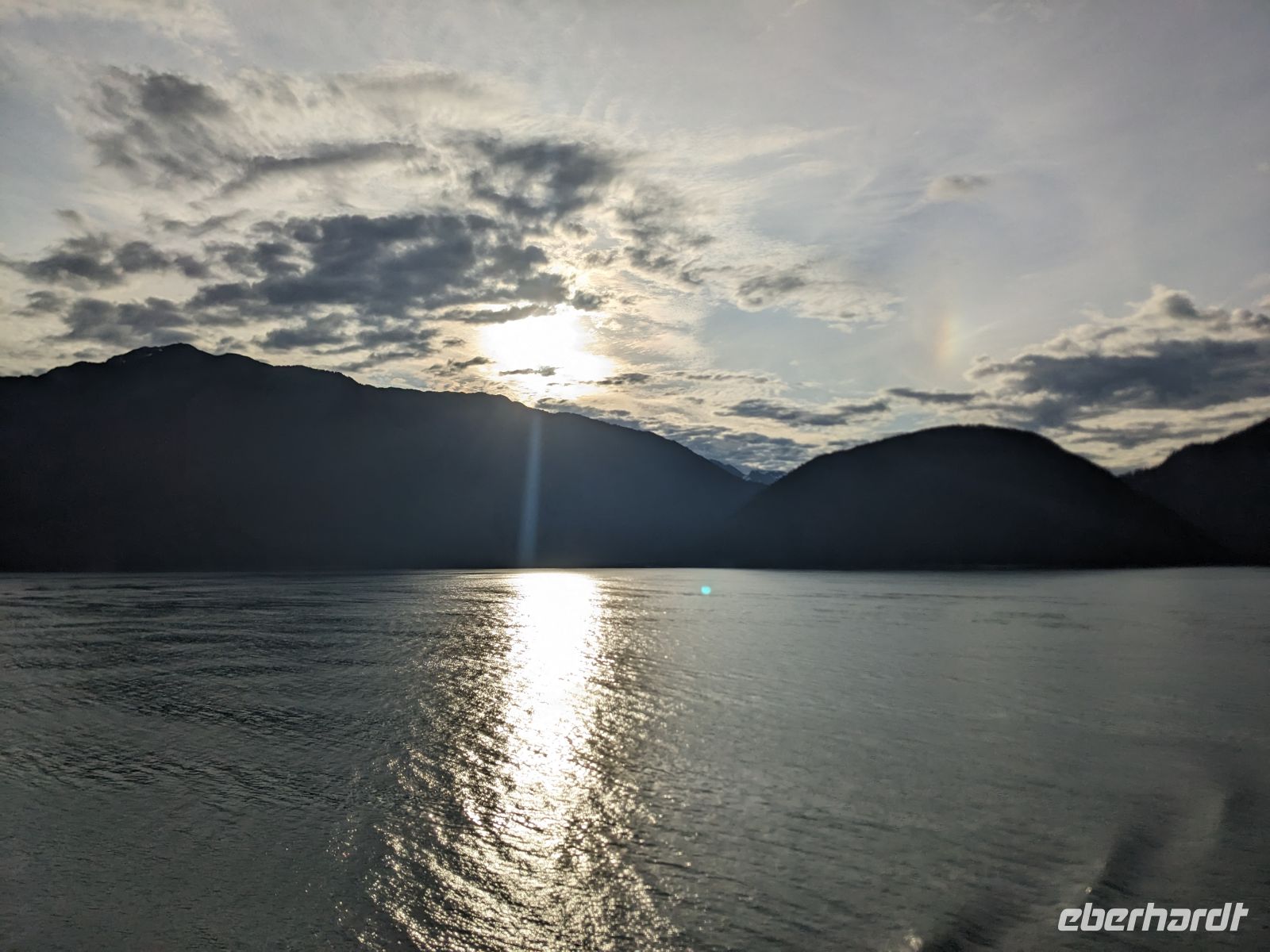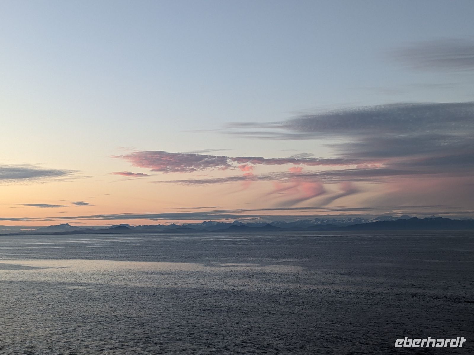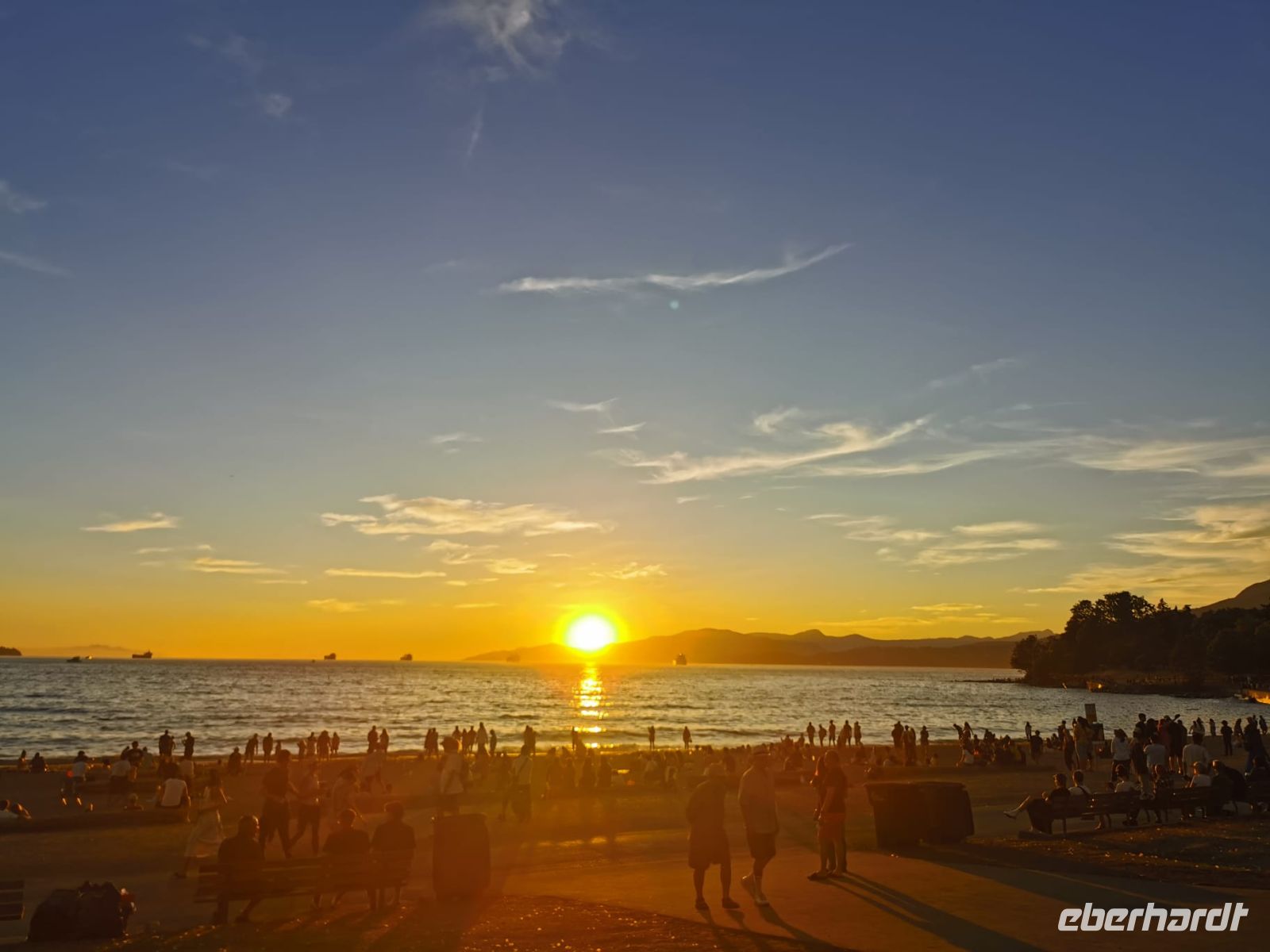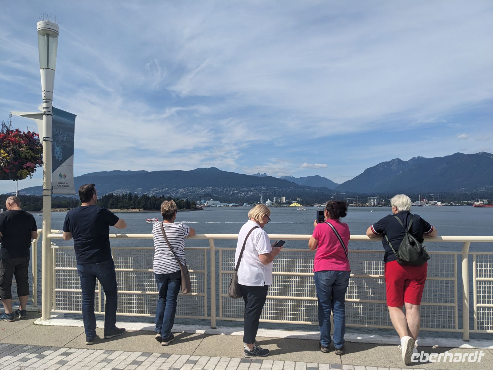 Nach einem frühen Frühstück machten wir uns auf den Weg Richtung Vancouver. Die Fahrt führte uns zunächst durch hügelige Landschaften und kleine Orte, bevor wir nach einem Stopp in Hope für eine Mittagspause die letzten Kilometer entlang beeindruckender Bergketten zurücklegten. Gegen Nachmittag erreichten wir die Metropole am Pazifik. Unser erster Halt: Gastown, das historische Herz der Stadt, wo wir die berühmte Steam Clock pünktlich zur vollen Stunde erlebten. Anschließend flanierten wir entlang der Waterfront bis zum Canada Place, genossen den Blick auf den Hafen und die Berglandschaft in der Ferne. Ein Highlight war der Stanley Park, wo wir entlang des Seawalls spazierten – immer begleitet von der frischen Meeresbrise und Blicken auf die Skyline. Am späten Nachmittag bzw. frühen Abend stießen dann unsere neugewonnenen Gruppenmitglieder dazu, die nur den Kreuzfahrt - und Alaska - Teil begleiten sollten. Wir kehrten in ein Restaurant an der English Bay ein, wo wir uns erstmal alle untereinander kennenlernten und durch die großen Fenster einen traumhaften Sonnenuntergang erleben durften.