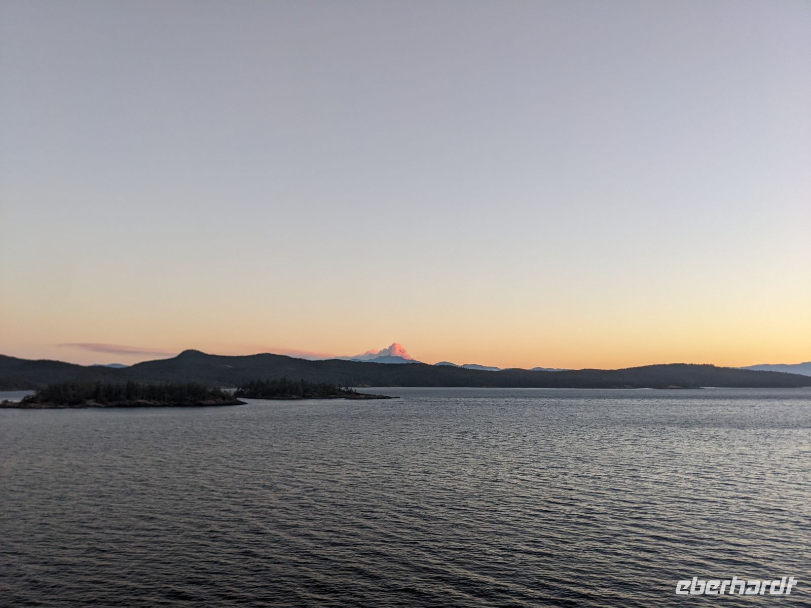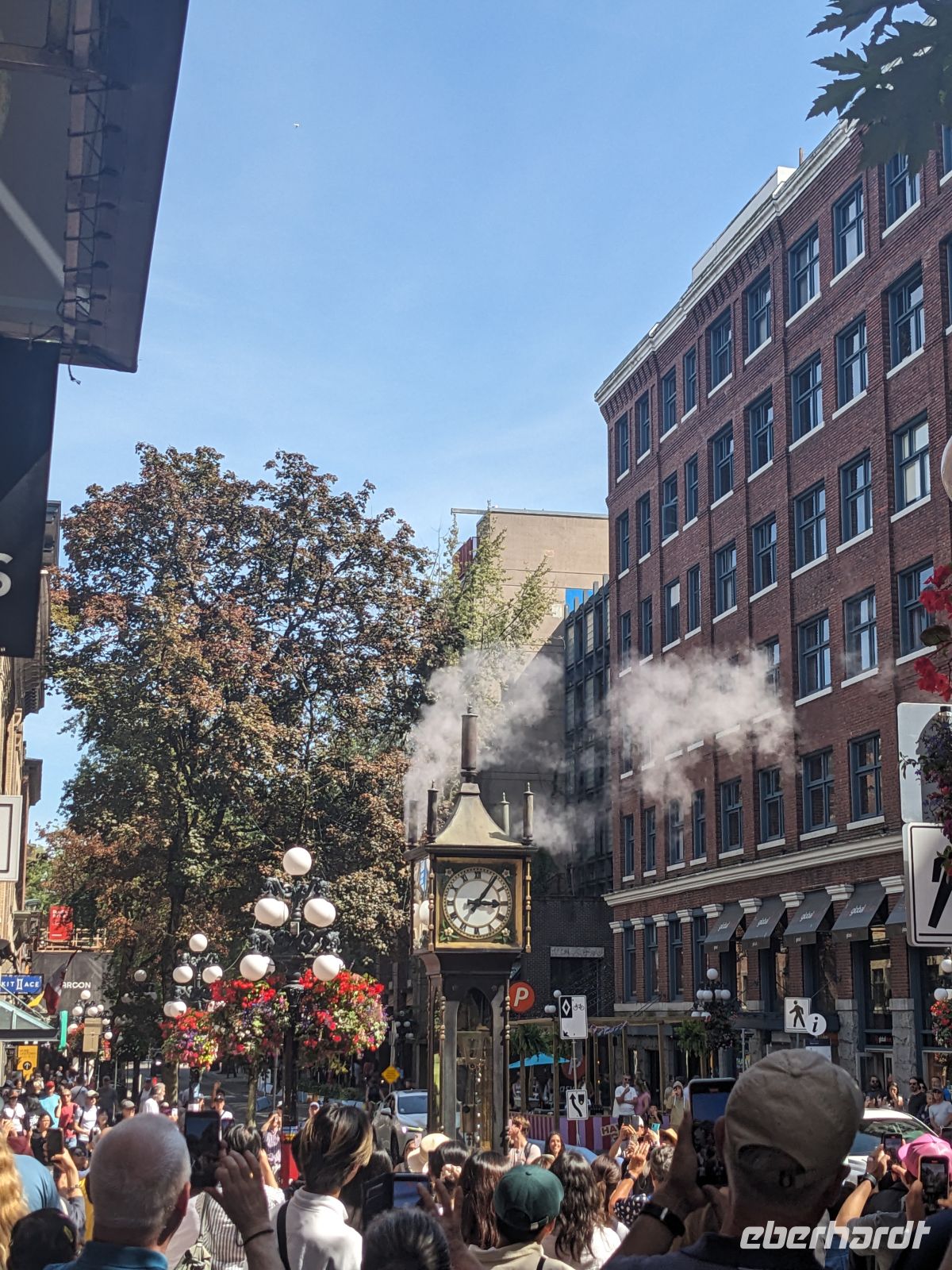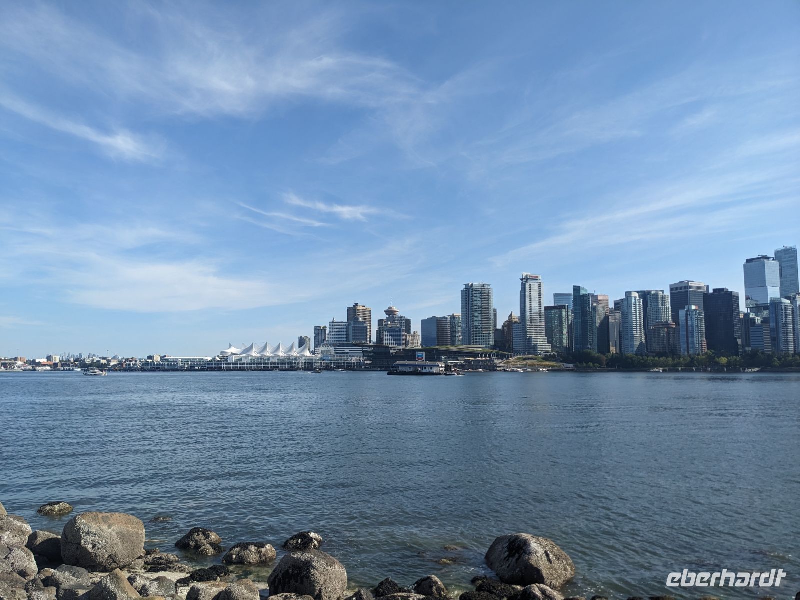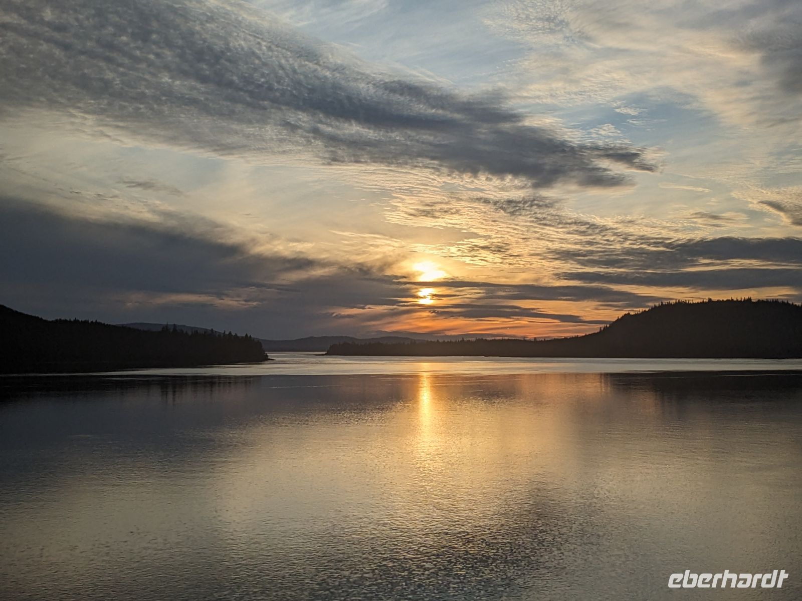 Nach einem frühen Frühstück machten wir uns auf den Weg Richtung Vancouver. Die Fahrt führte uns zunächst durch hügelige Landschaften und kleine Orte, bevor wir nach einem Stopp in Hope für eine Mittagspause die letzten Kilometer entlang beeindruckender Bergketten zurücklegten. Gegen Nachmittag erreichten wir die Metropole am Pazifik. Unser erster Halt: Gastown, das historische Herz der Stadt, wo wir die berühmte Steam Clock pünktlich zur vollen Stunde erlebten. Anschließend flanierten wir entlang der Waterfront bis zum Canada Place, genossen den Blick auf den Hafen und die Berglandschaft in der Ferne. Ein Highlight war der Stanley Park, wo wir entlang des Seawalls spazierten – immer begleitet von der frischen Meeresbrise und Blicken auf die Skyline. Am späten Nachmittag bzw. frühen Abend stießen dann unsere neugewonnenen Gruppenmitglieder dazu, die nur den Kreuzfahrt - und Alaska - Teil begleiten sollten. Wir kehrten in ein Restaurant an der English Bay ein, wo wir uns erstmal alle untereinander kennenlernten und durch die großen Fenster einen traumhaften Sonnenuntergang erleben durften.