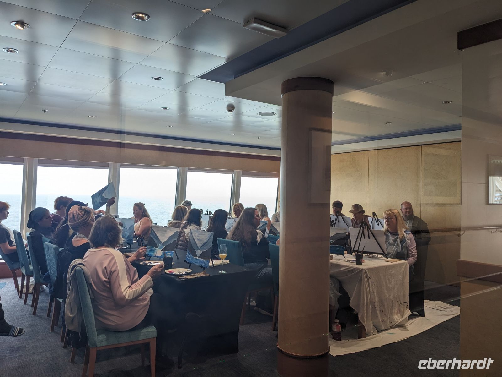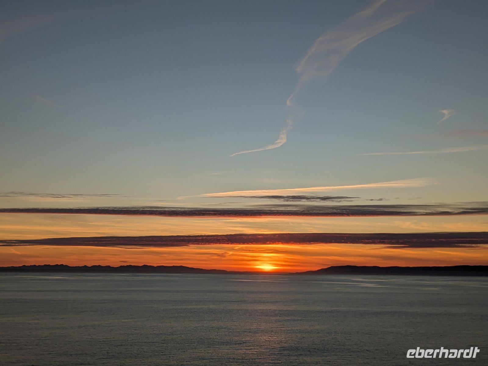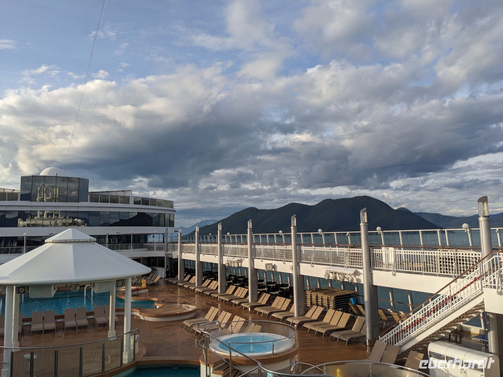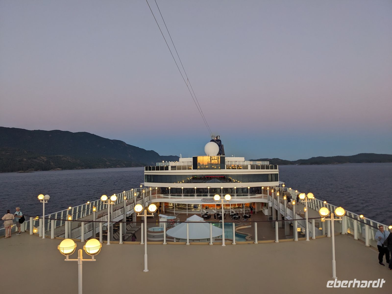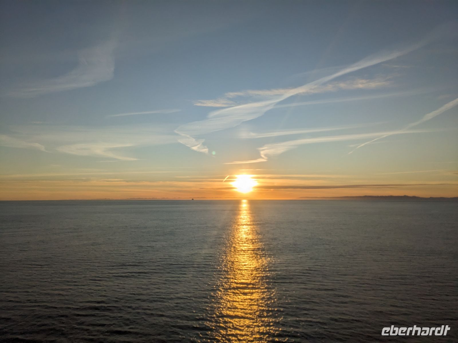 Der heutige Tag stand ganz im Zeichen der Erholung. Bei ruhiger See ließen wir uns den frischen Wind um die Nase wehen, genossen Spaziergänge an Deck und die zahlreichen Bordangebote. Wer mochte, nahm an meiner Schiffsführung teil, entspannte in den Lounges und Bars mit Blick auf den Ozean oder unternahm mit mir einige Speedwalking-Runden auf Deck, um sich die Füße zu vertreten. Der Sonnenuntergang an diesem Abend war spektakulär und tauchte Himmel und Meer in warme Orangetöne.