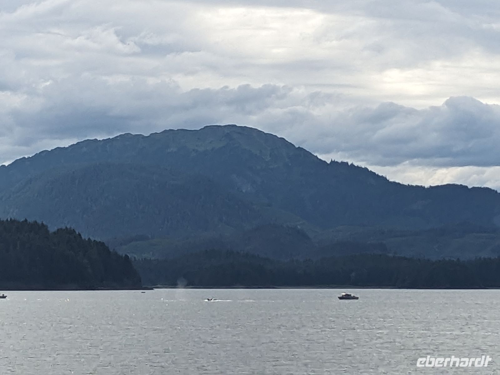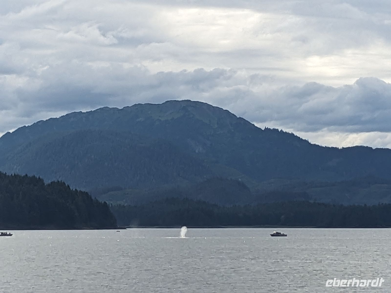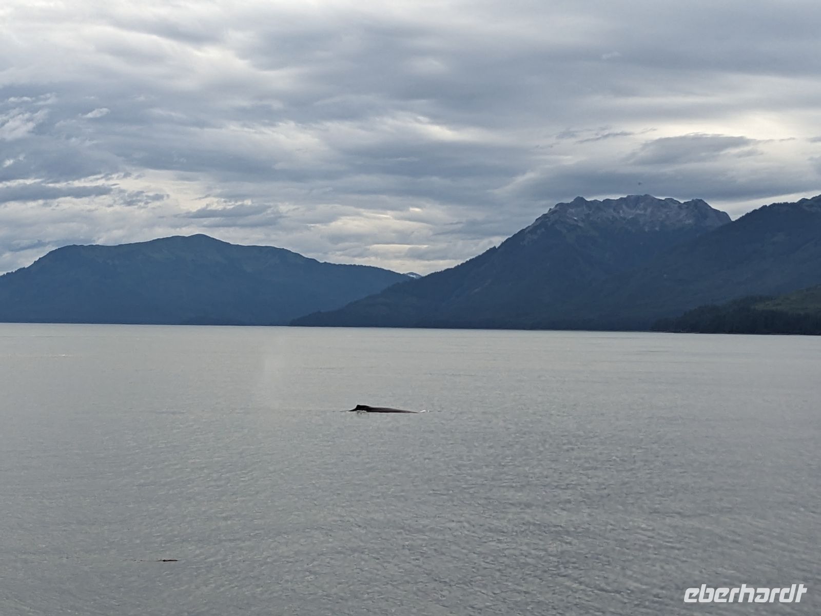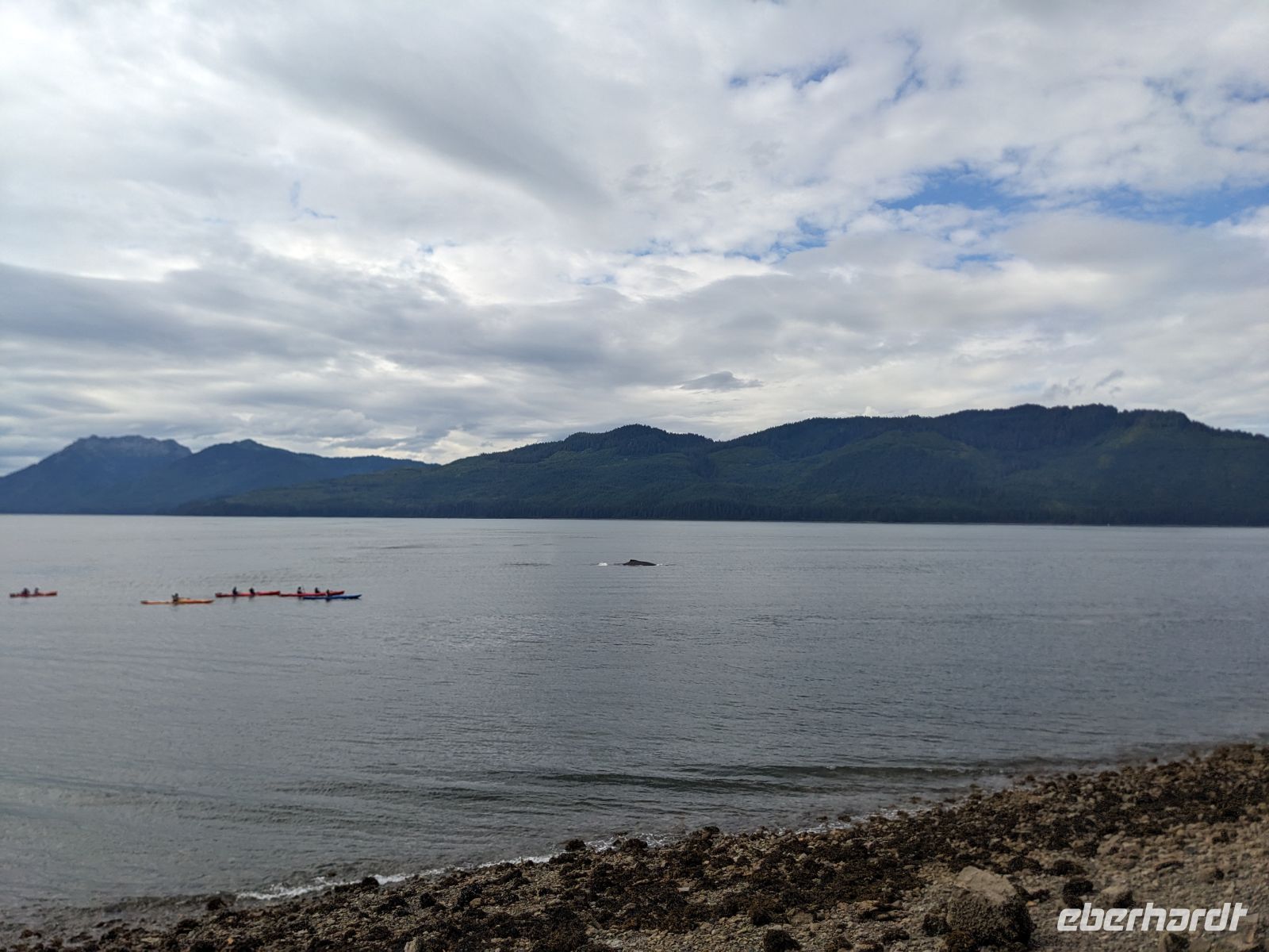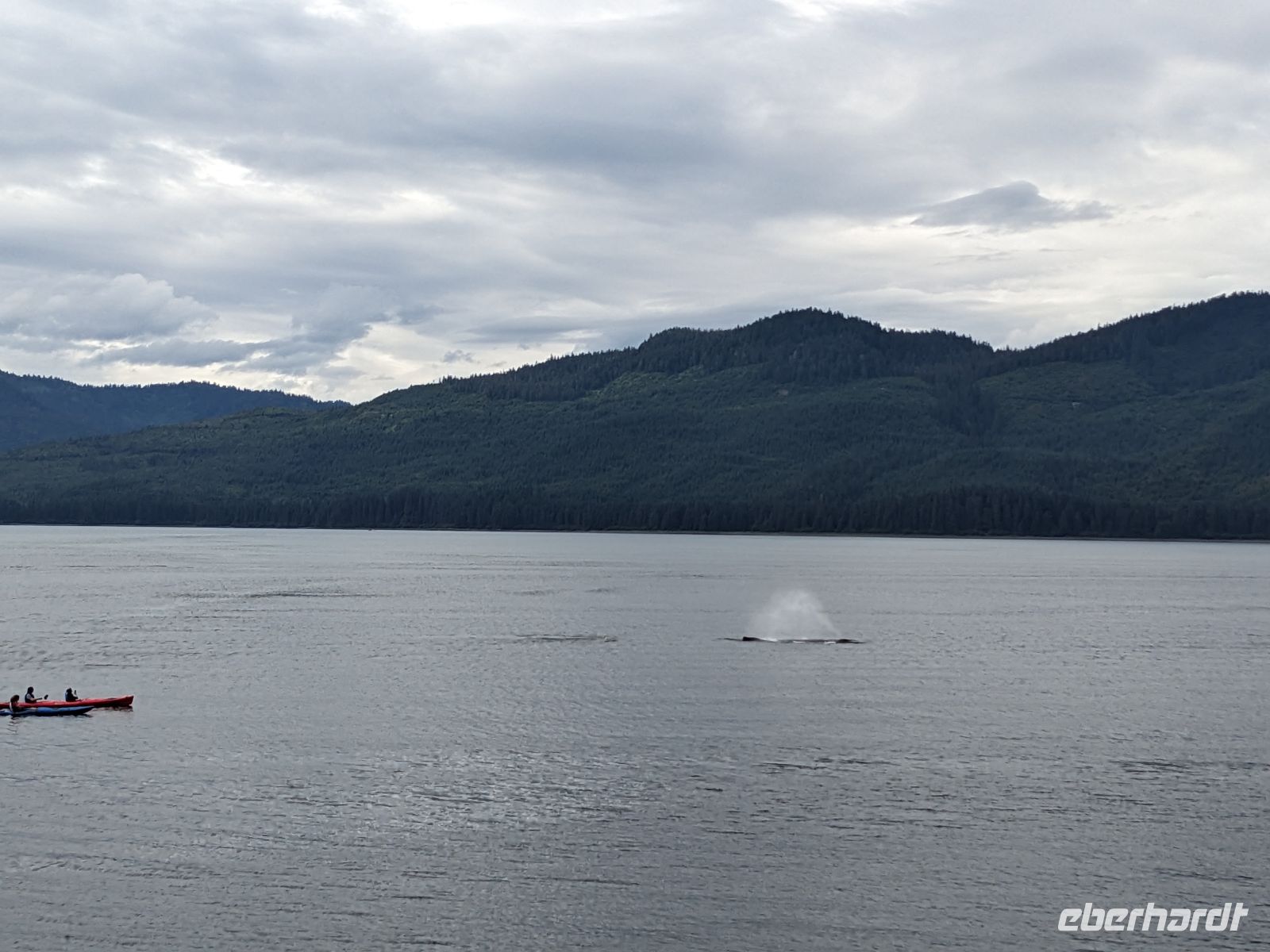 Der Großteil der Gruppe hatte für diesen Tag allerdings ein ganz besonderes Erlebnis gebucht: Walbeobachtungen per Boot. Es waren auch einige Tiere zu sehen gewesen - die sanften Riesen lassen sich durch ihre Fontäne ausfindig machen und zeigten sogar gelegentlich ihre Schwanzflosse beim Abtauchen. Teilweise war jedoch die Entfernung etwas groß, sodass man eine gute Kamera brauchte, um das Gesehene einzufangen. Ich war selbst bei keiner Walbeobachtungstour dabei, hatte aber das Glück, dass ich mit einigen aus der Gruppe beim Spaziergang in Richtung Hoonah welche vom Ufer aus sehen konnte. Auch Adler, Robben und ein Reh bekamen wir dort zu Gesicht.