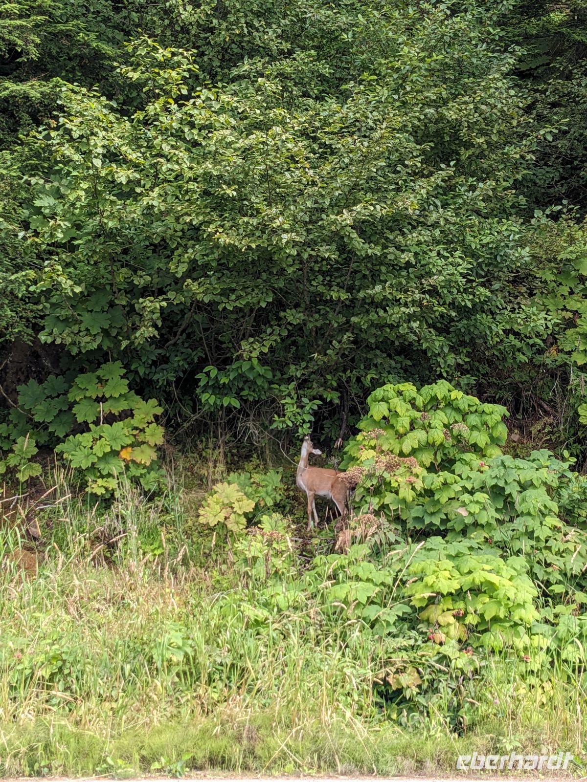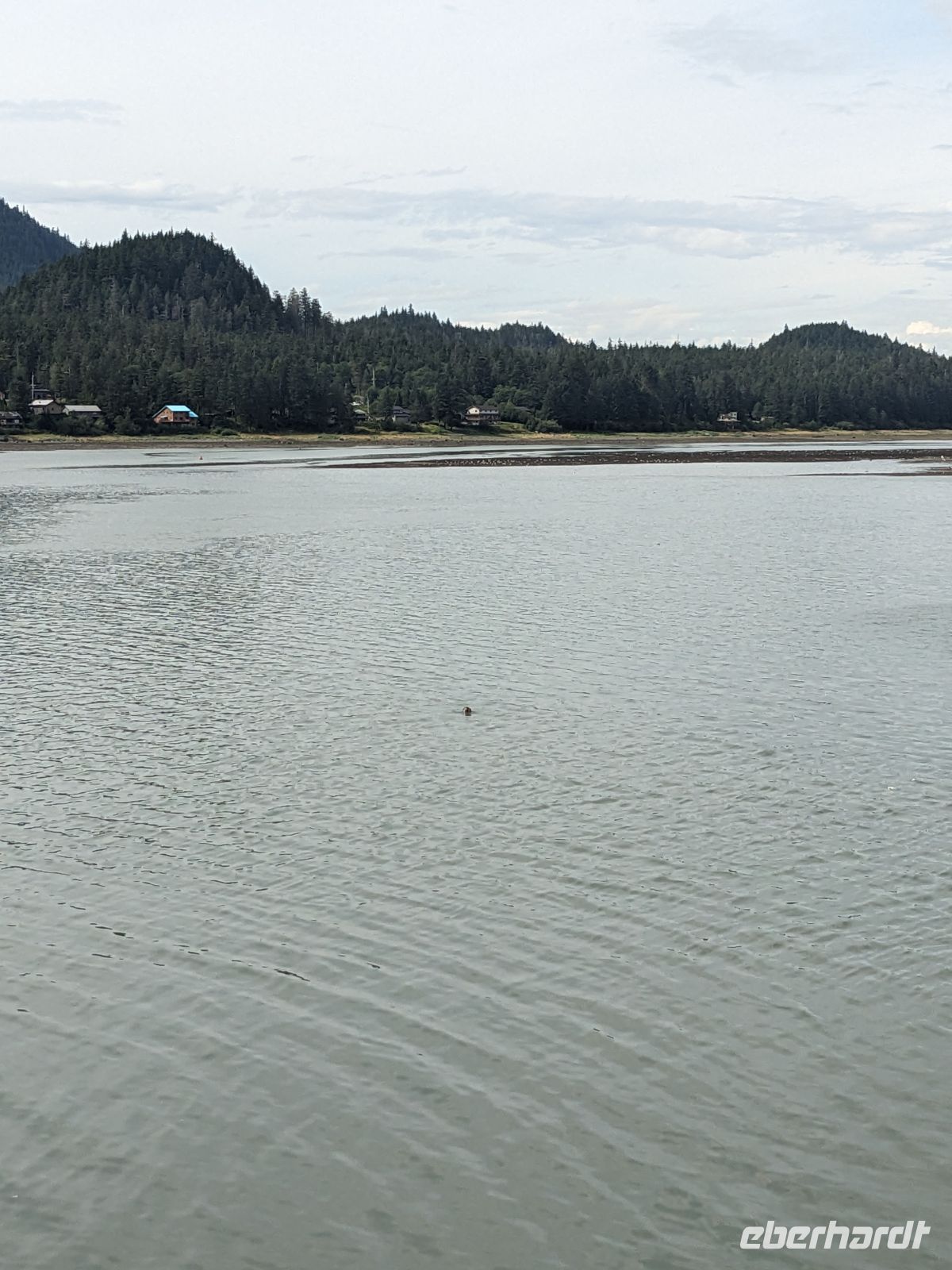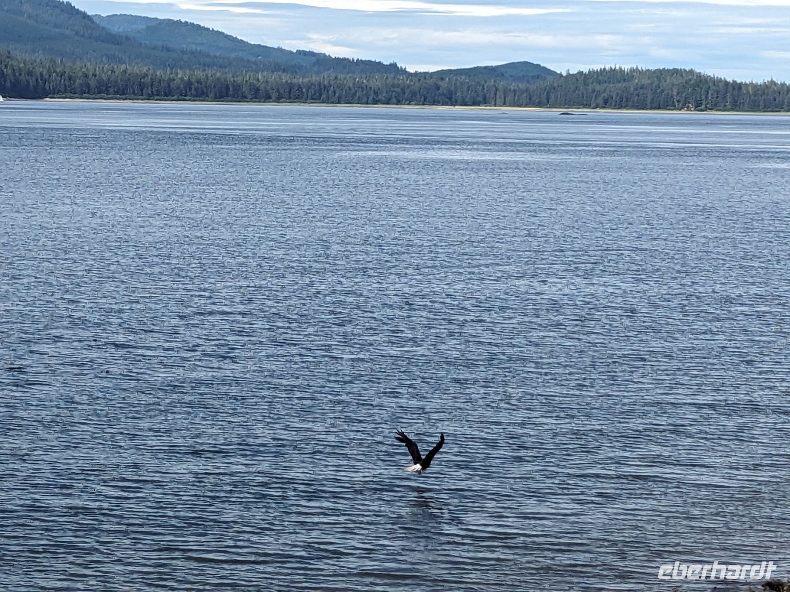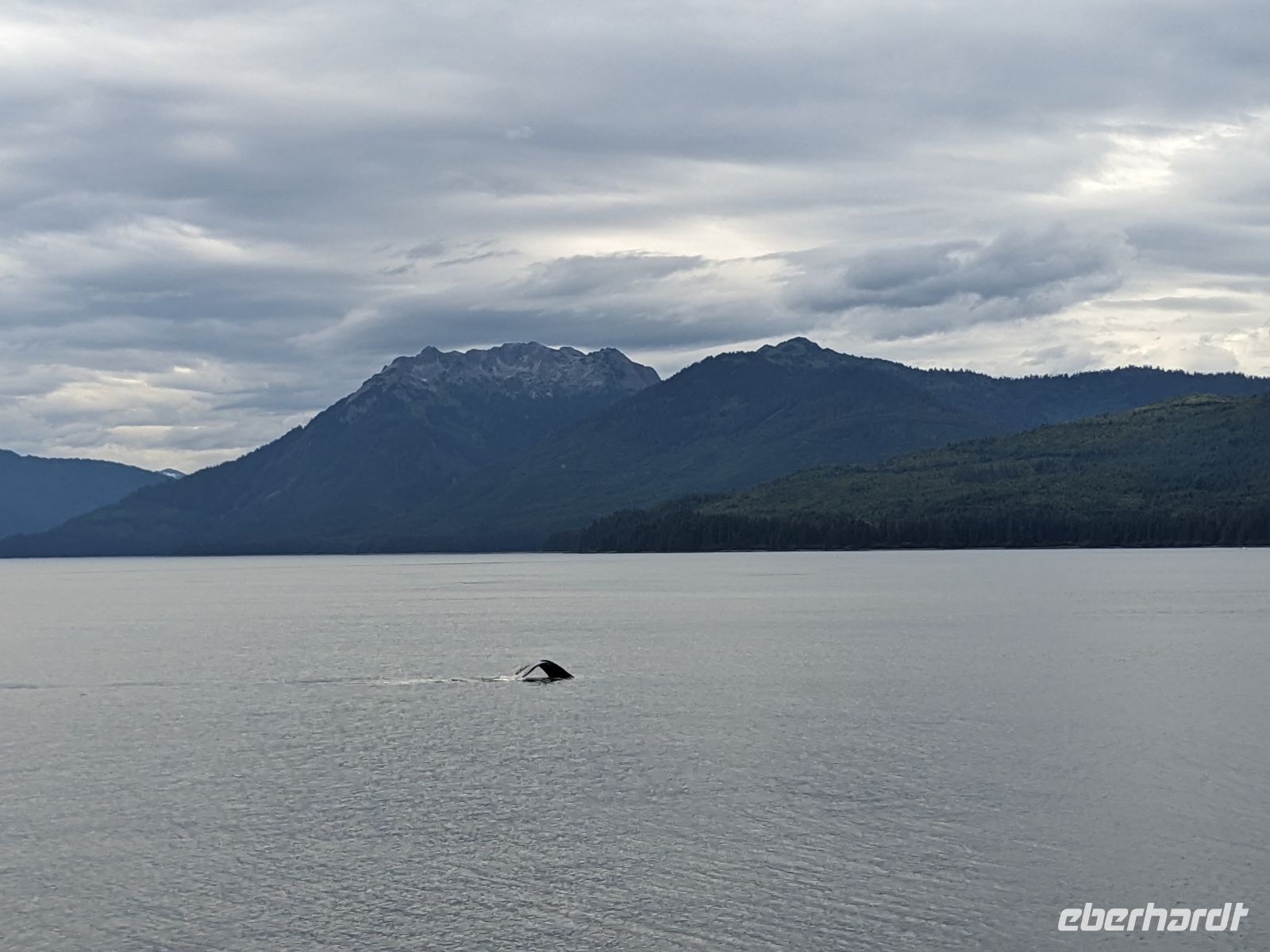 Der Großteil der Gruppe hatte für diesen Tag allerdings ein ganz besonderes Erlebnis gebucht: Walbeobachtungen per Boot. Es waren auch einige Tiere zu sehen gewesen - die sanften Riesen lassen sich durch ihre Fontäne ausfindig machen und zeigten sogar gelegentlich ihre Schwanzflosse beim Abtauchen. Teilweise war jedoch die Entfernung etwas groß, sodass man eine gute Kamera brauchte, um das Gesehene einzufangen. Ich war selbst bei keiner Walbeobachtungstour dabei, hatte aber das Glück, dass ich mit einigen aus der Gruppe beim Spaziergang in Richtung Hoonah welche vom Ufer aus sehen konnte. Auch Adler, Robben und ein Reh bekamen wir dort zu Gesicht.