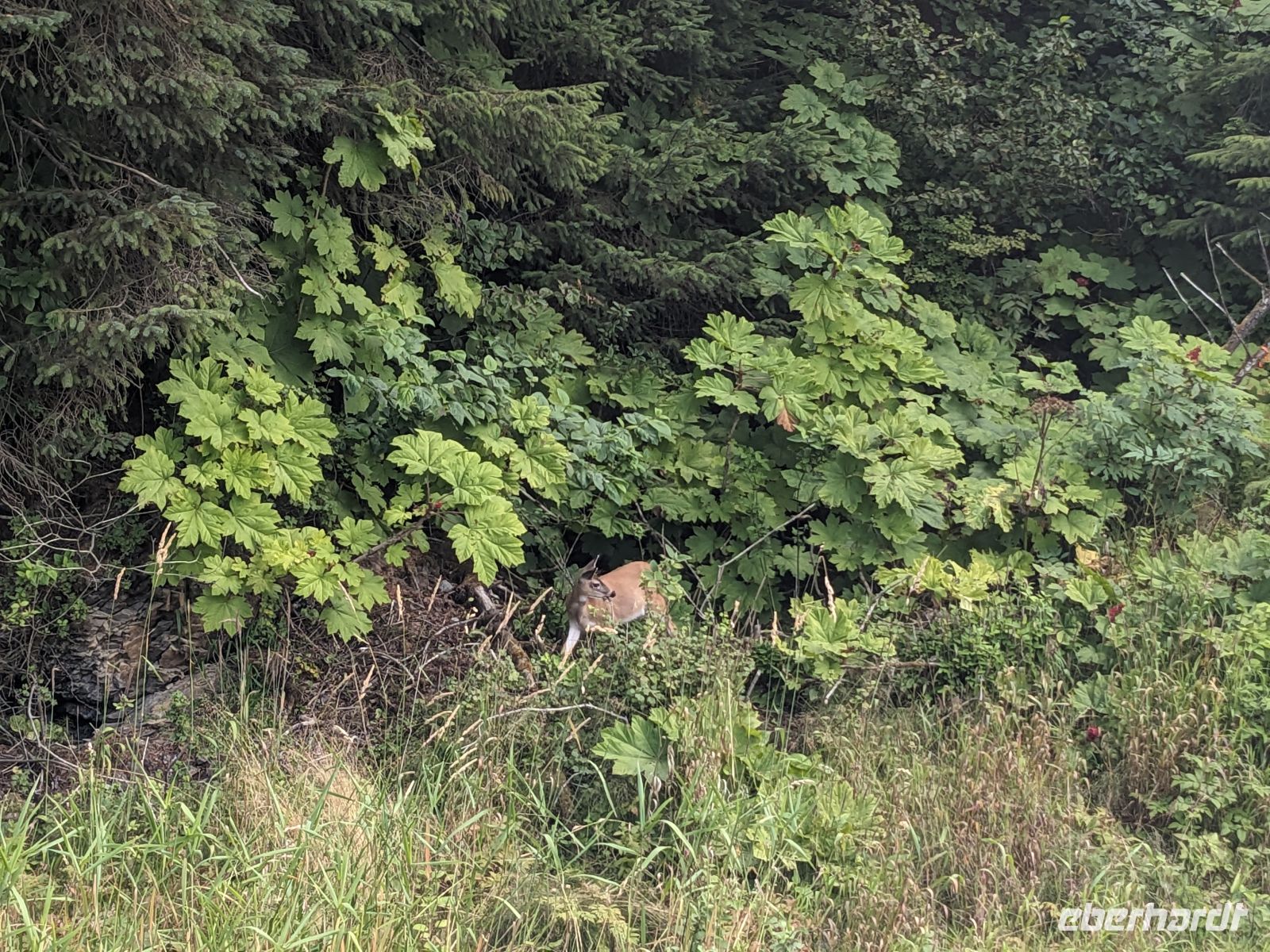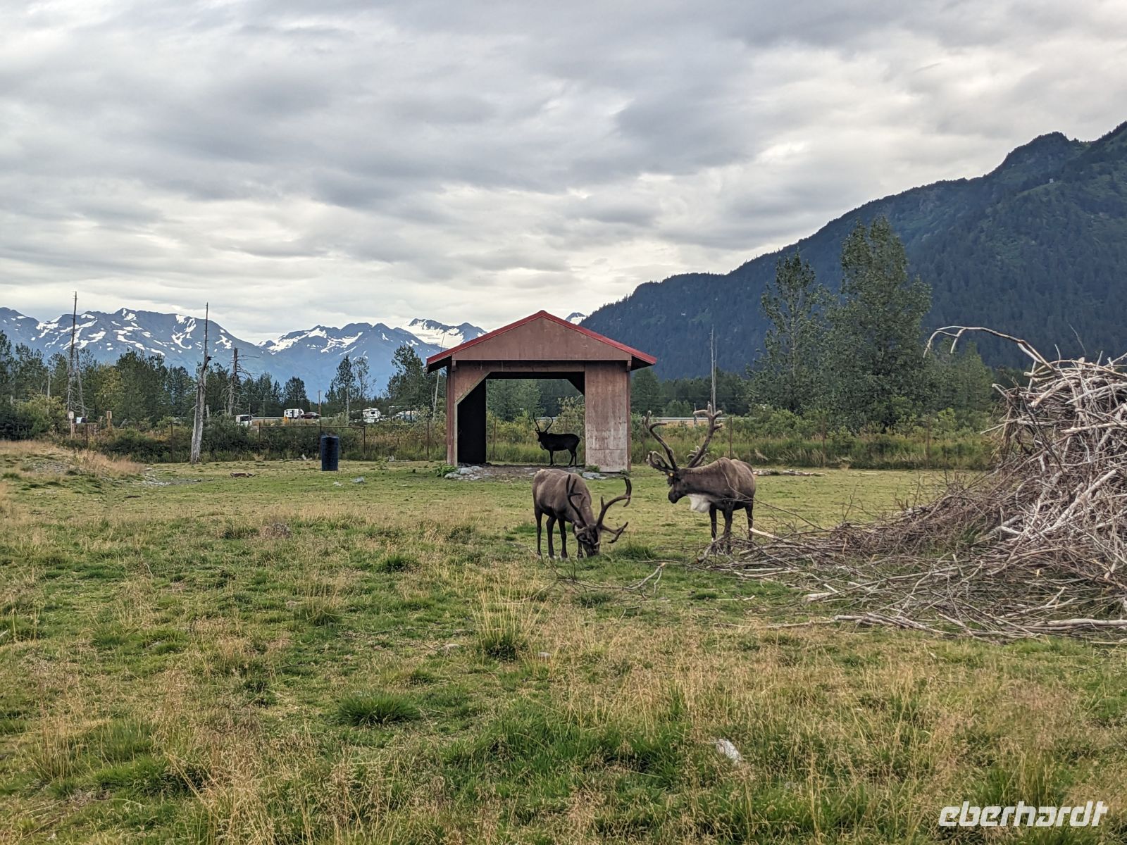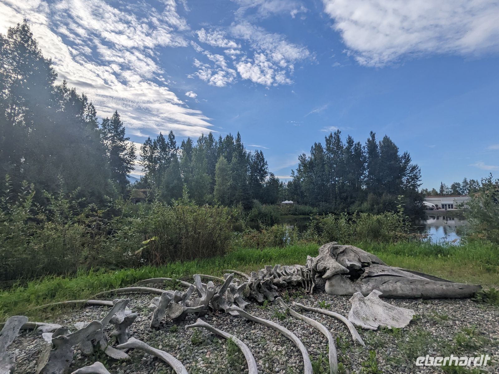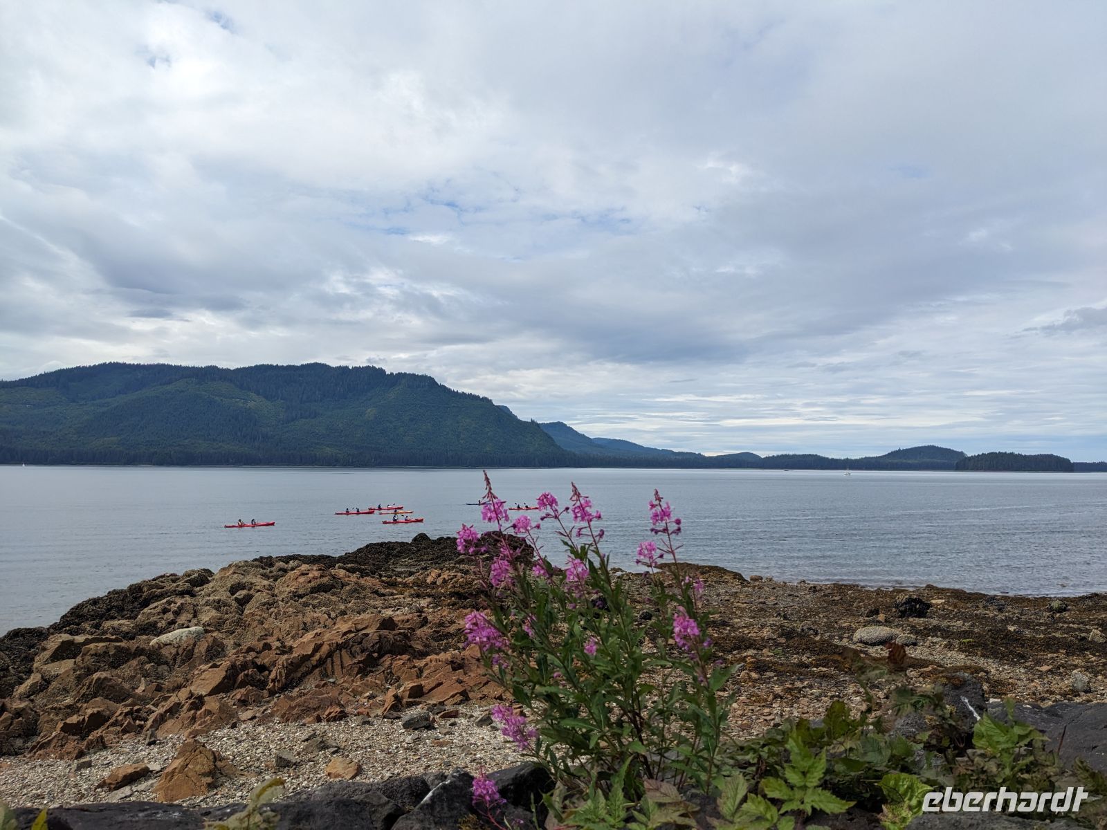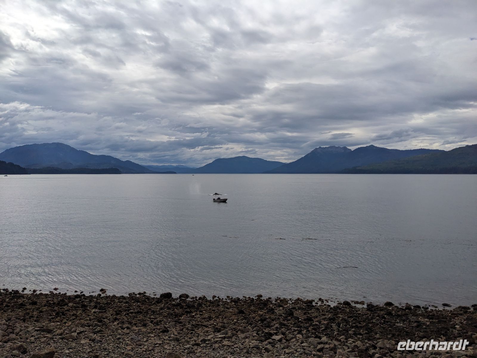 Der Großteil der Gruppe hatte für diesen Tag allerdings ein ganz besonderes Erlebnis gebucht: Walbeobachtungen per Boot. Es waren auch einige Tiere zu sehen gewesen - die sanften Riesen lassen sich durch ihre Fontäne ausfindig machen und zeigten sogar gelegentlich ihre Schwanzflosse beim Abtauchen. Teilweise war jedoch die Entfernung etwas groß, sodass man eine gute Kamera brauchte, um das Gesehene einzufangen. Ich war selbst bei keiner Walbeobachtungstour dabei, hatte aber das Glück, dass ich mit einigen aus der Gruppe beim Spaziergang in Richtung Hoonah welche vom Ufer aus sehen konnte. Auch Adler, Robben und ein Reh bekamen wir dort zu Gesicht.