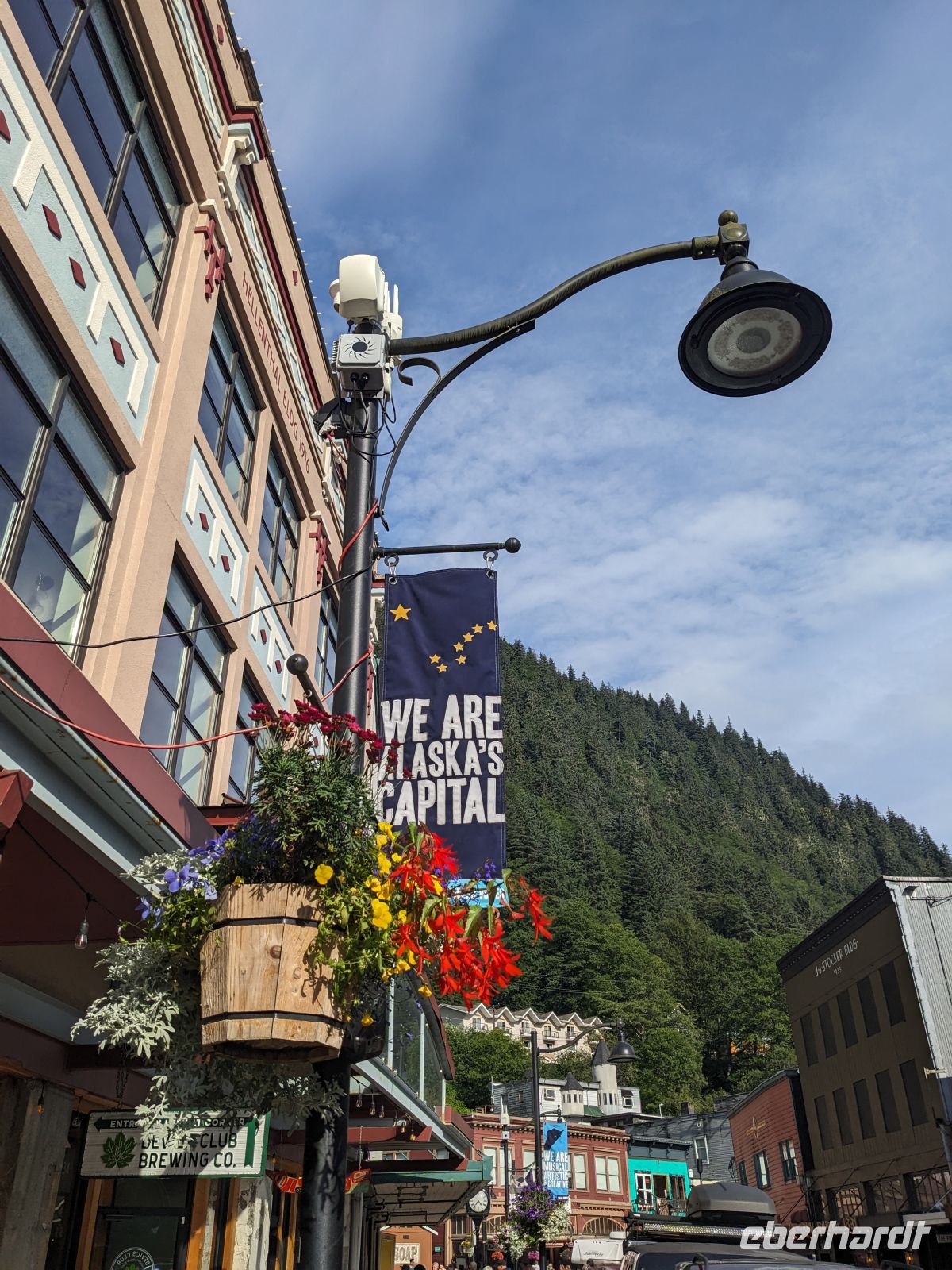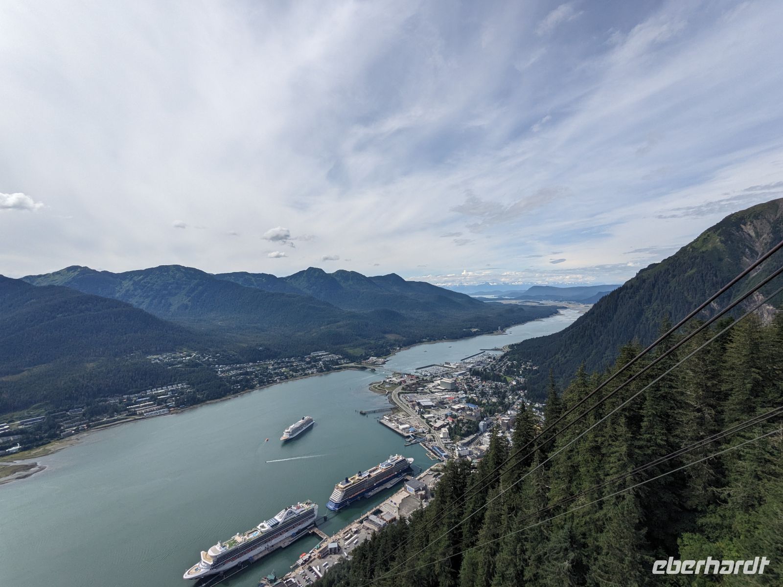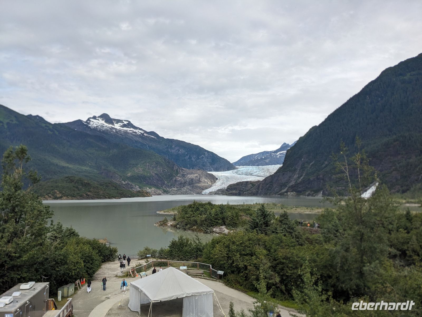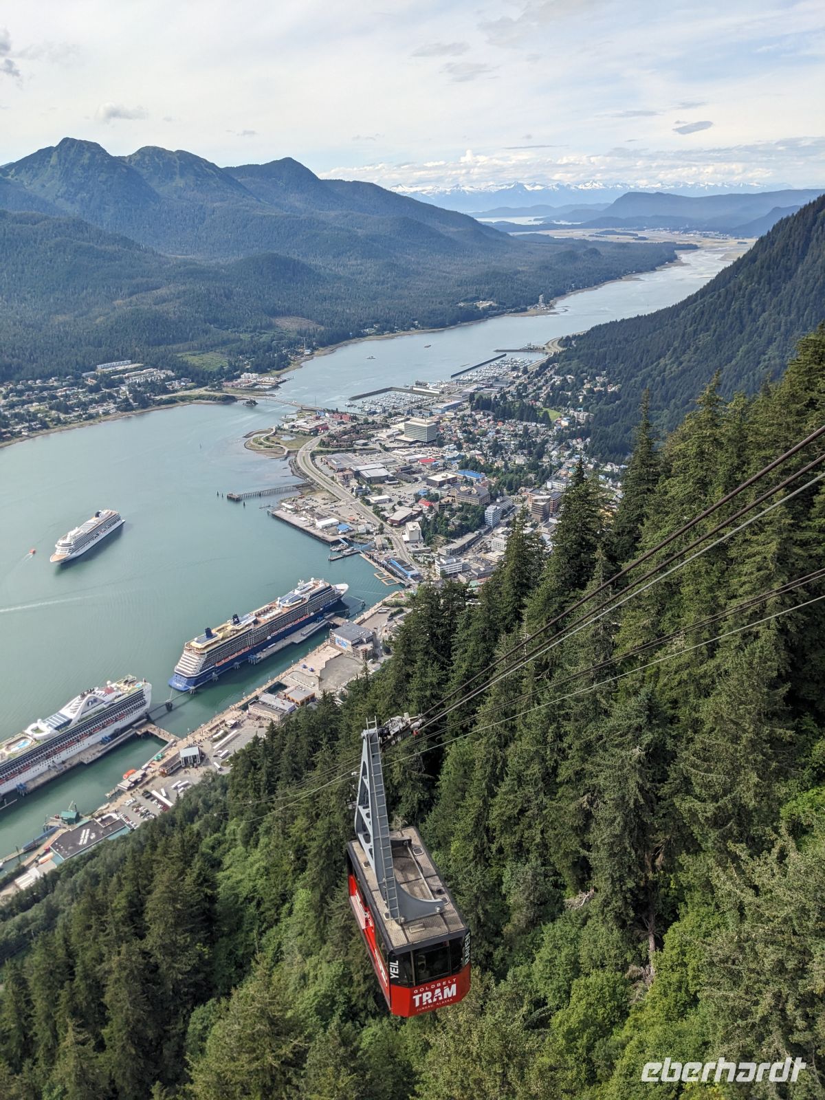 In Alaska’s Hauptstadt Juneau erwartete uns ein erlebnisreicher Tag in Form des inklusiven und privaten Eberhardt-Ausflugs. Zunächst fuhren wir zum Mendenhall-Gletscher, dessen eisblaue Zunge sich imposant in die Landschaft schiebt. Ein Spaziergang zum Aussichtspunkt bot einen tollen Blick auf den Gletscher sowie die danebenliegenden Nugget Falls, welche bei einer separaten kleinen Wanderung erkundet werden konnten. Der Weg war sehr gut angelegt und wir konnten sogar ein Stachelschwein im Baum entdecken. Insgesamt hatten wir hier großes Glück: noch am Vortag war der Zugang zum Gletscher gesperrt! Grund: Überschwemmungsgefahr. Es hatte so viel geregnet, bevor wir gekommen sind, dass der Gletschersee überfließen zu drohte. Doch pünktlich zum Tag unserer Ankunft kam die Sonne heraus und wir erlebten einen wunderschönen Tag in der Hauptstadt Alaskas. Danach ging es zur Salmon Hatchery, wo wir einen faszinierenden Einblick in die Lachszucht und den Lebenszyklus dieser Tiere erhielten. Besonders spannend war der Blick durch Unterwasserfenster auf die Fischtreppe und die großen Becken, in denen die Junglachse auf ihre Auswilderung vorbereitet werden. Auch Robben ließen sich hier blicken, angelockt vom reichen Nahrungsangebot. Anschließend ging es hinauf mit der Seilbahn auf den Mount Roberts, wo wir bei klarer Sicht spektakuläre Panoramen genießen konnten. Wer mochte, ließ den Tag mit einem Stadtbummel und im legendären Red Dog Saloon ausklingen – ein Stück echte Alaska-Tradition. In kleiner Gruppe waren wir auch noch im Regierungsgebäude - hier konnten wir einfach hineinspazieren und uns die Örtlichkeiten anschauen. Der Besuch ist auf jeden Fall eine Empfehlung wert!