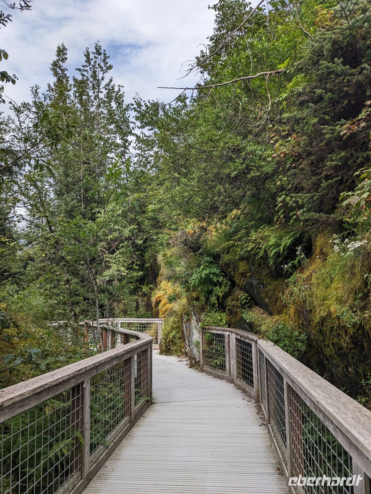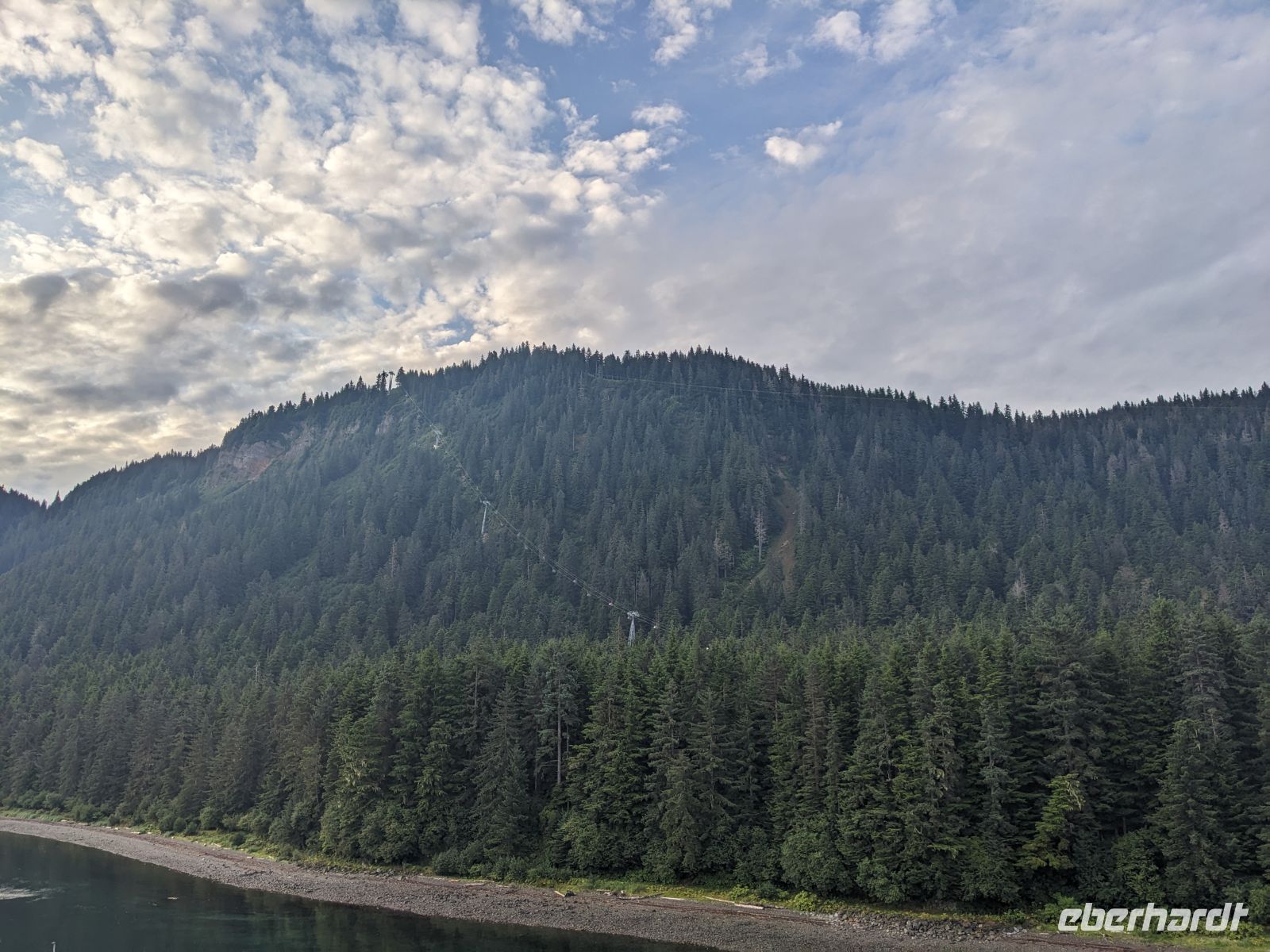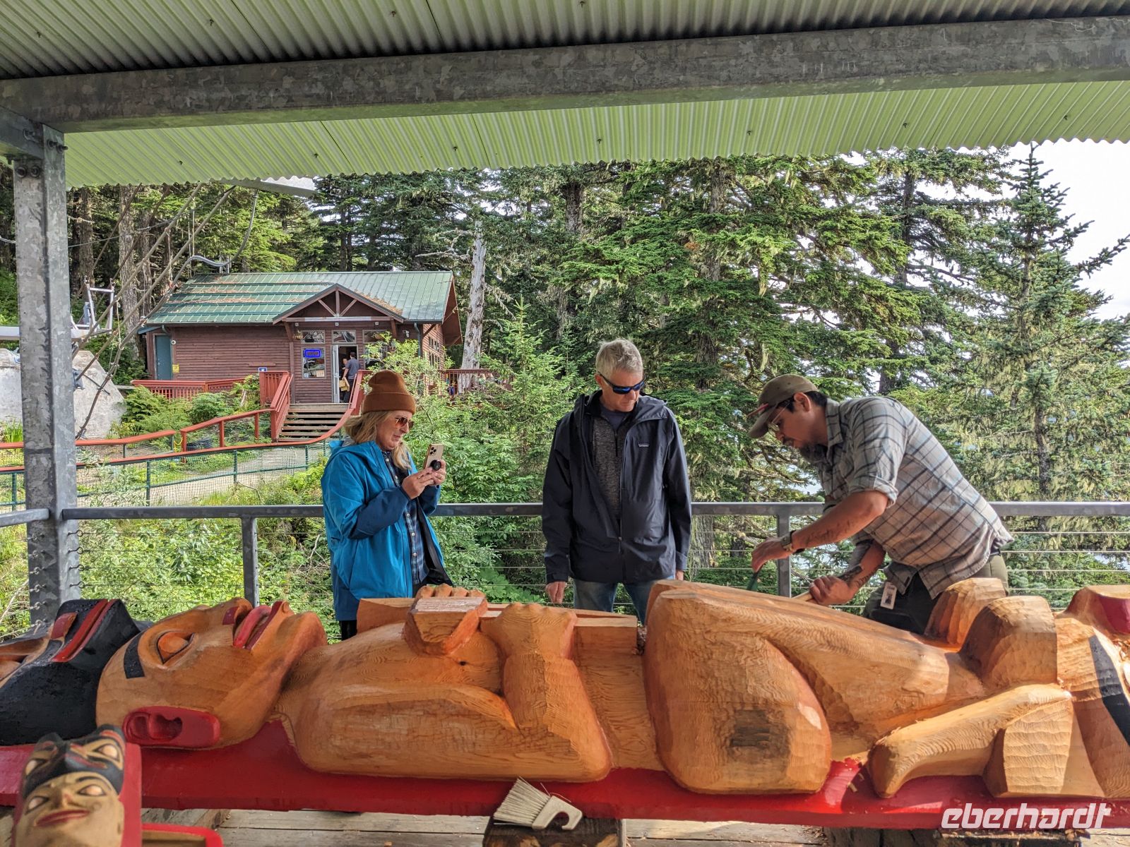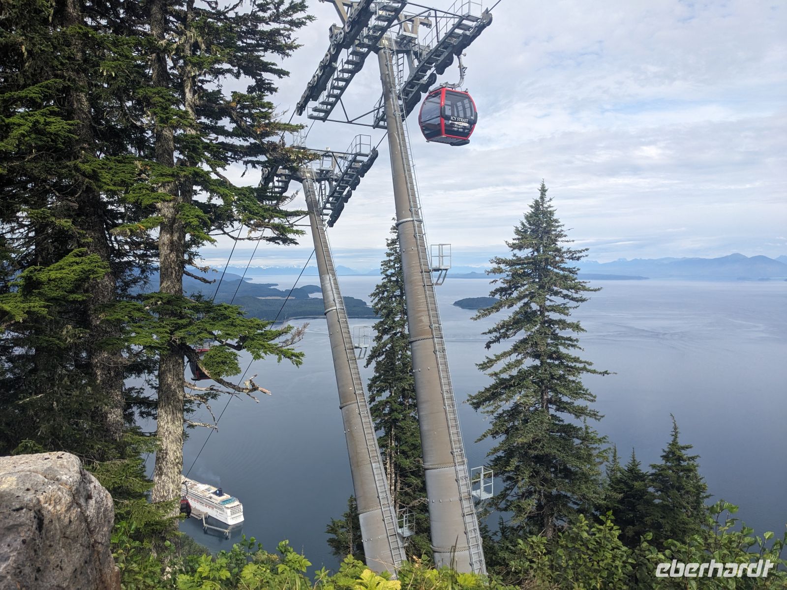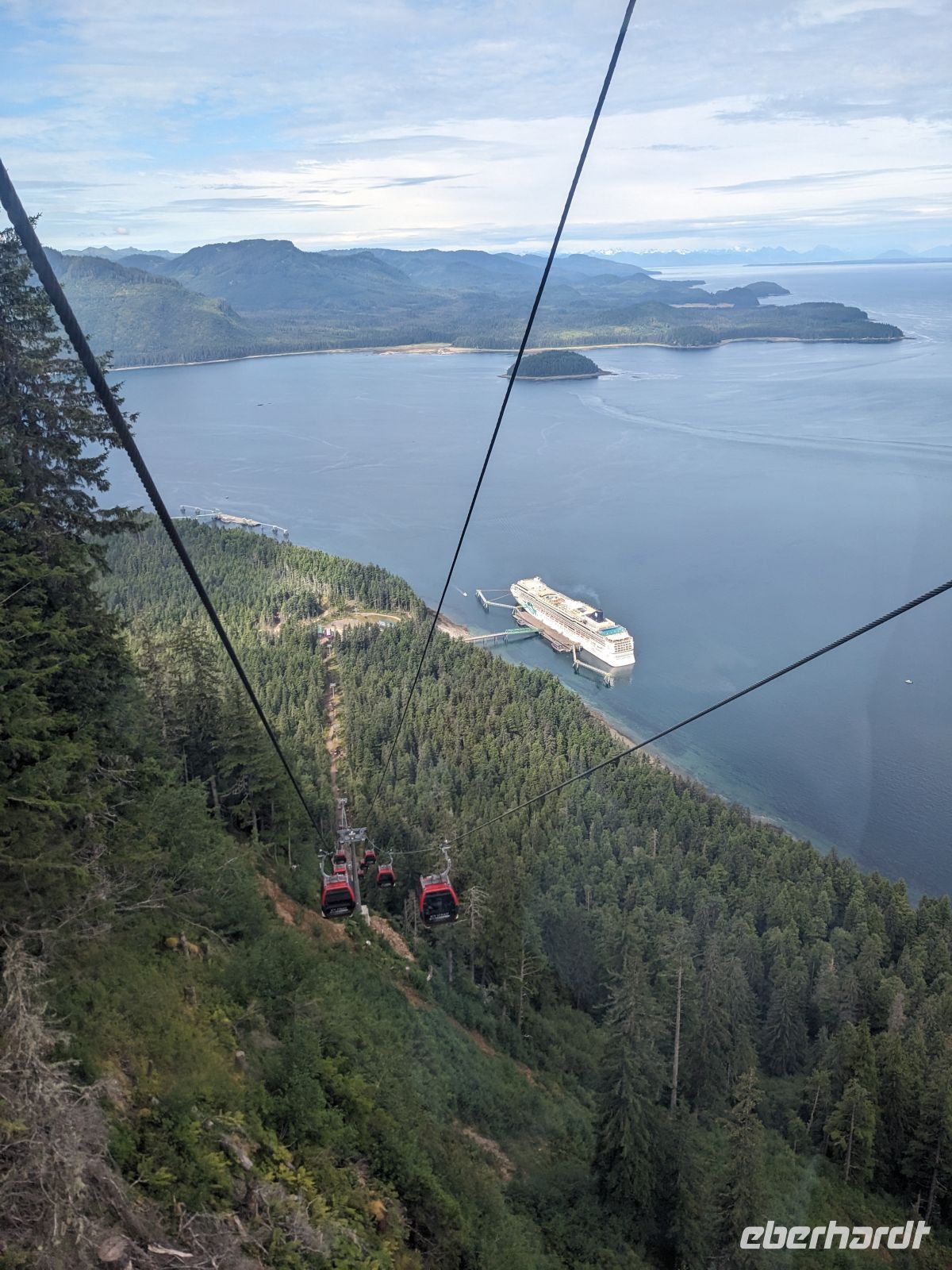 Heute erwartete uns ein ganz besonderer Ort: Icy Strait Point, ein verstecktes Kleinod Alaskas, umgeben von unberührter Natur. Schon beim Anlegen begrüßten uns dichte Wälder, klare Luft und die Weite des Ozeans. Mit einigen aus der Gruppe nutzte ich die Gelegenheit, mit der Gondel hinauf auf den Aussichtspunkt zu fahren. Von dort bot sich ein grandioser Blick über die Küstenlinie, tiefgrüne Wälder und die schneebedeckten Berge im Hintergrund. Wieder unten angekommen, war ein weiteres Highlight der Spaziergang über den Naturpfad, der parallel zur zweiten Gondel von Icy Strait Point (flach verlaufene Gondel) verläuft – ein sanfter Weg, der durch ursprünglichen Regenwald führt. Unterwegs erzählte die Natur selbst ihre Geschichte: Moose, Vogelstimmen und der Blick auf die Küste bestimmten die Atmosphäre.