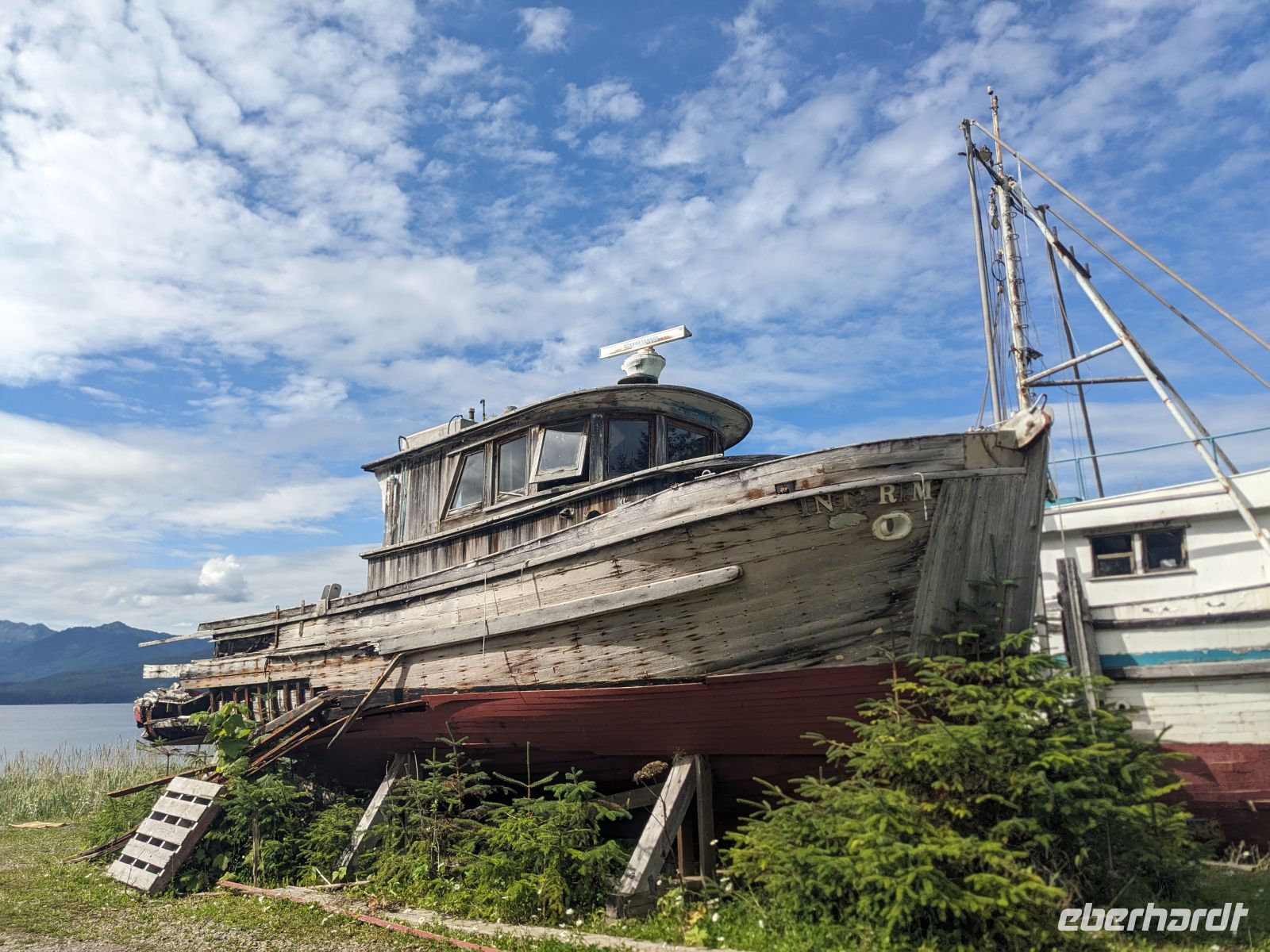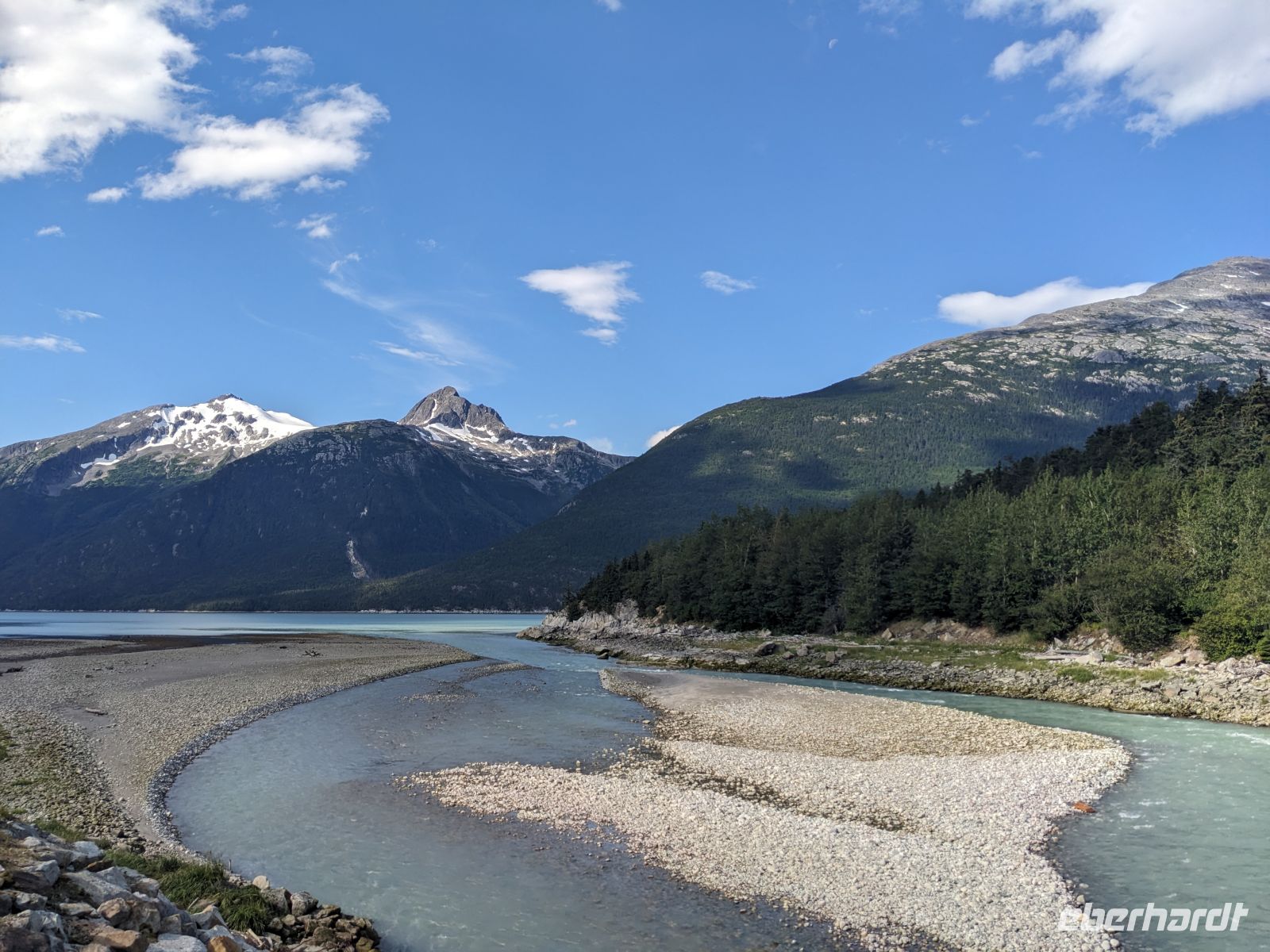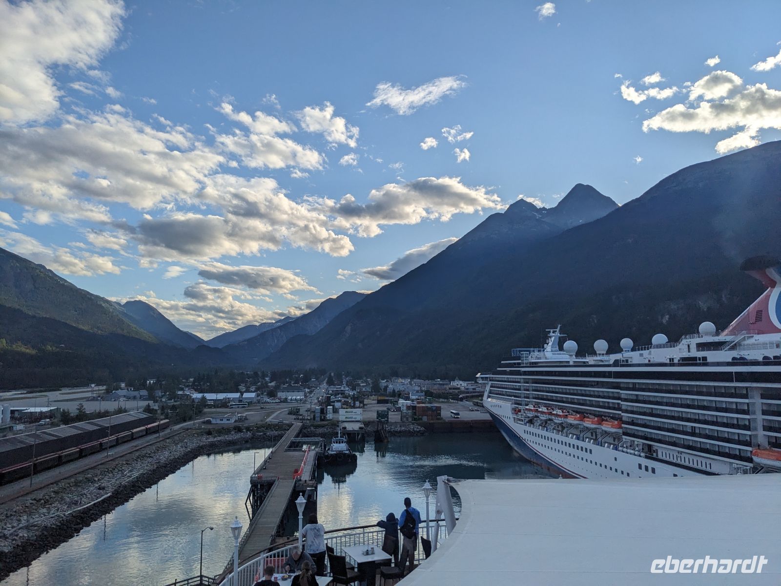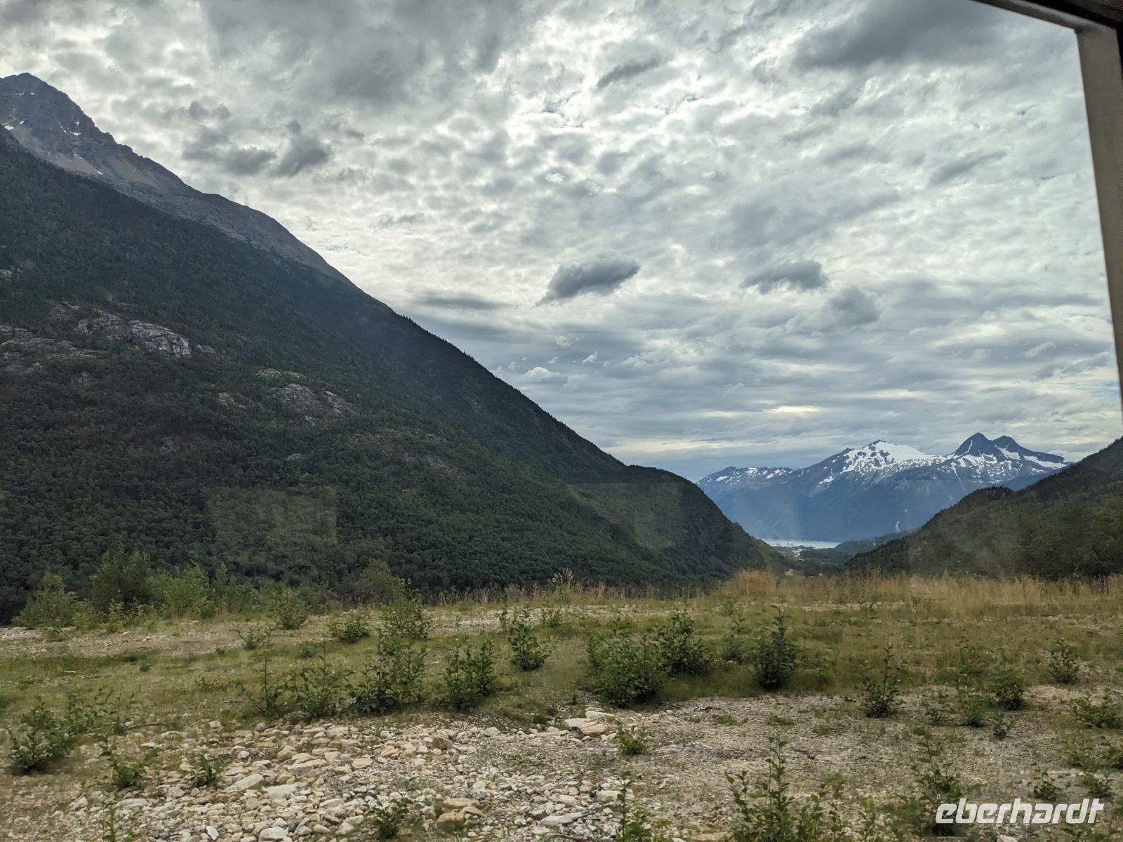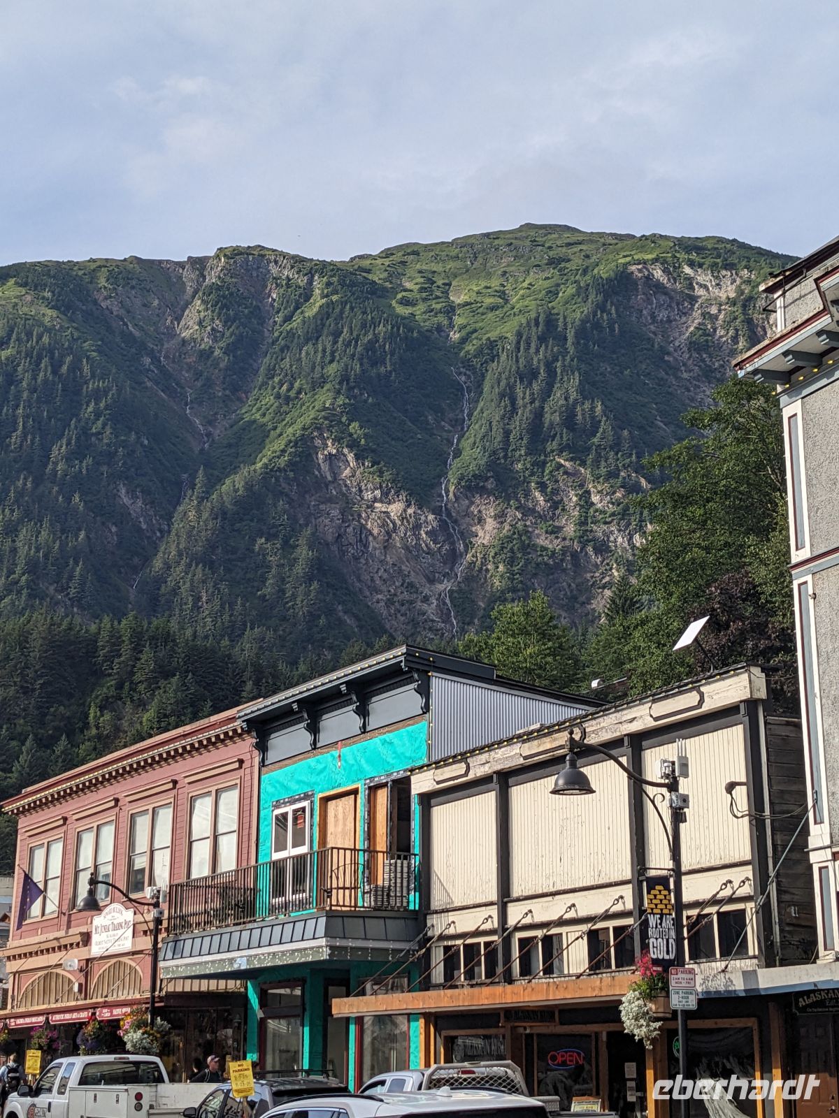Skagway empfing uns mit strahlendem Sonnenschein und einer einzigartigen Goldrausch-Atmosphäre. Am Vormittag bot ich einen fakultativen Spaziergang durch den historischen Ortskern an. Gemeinsam schlenderten wir entlang der berühmten Broadway Street, vorbei an liebevoll restaurierten Holzhäusern, alten Saloons und kleinen Läden, die an die Zeit des großen Goldrauschs Ende des 19. Jahrhunderts erinnern. Es war faszinierend, in diese Epoche einzutauchen und sich vorzustellen, wie Tausende von Glücksrittern hier aufgebrochen sind, um ihr Glück am Klondike zu suchen. Nach dem Spaziergang machte ich mich mit zwein aus der Gruppe noch auf den Weg zum Yakutania Point, einer ruhigen Landzunge außerhalb des Ortes. Hier genossen wir den traumhaften Ausblick auf die fjordartige Küste und die Berge im Hintergrund – ein Geheimtipp abseits der Touristenströme.