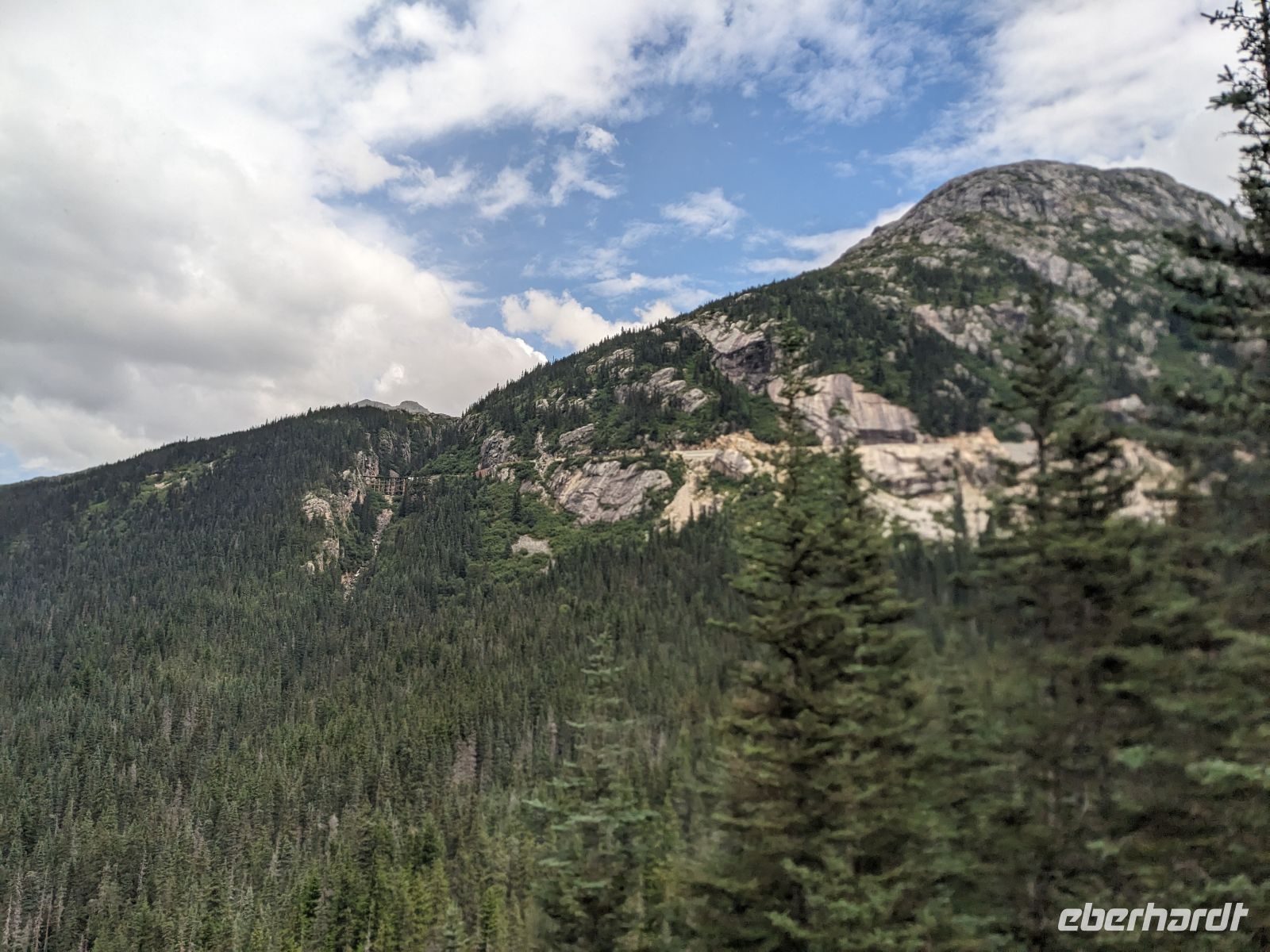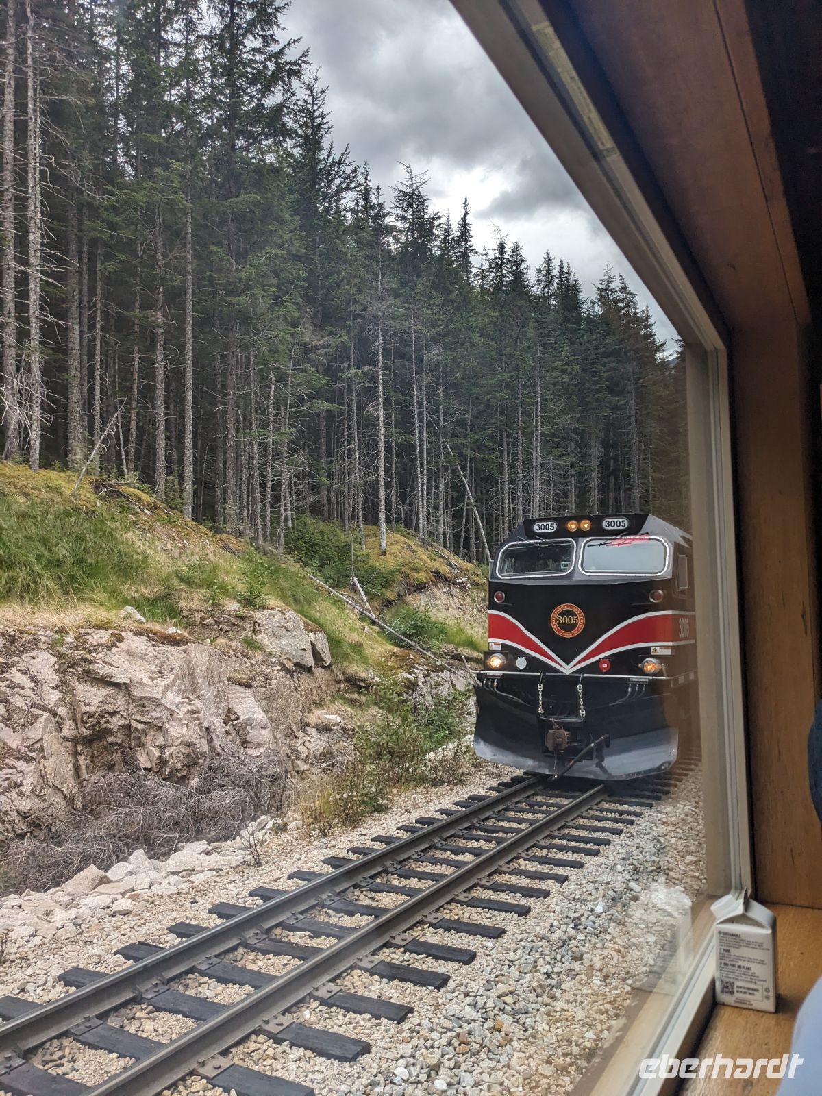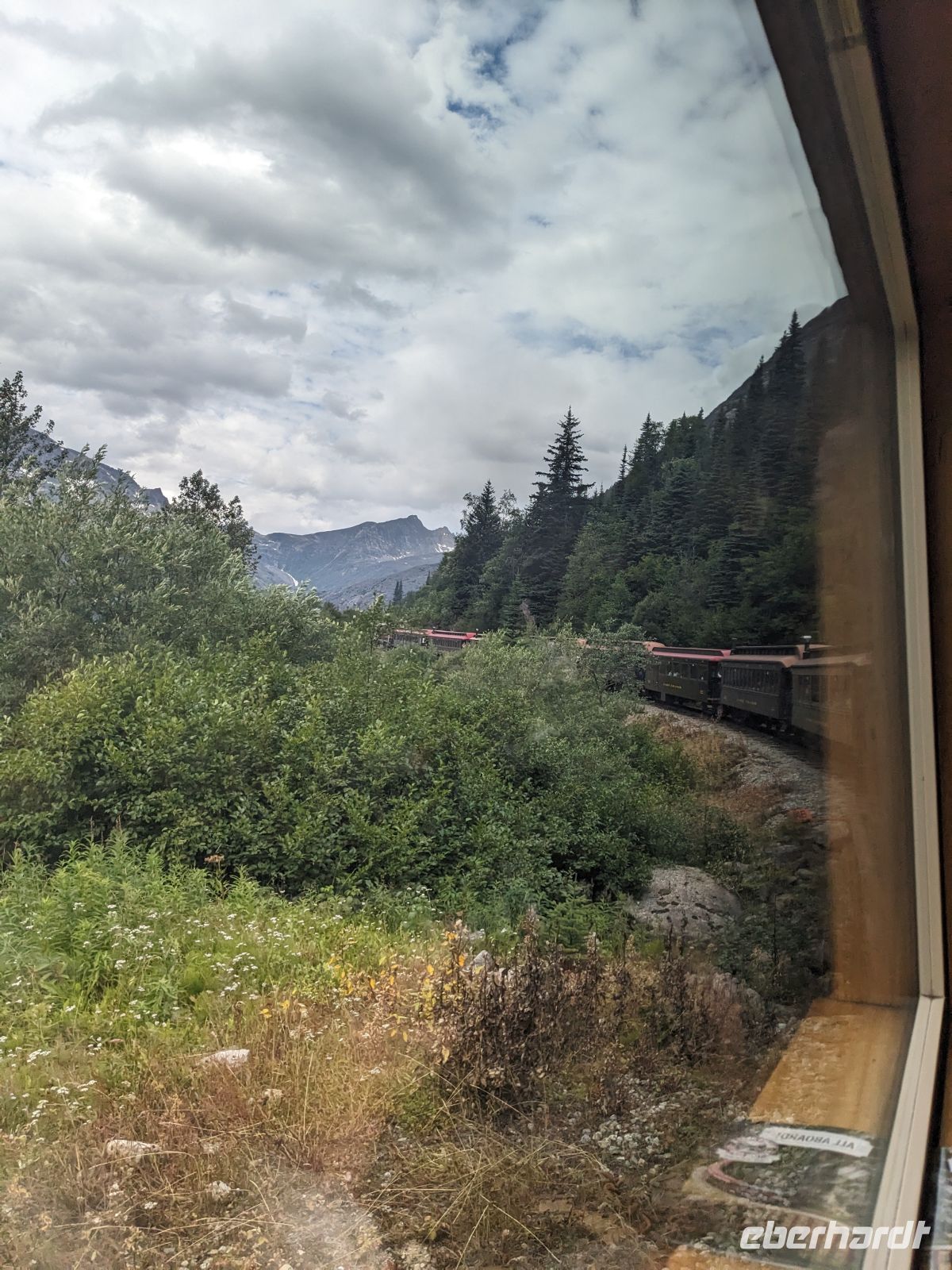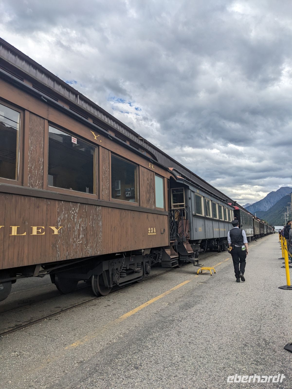 Am Nachmittag stand für einen Großteil der Gruppe die legendäre Fahrt mit der White Pass & Yukon Route auf dem Programm – einer historischen Bahnstrecke, die einst während des Goldrauschs als Lebensader in den Norden diente. Sie wurde unter extremen Bedingungen in den Jahren 1898/99 erbaut, um den mühseligen und gefährlichen Weg über den White Pass zu erleichtern. Die Strecke windet sich auf über 1.000 Höhenmeter hinauf, vorbei an tosenden Wasserfällen, tiefen Schluchten und atemberaubenden Bergpanoramen. An den Originalwaggons aus Holz und den engen Kurven spürt man noch heute den Pioniergeist dieser Zeit.