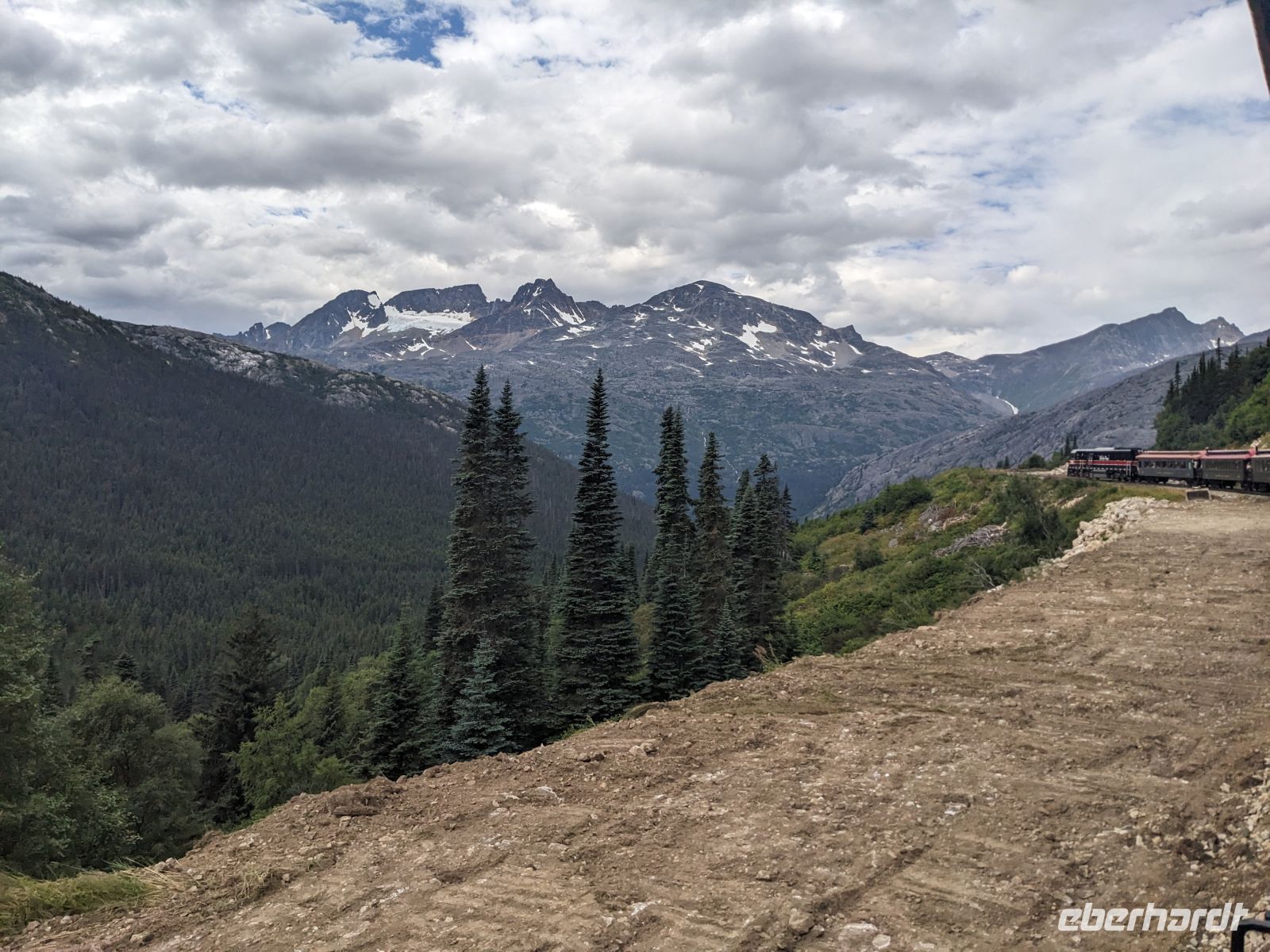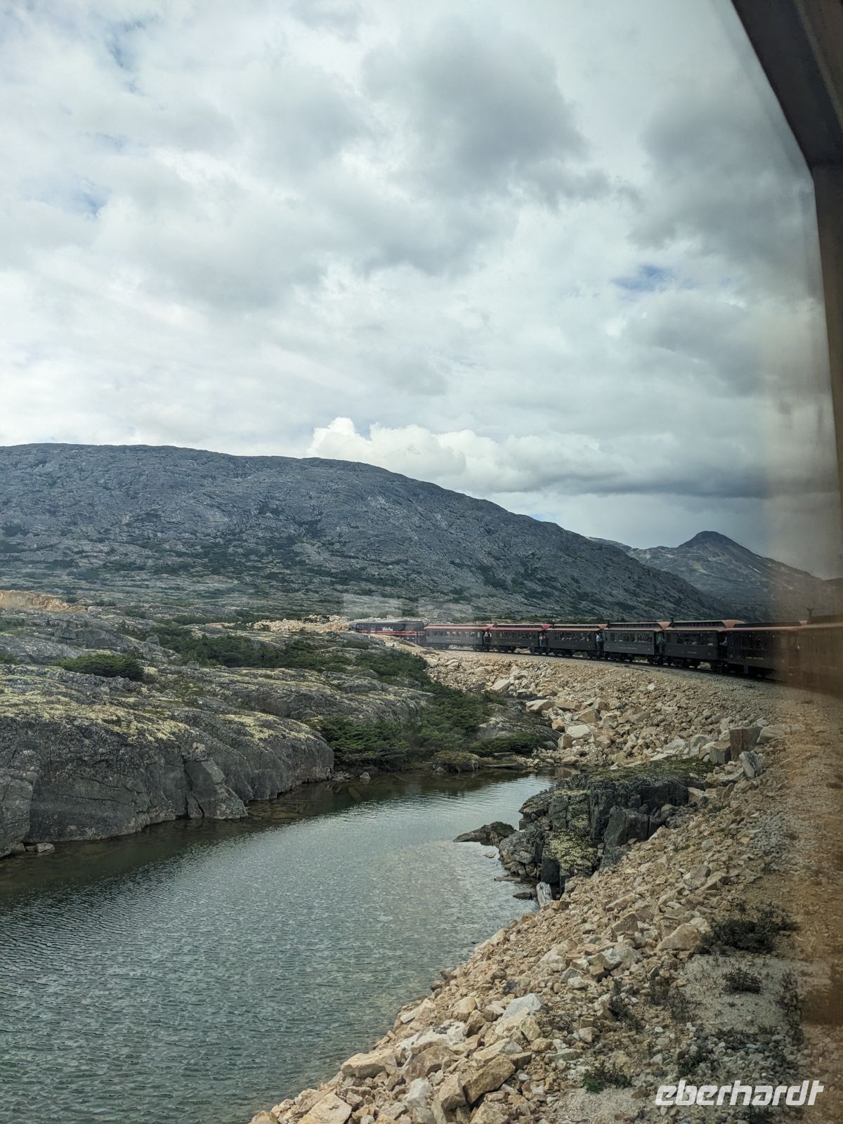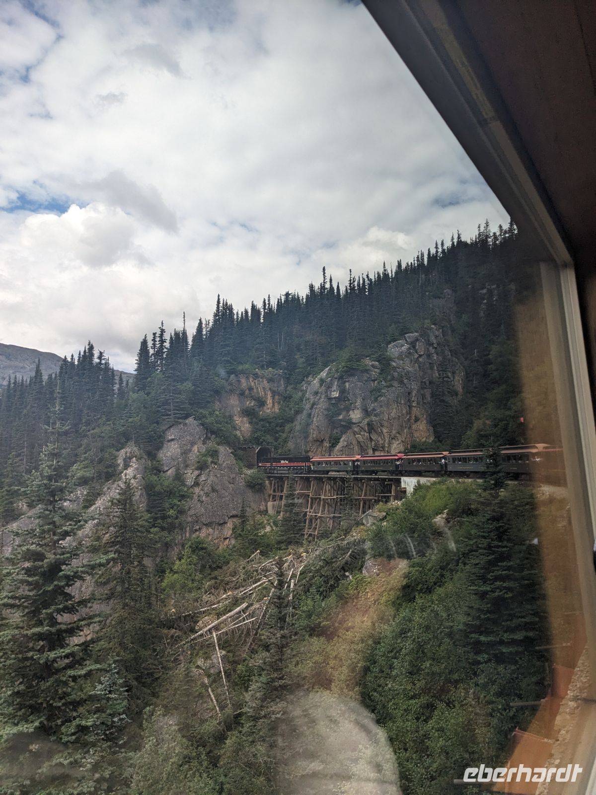Am Nachmittag stand für einen Großteil der Gruppe die legendäre Fahrt mit der White Pass & Yukon Route auf dem Programm – einer historischen Bahnstrecke, die einst während des Goldrauschs als Lebensader in den Norden diente. Sie wurde unter extremen Bedingungen in den Jahren 1898/99 erbaut, um den mühseligen und gefährlichen Weg über den White Pass zu erleichtern. Die Strecke windet sich auf über 1.000 Höhenmeter hinauf, vorbei an tosenden Wasserfällen, tiefen Schluchten und atemberaubenden Bergpanoramen. An den Originalwaggons aus Holz und den engen Kurven spürt man noch heute den Pioniergeist dieser Zeit.