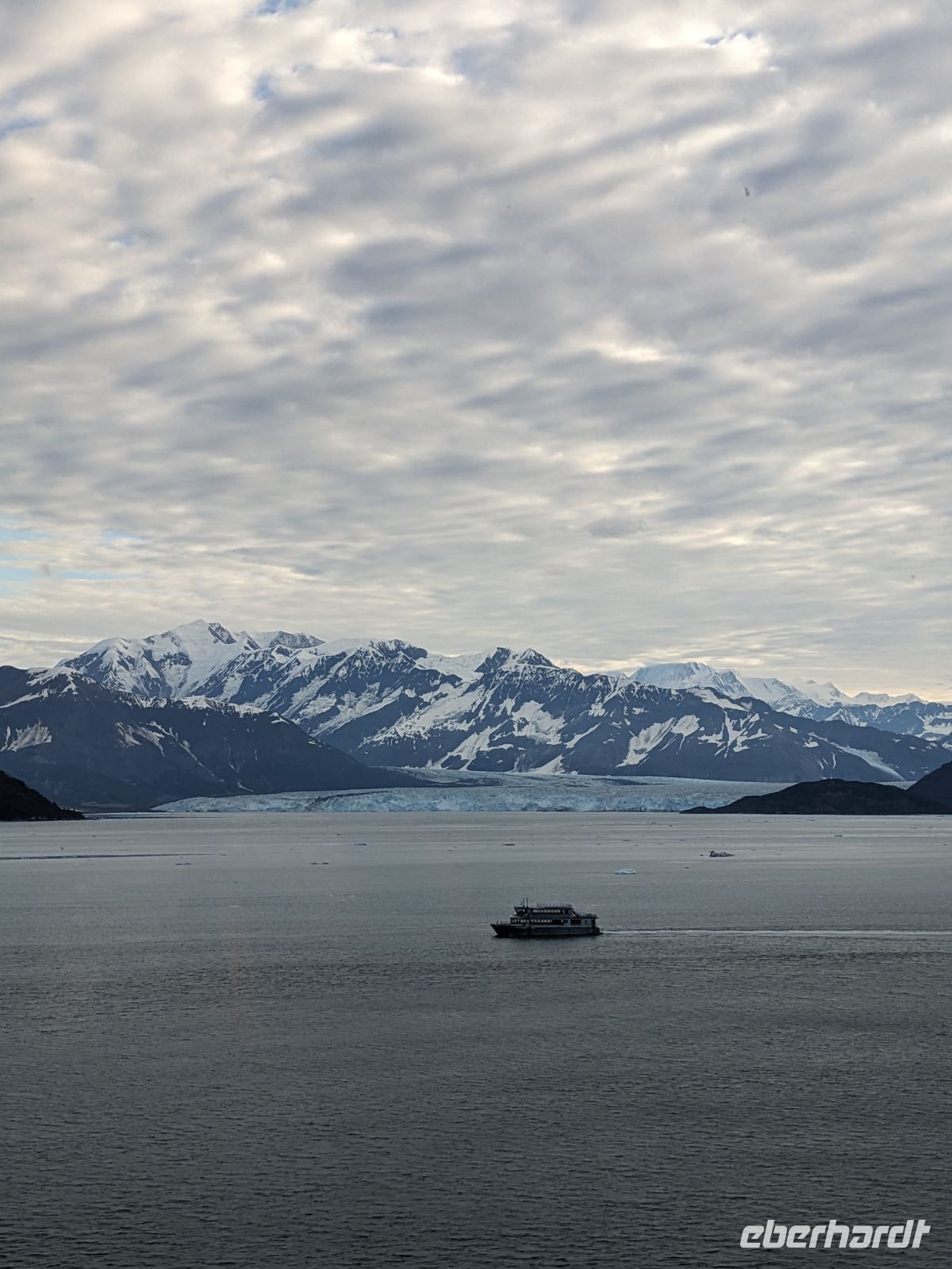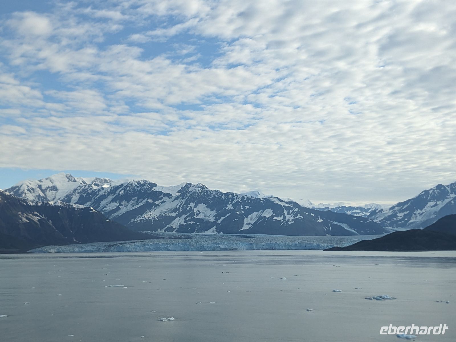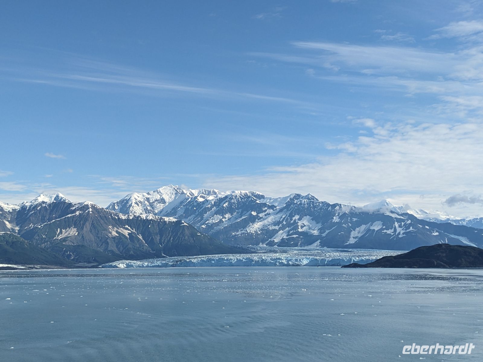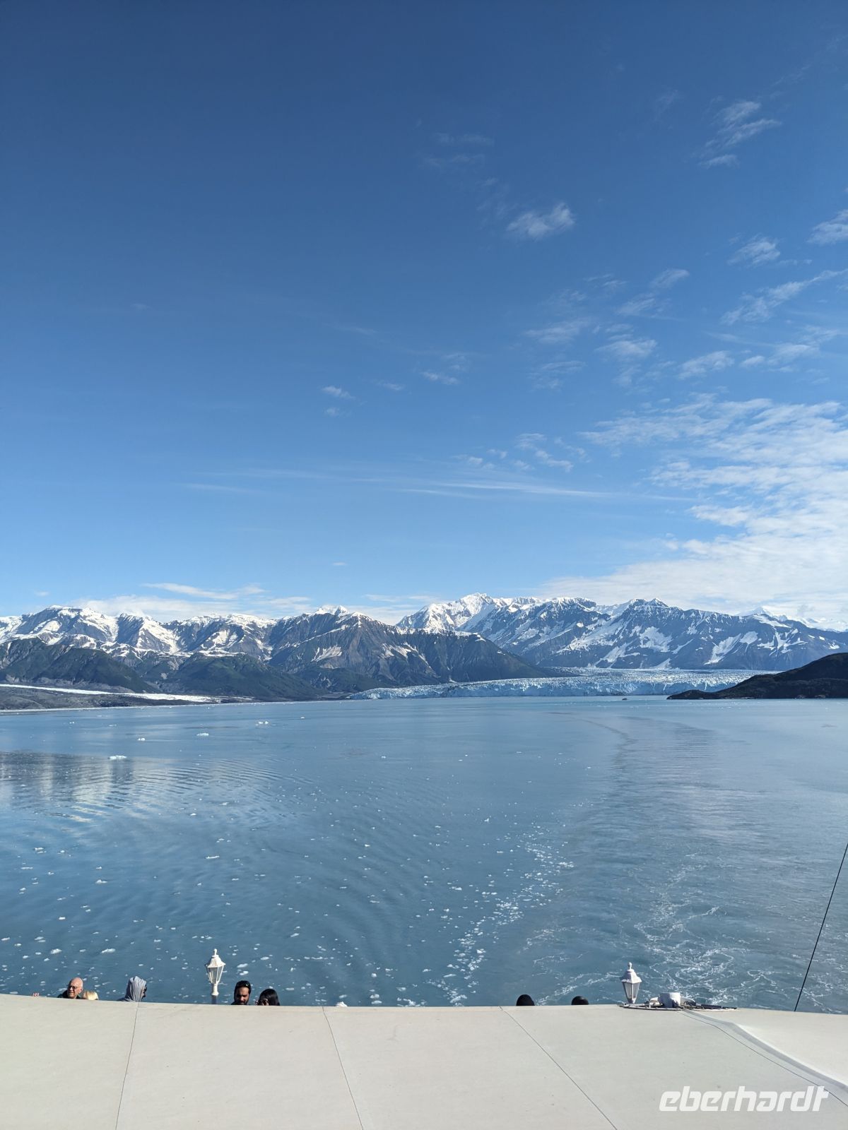 Schon früh am Morgen standen wir an Deck, denn heute erwartete uns einer der größten Gletscher Nordamerikas: der Hubbard-Gletscher. Bei erst etwas bewölkten, dann aber strahlend blauem Himmel und klarer Sicht glitt unser Schiff majestätisch durch das mit Eisschollen gespickte Wasser in die Disenchantment Bay. Die Stimmung an Bord war einzigartig – alle warteten gespannt auf den ersten Blick auf den Eisgiganten.