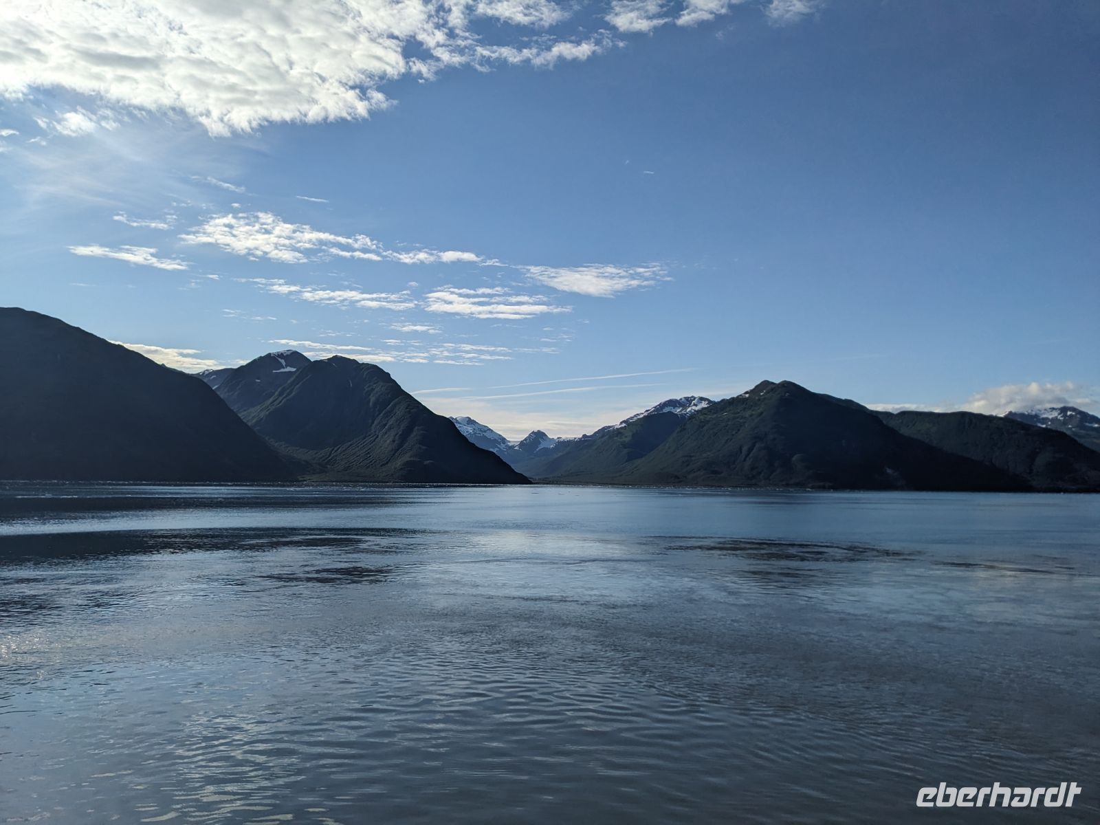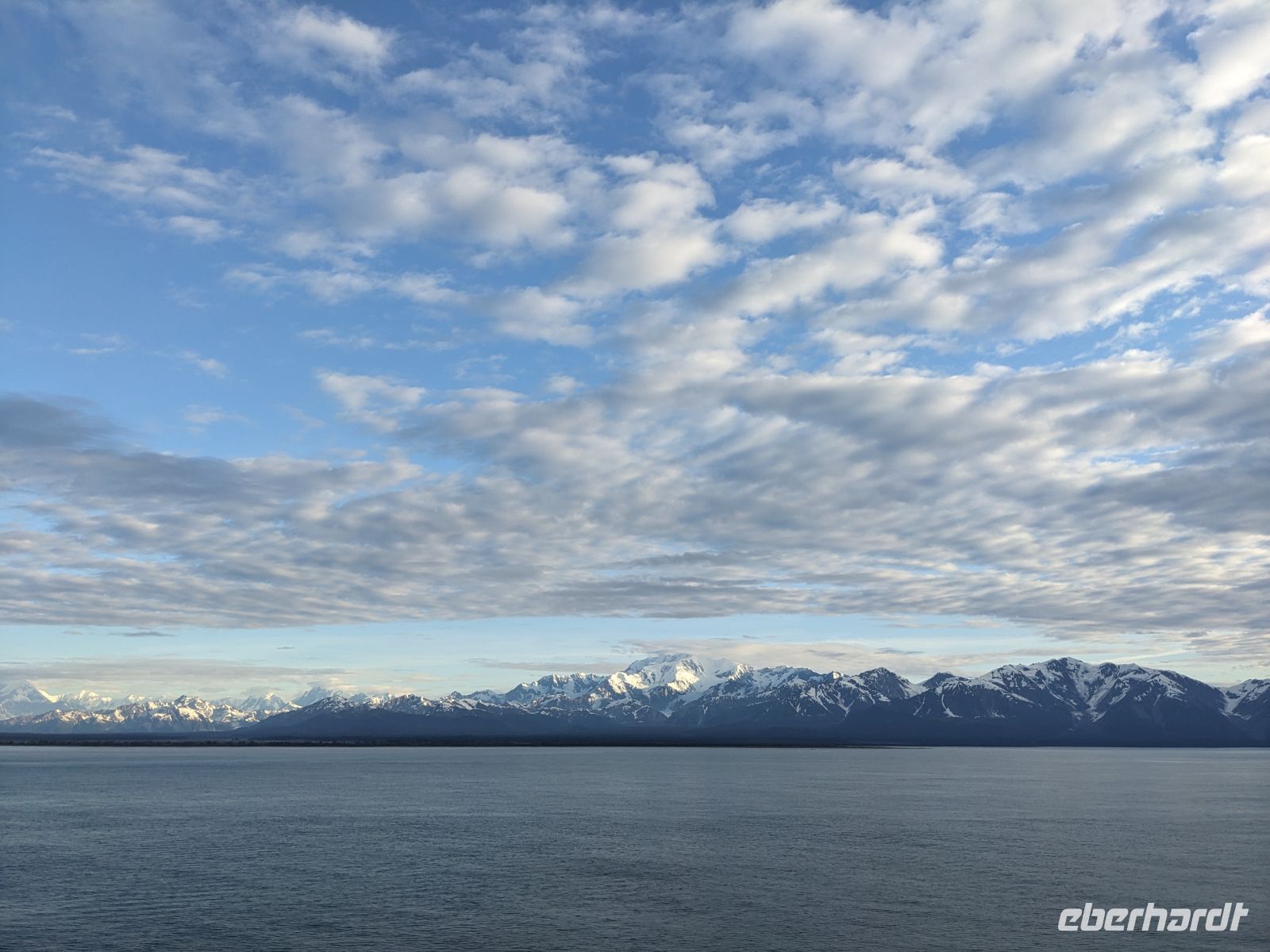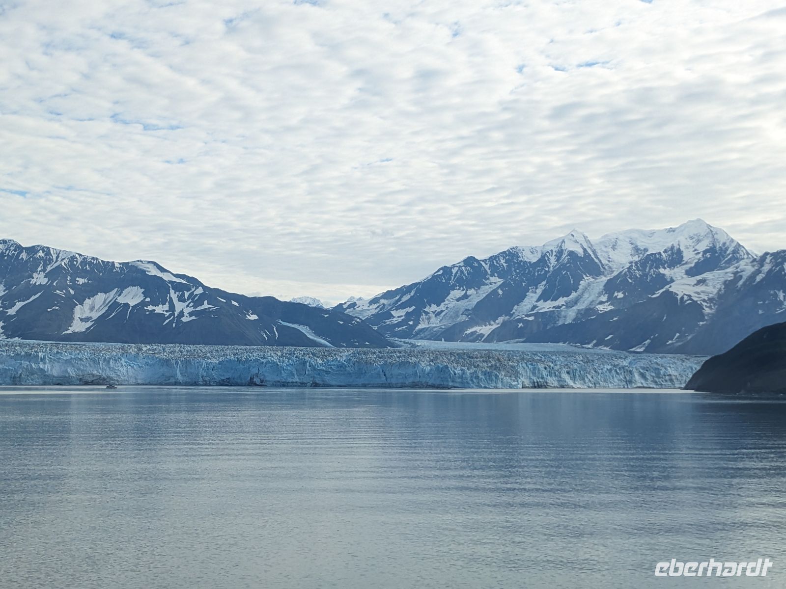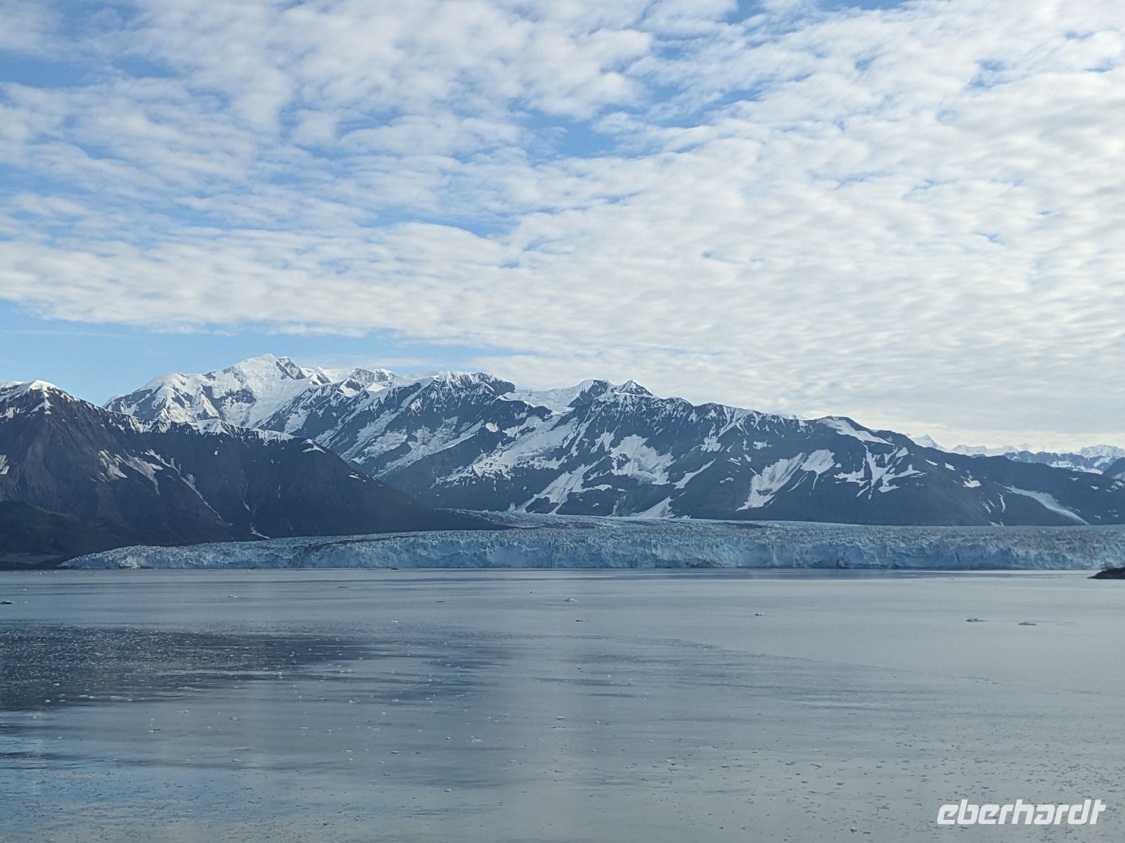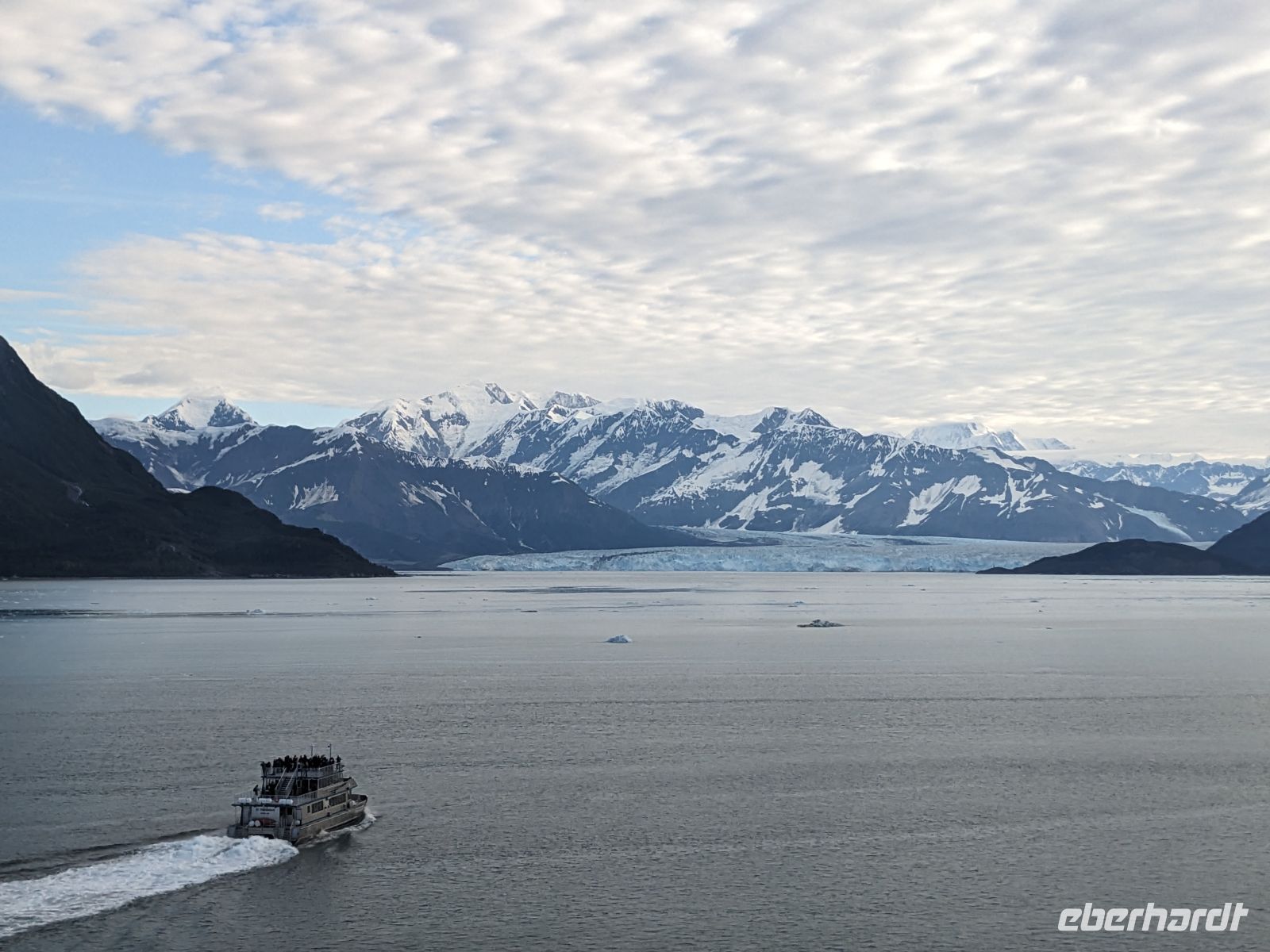 Schon früh am Morgen standen wir an Deck, denn heute erwartete uns einer der größten Gletscher Nordamerikas: der Hubbard-Gletscher. Bei erst etwas bewölkten, dann aber strahlend blauem Himmel und klarer Sicht glitt unser Schiff majestätisch durch das mit Eisschollen gespickte Wasser in die Disenchantment Bay. Die Stimmung an Bord war einzigartig – alle warteten gespannt auf den ersten Blick auf den Eisgiganten.