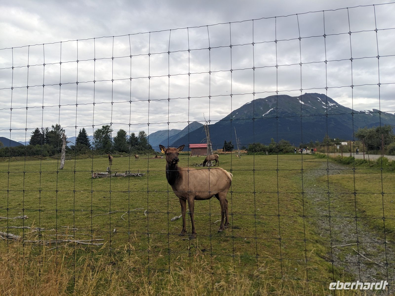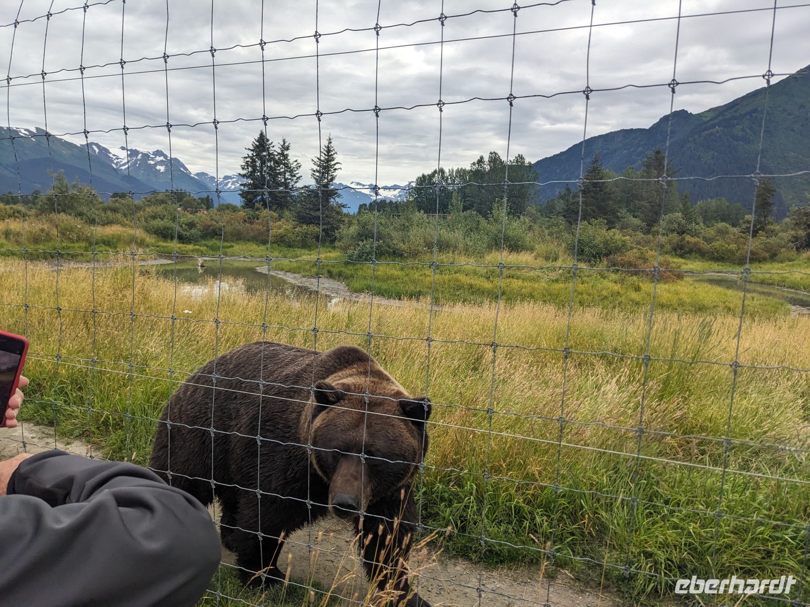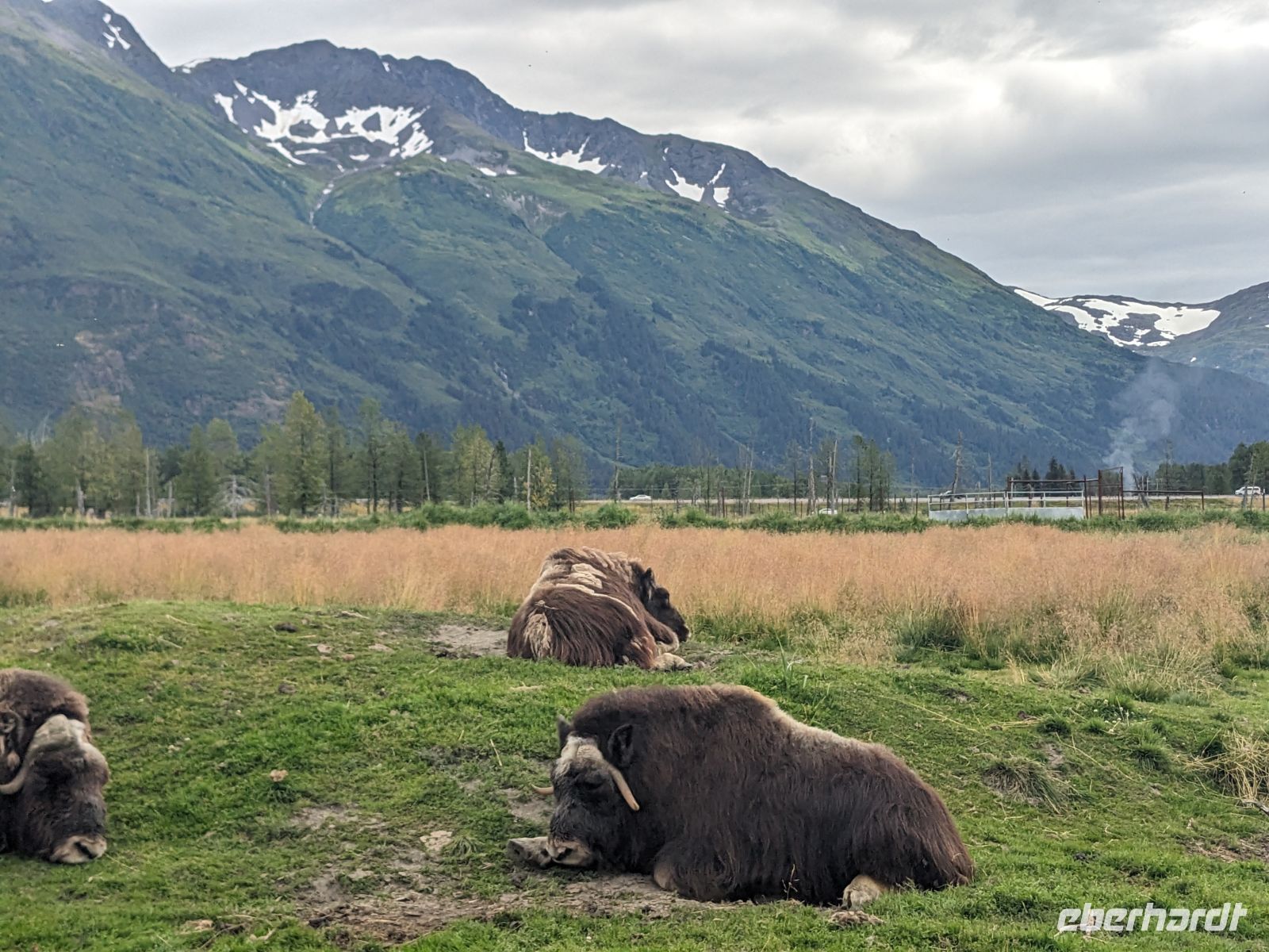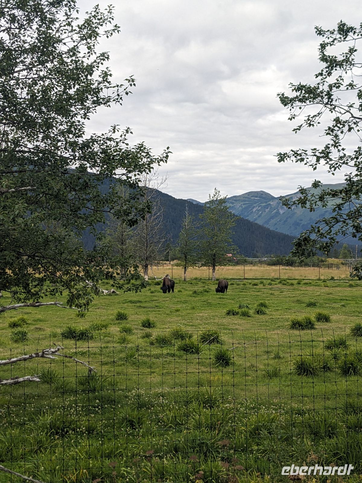 Kurz darauf erreichten wir das Portage Valley mit seinen Gletscherseen. Bei Fotostopps bestaunten wir spiegelglatte Wasserflächen, umgeben von schneebedeckten Bergen. Weiter ging es zum Alaska Wildlife Conservation Center, einer Auffangstation für verletzte oder verwaiste Wildtiere. Hier konnten wir Bären, Elche, Bisons und sogar Moschusochsen aus nächster Nähe sehen – eine tolle Gelegenheit für beeindruckende Fotos und spannende Einblicke in den Artenschutz.