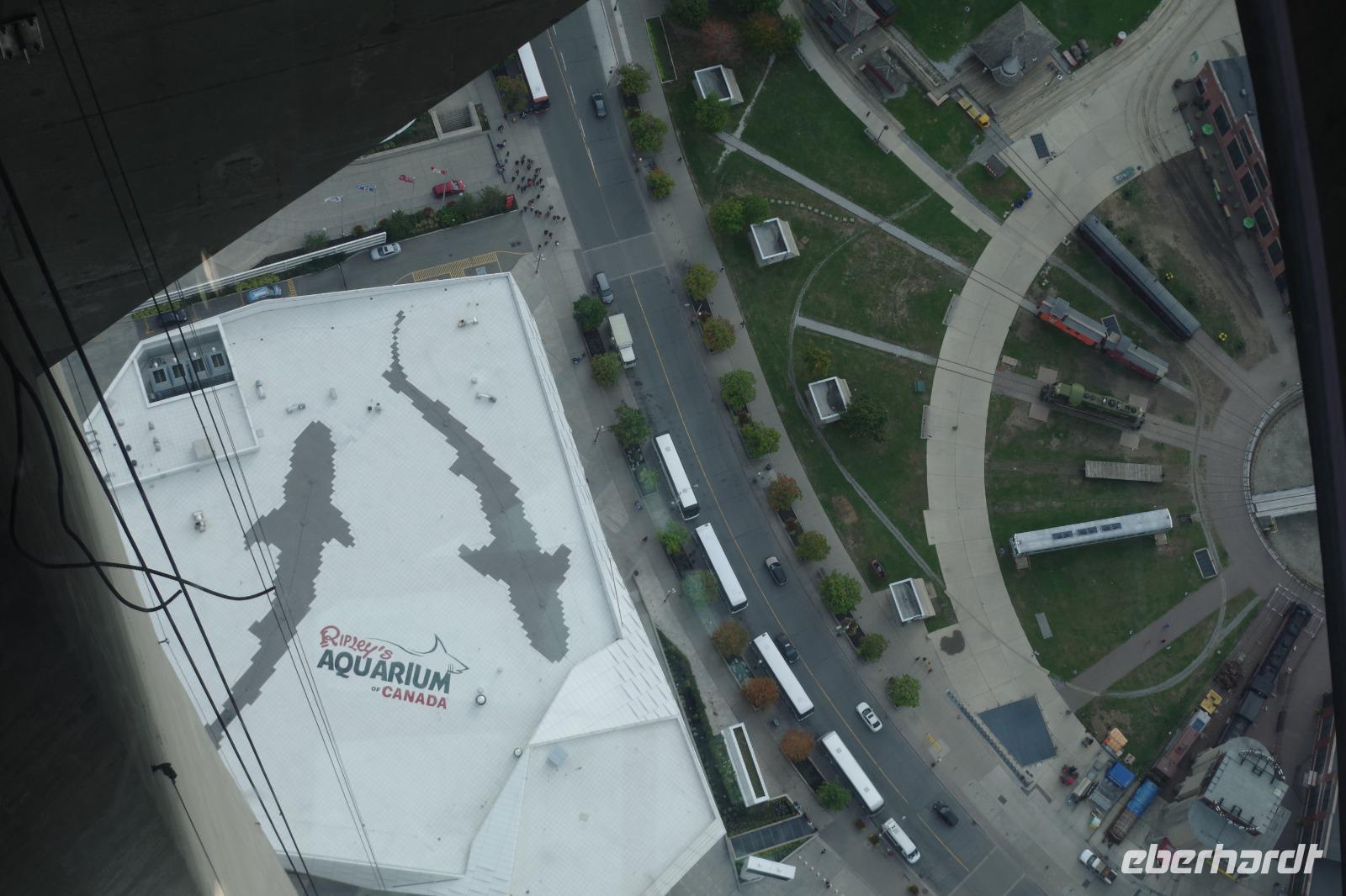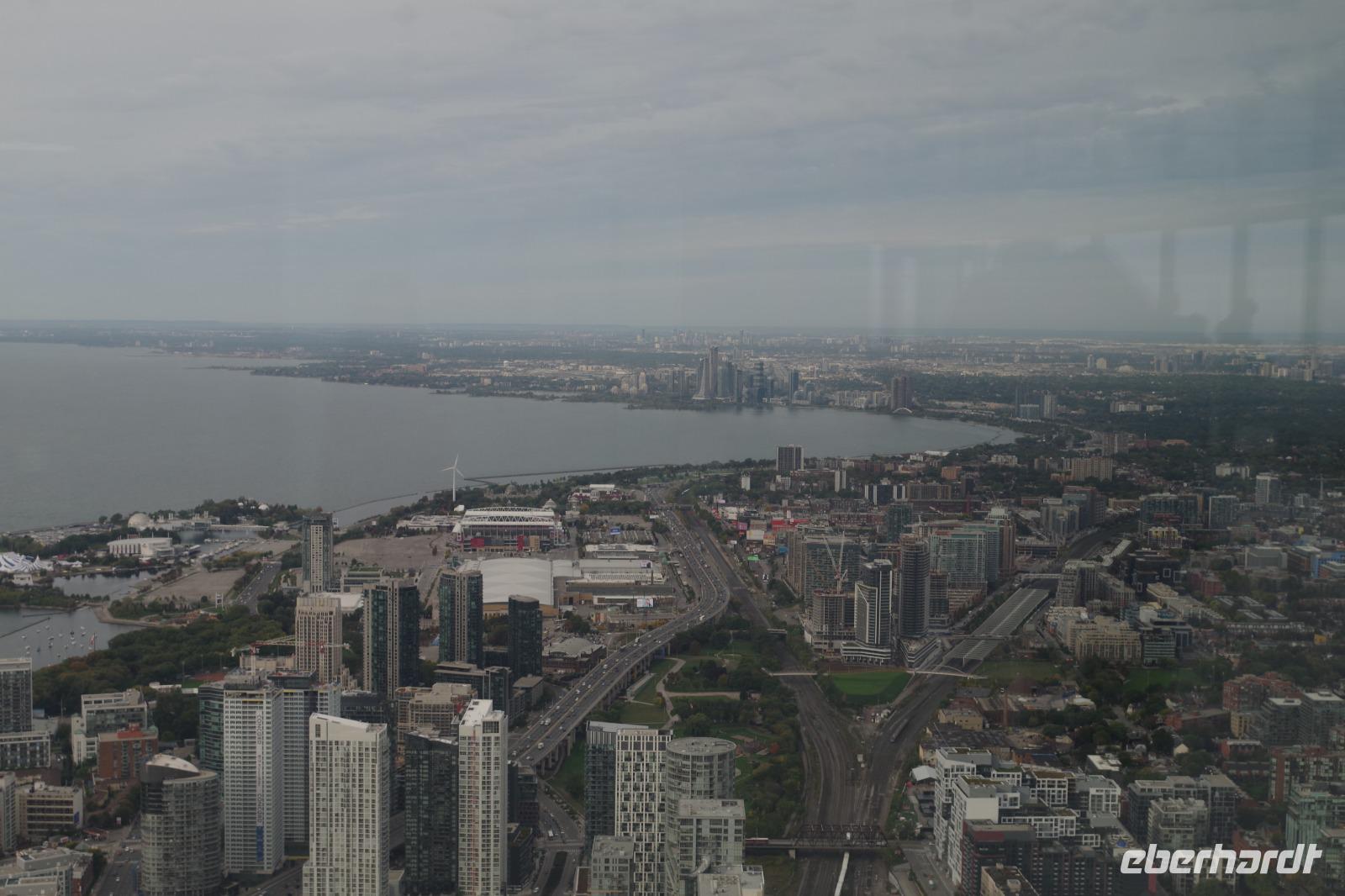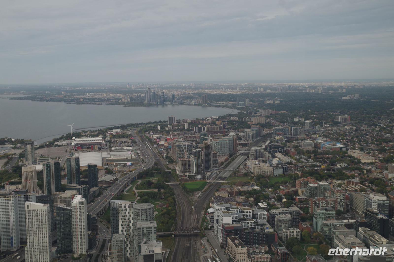 Im Anschluss fuhren wir zum 553 m hohen CN Tower, von dem wir einen wirklich tollen Ausblick hatten. Wir besuchten die beiden Aussichtsplattformen und konnten so wunderbare Ausblicke auf die Stadt mit den Wolkenkratzern, aber auch auf den Lake Ontario genießen.