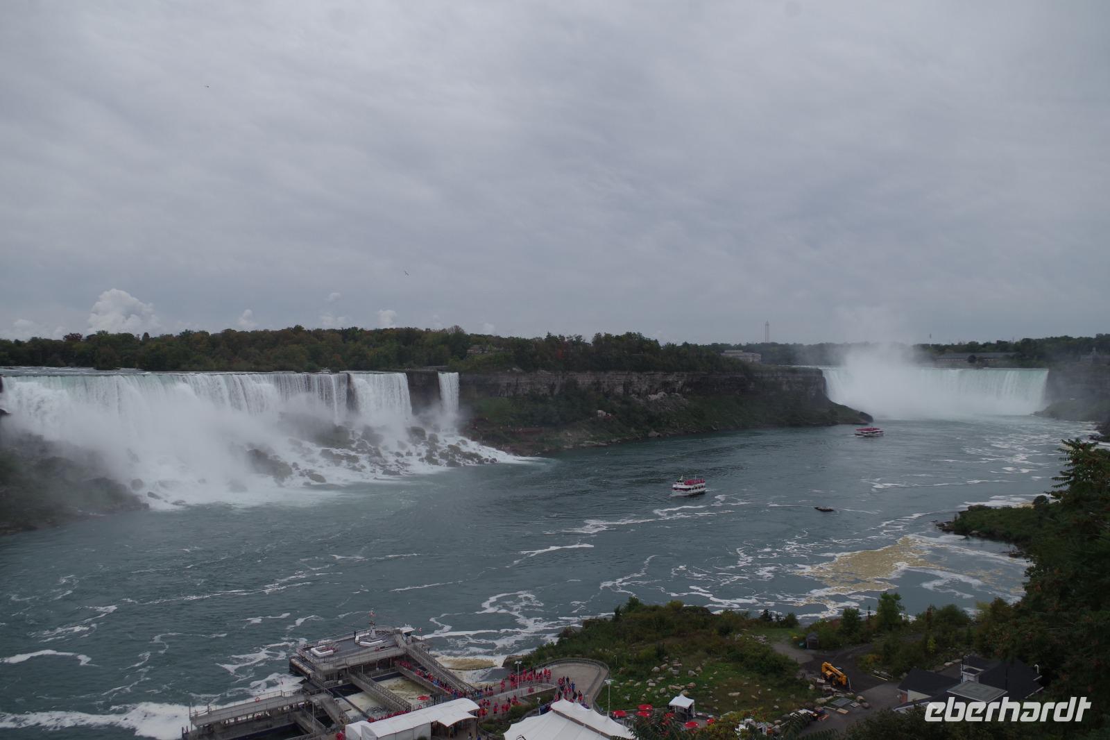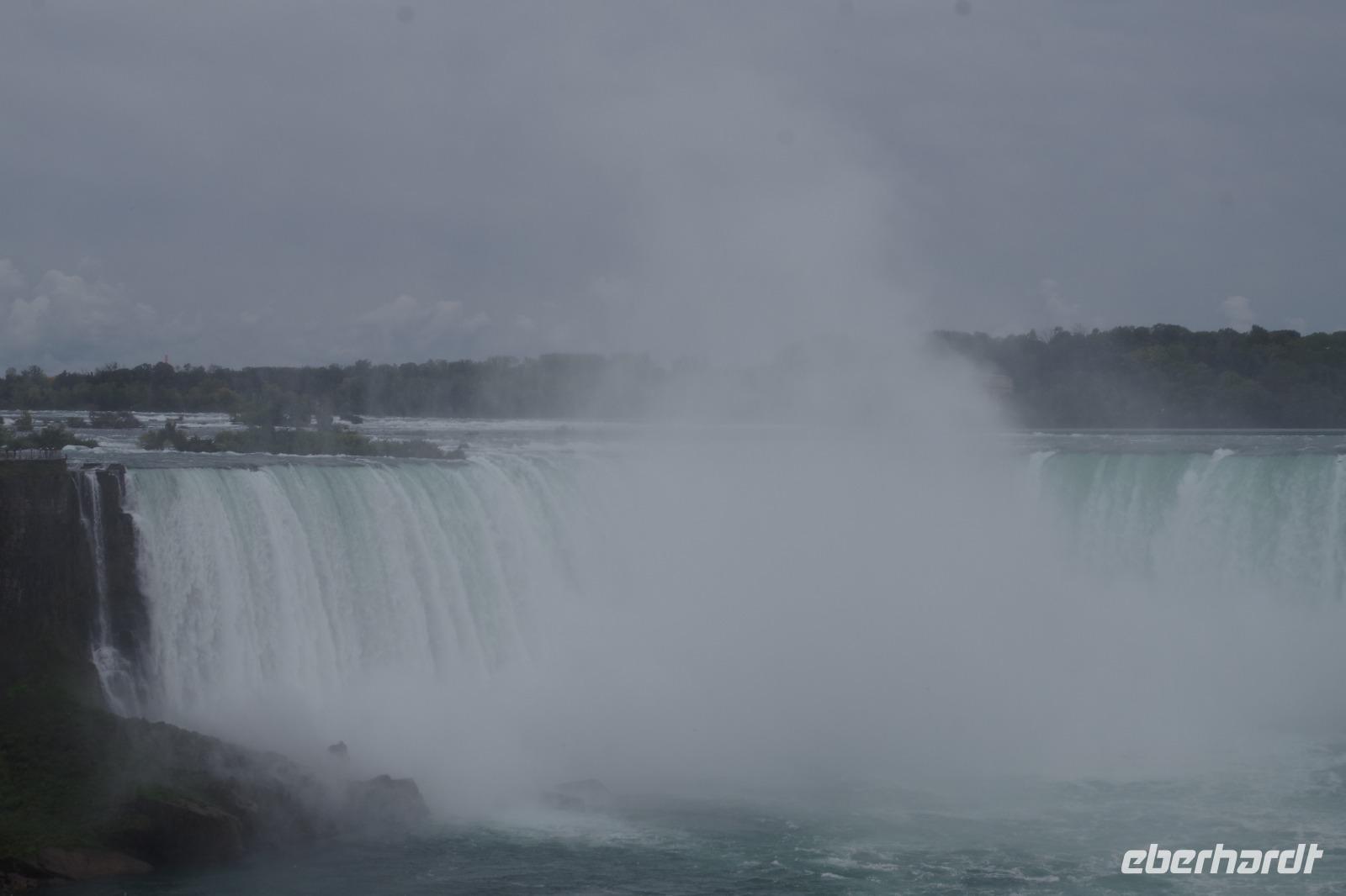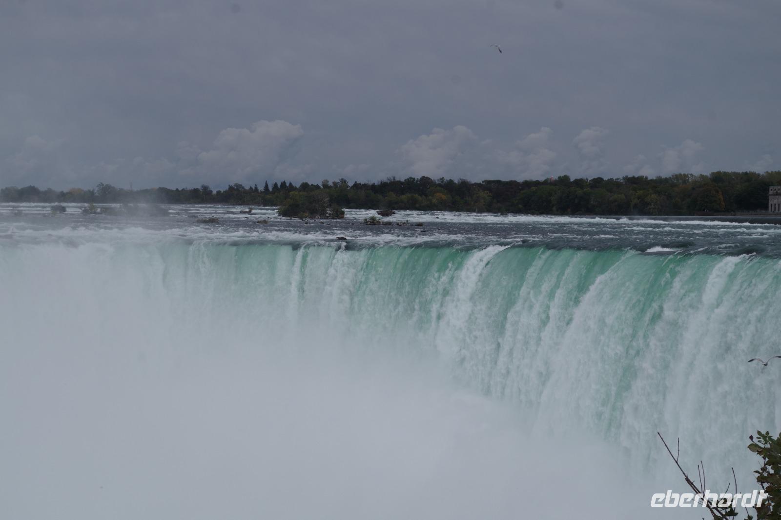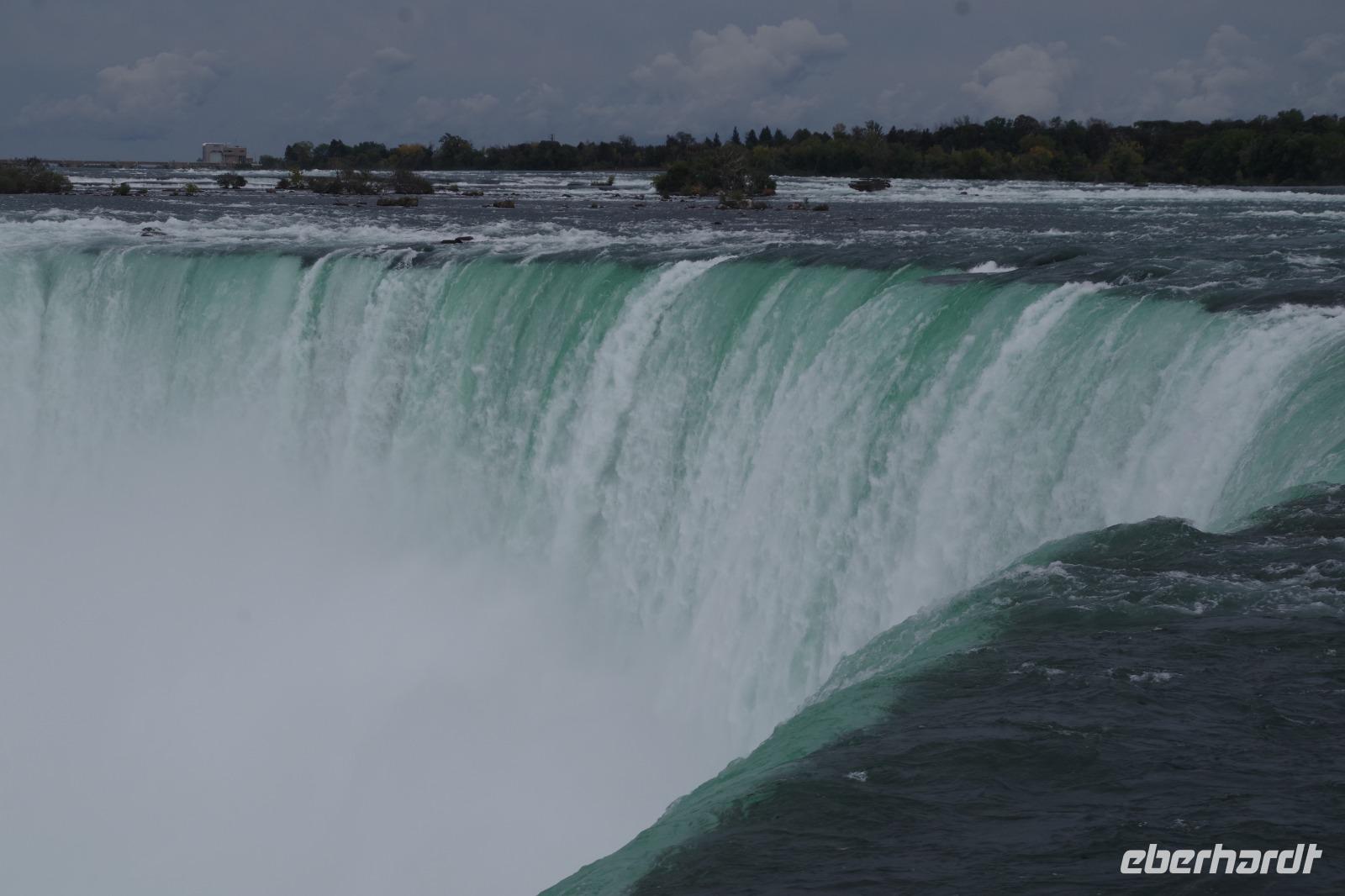 Danach startete unserer Fahrt in Richtung der Niagara Fälle. Wir fuhren dabei auch durch den schönen, kleinen Ort Niagara on the Lake, hielten nochmal am sogenannten Whirlpool der Niagara Fälle und erreichten diese dann endlich. Durchschnittlich stürzen dort 6 Millionen Liter Wasser pro Sekunde herunter. Die Niagara Fälle werden auch für die Stromerzeugung genutzt, weswegen man nur etwa 60 Prozent der Wassermassen sehen kann. Im Winter und in der Nacht fließen sogar nur 30 Prozent des Wassers über die Fälle. Damit soll verhindert werden, dass die Wasserfälle noch mehr wandern. Die Wasserfälle befinden sich mittlerweile schon ganze 11 km in südlicher Richtung entfernt vom ursprünglichen Standort. Aufgrund der Einschränkungen kann heute nur noch eine Bewegung von etwa 10 cm pro Jahr vernommen werden.