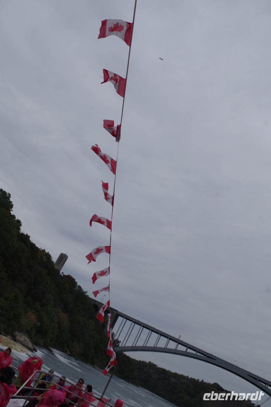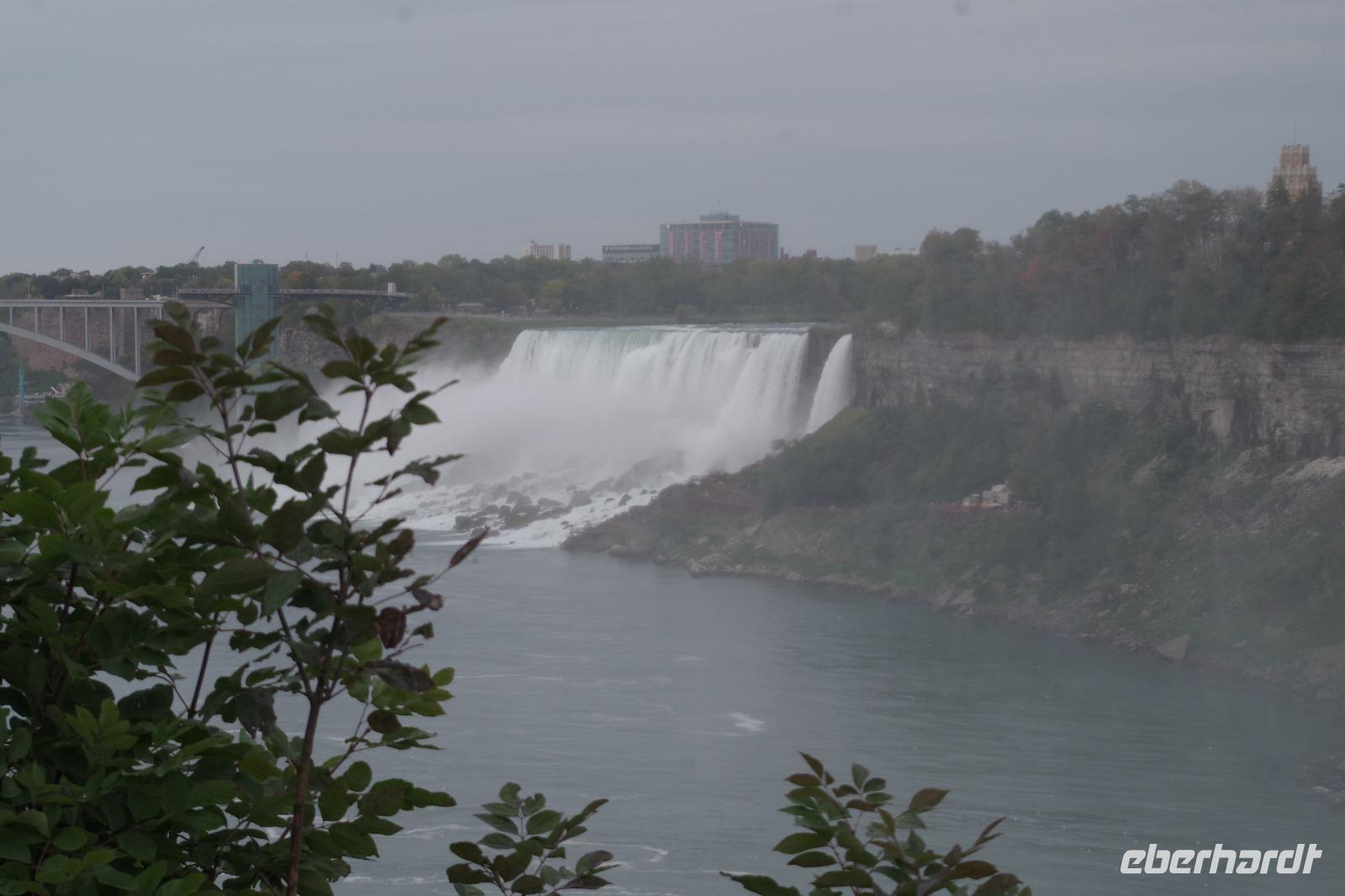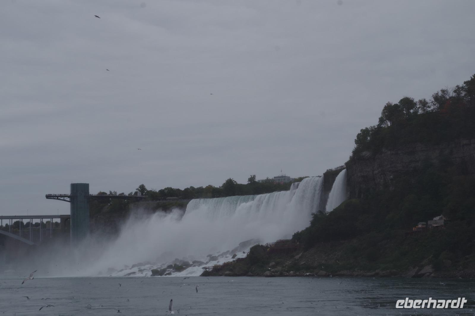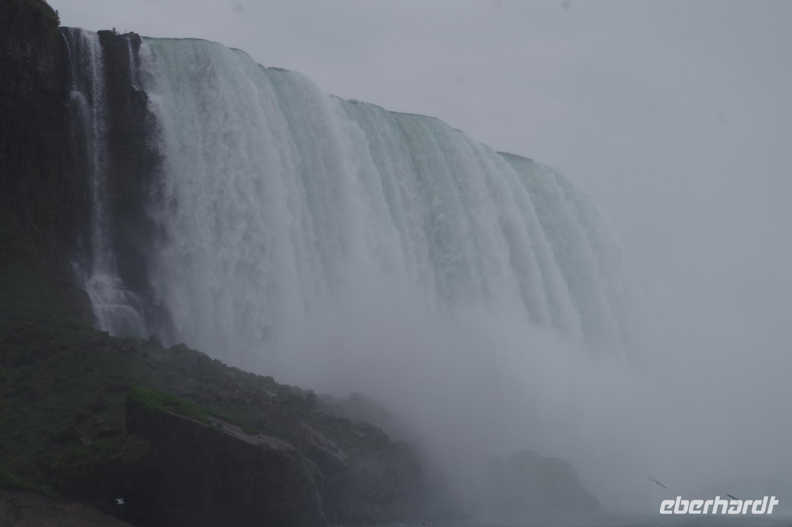 Danach startete unserer Fahrt in Richtung der Niagara Fälle. Wir fuhren dabei auch durch den schönen, kleinen Ort Niagara on the Lake, hielten nochmal am sogenannten Whirlpool der Niagara Fälle und erreichten diese dann endlich. Durchschnittlich stürzen dort 6 Millionen Liter Wasser pro Sekunde herunter. Die Niagara Fälle werden auch für die Stromerzeugung genutzt, weswegen man nur etwa 60 Prozent der Wassermassen sehen kann. Im Winter und in der Nacht fließen sogar nur 30 Prozent des Wassers über die Fälle. Damit soll verhindert werden, dass die Wasserfälle noch mehr wandern. Die Wasserfälle befinden sich mittlerweile schon ganze 11 km in südlicher Richtung entfernt vom ursprünglichen Standort. Aufgrund der Einschränkungen kann heute nur noch eine Bewegung von etwa 10 cm pro Jahr vernommen werden.