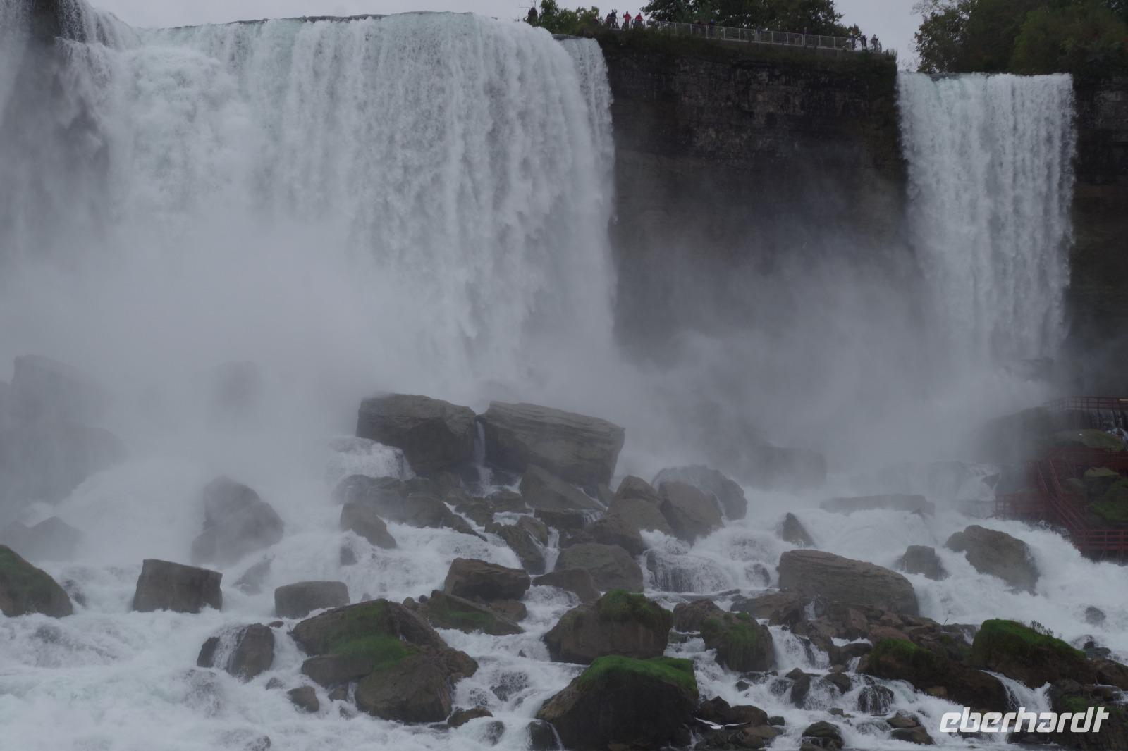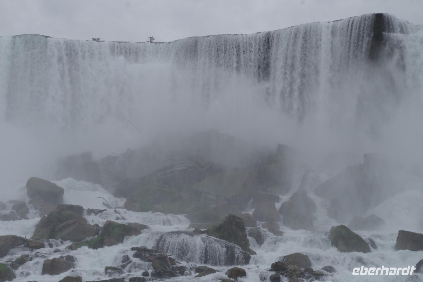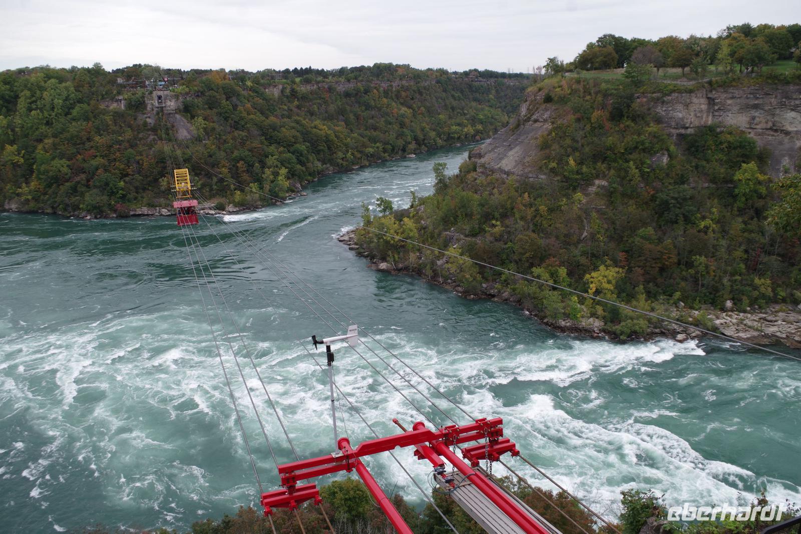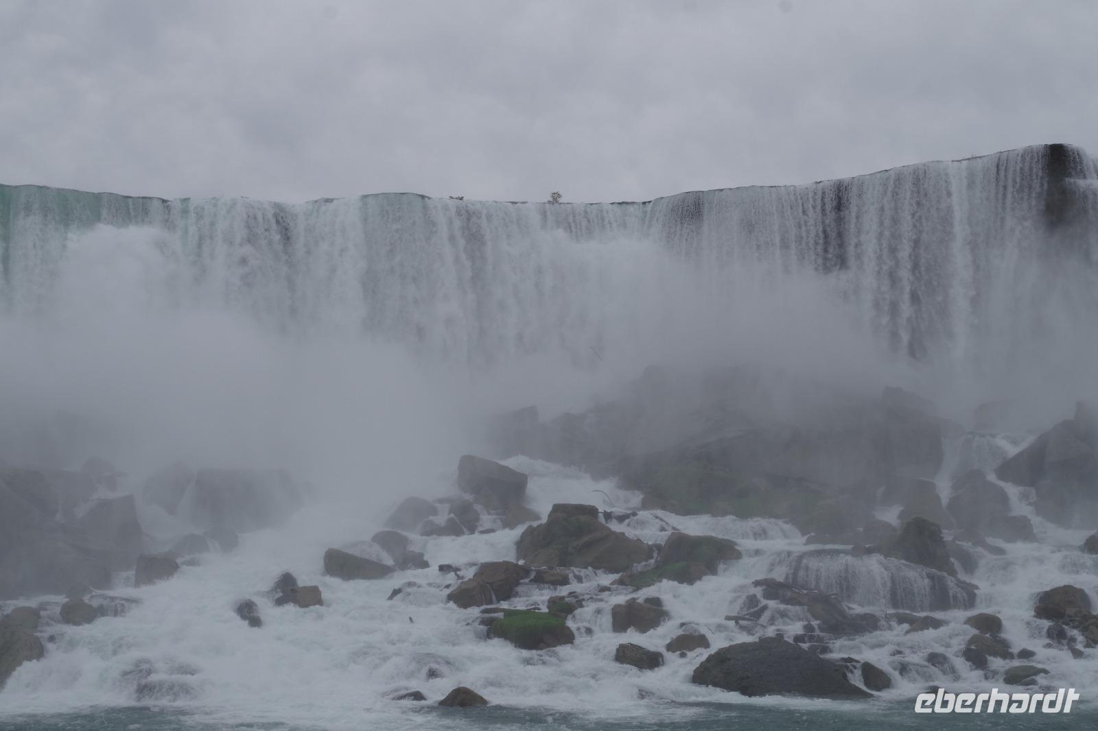 Danach startete unserer Fahrt in Richtung der Niagara Fälle. Wir fuhren dabei auch durch den schönen, kleinen Ort Niagara on the Lake, hielten nochmal am sogenannten Whirlpool der Niagara Fälle und erreichten diese dann endlich. Durchschnittlich stürzen dort 6 Millionen Liter Wasser pro Sekunde herunter. Die Niagara Fälle werden auch für die Stromerzeugung genutzt, weswegen man nur etwa 60 Prozent der Wassermassen sehen kann. Im Winter und in der Nacht fließen sogar nur 30 Prozent des Wassers über die Fälle. Damit soll verhindert werden, dass die Wasserfälle noch mehr wandern. Die Wasserfälle befinden sich mittlerweile schon ganze 11 km in südlicher Richtung entfernt vom ursprünglichen Standort. Aufgrund der Einschränkungen kann heute nur noch eine Bewegung von etwa 10 cm pro Jahr vernommen werden.