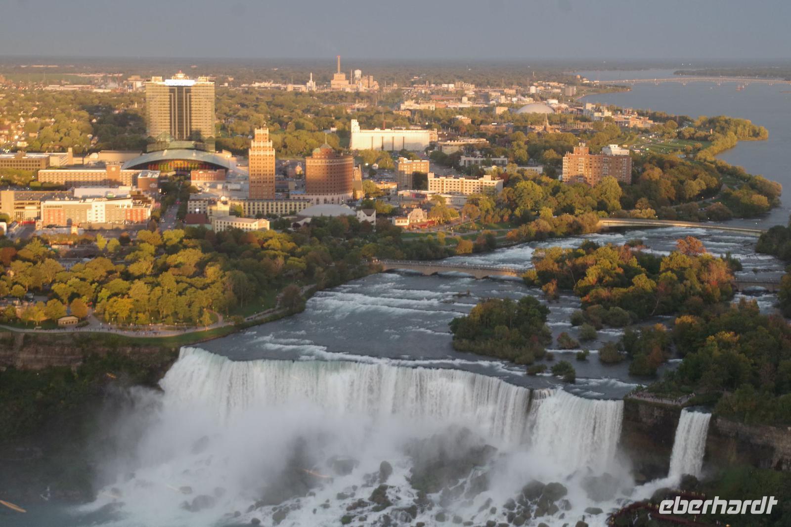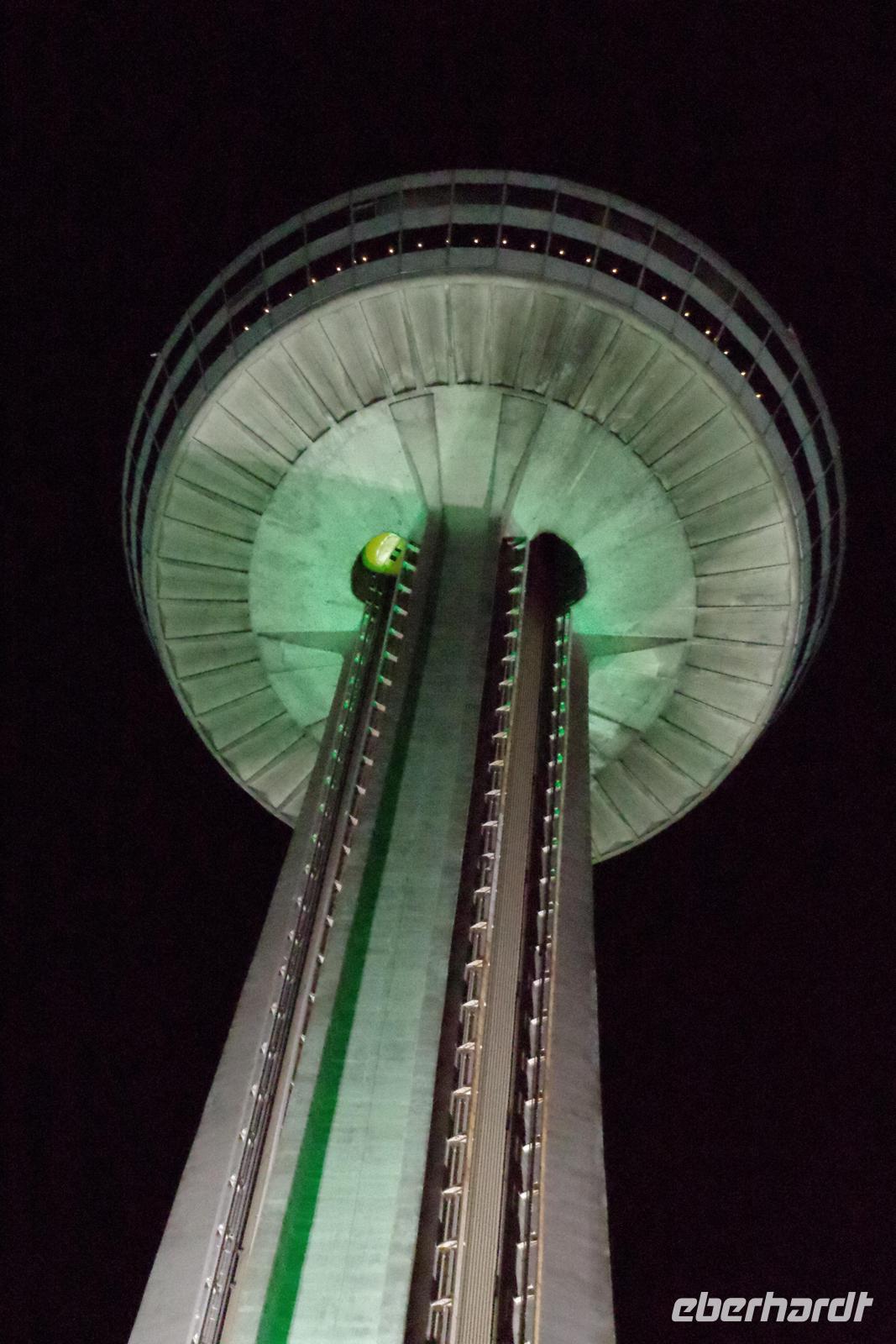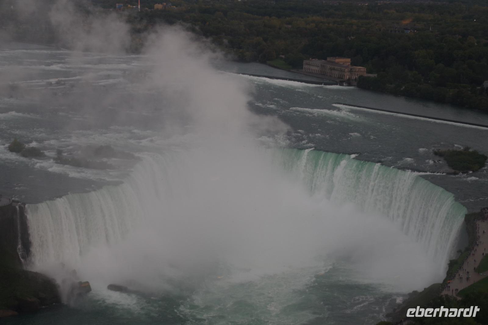 Anschließend war noch Zeit, die Wucht der Fälle bei einem Spaziergang an der Promenade zu bestaunen. Auch der Rest des Tages war ganz den Niagara Fällen gewidmet. Für uns stand noch ein Abendessen auf dem Skylon Tower an, von wo wir die Fälle noch einmal von oben bestaunen konnten. Mit Einbruch der Dunkelheit wurden diese sogar in verschiedenen Farben angeleuchtet.