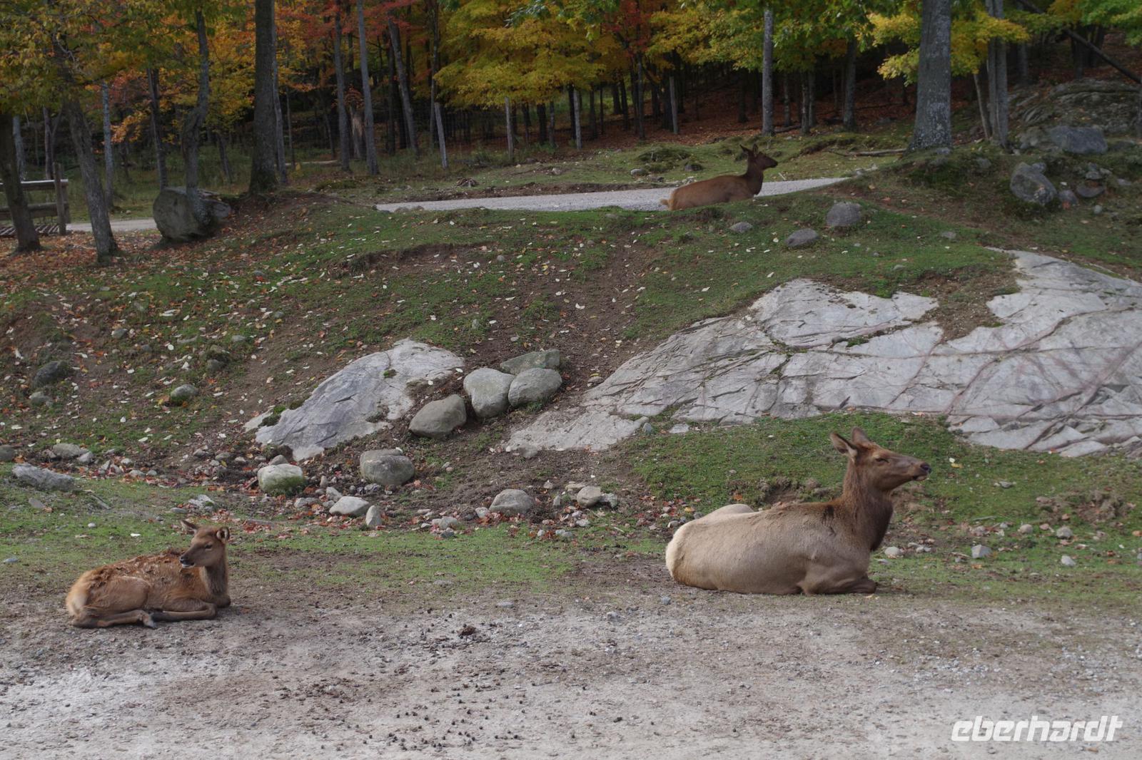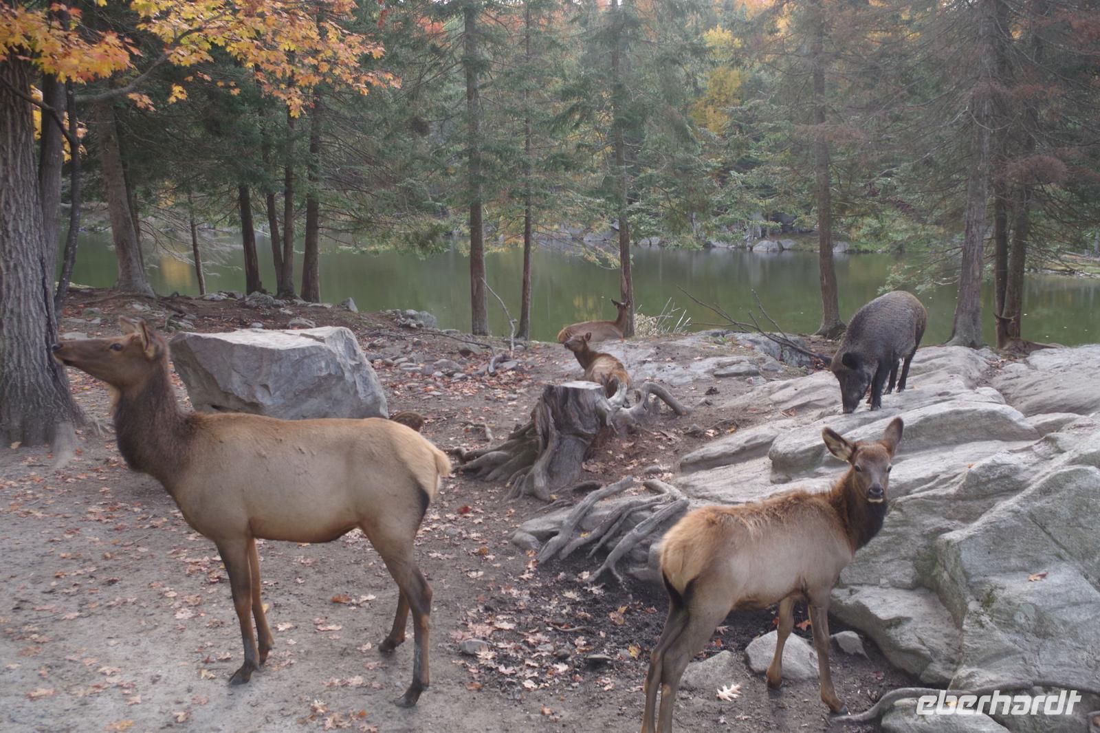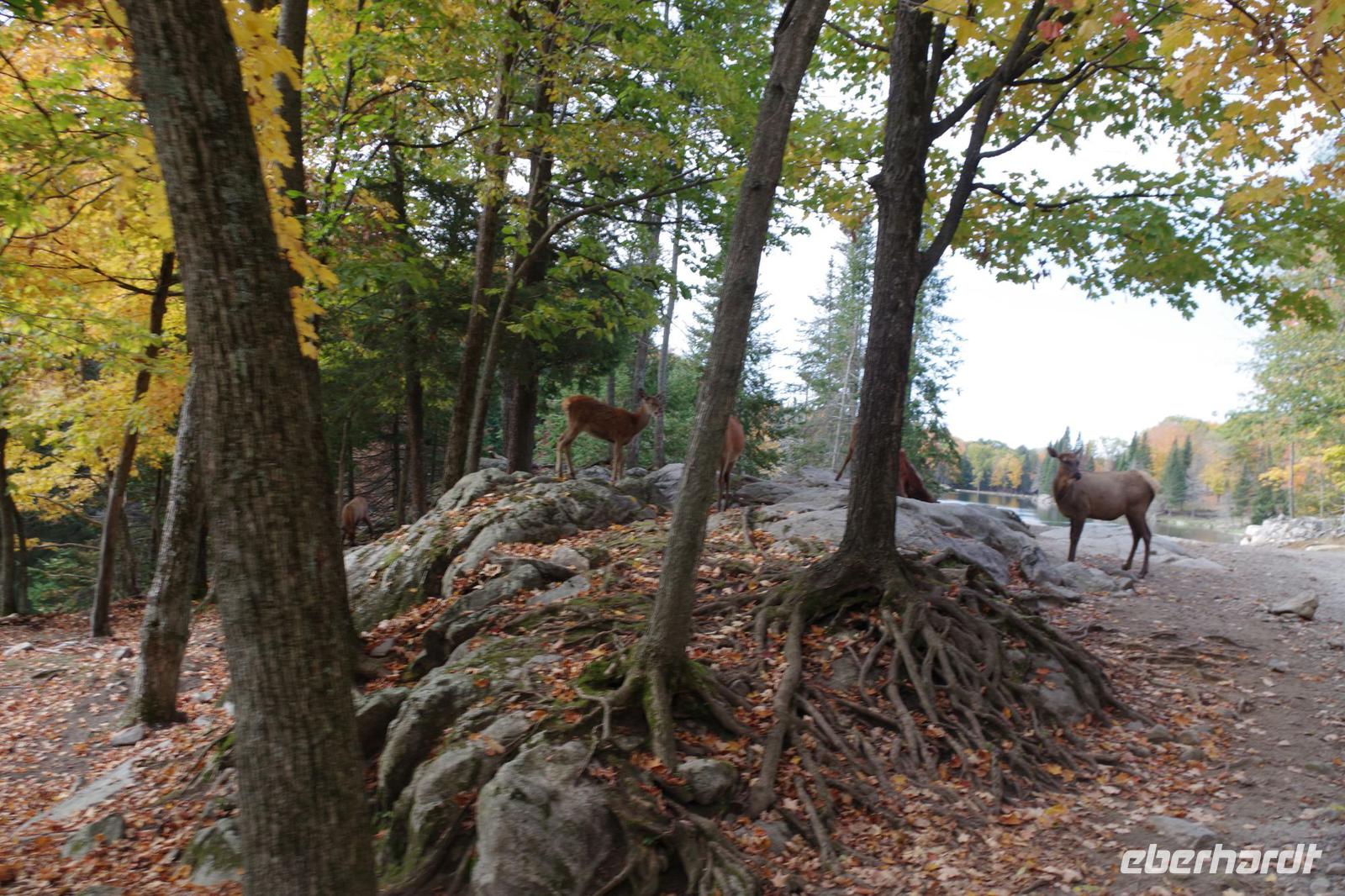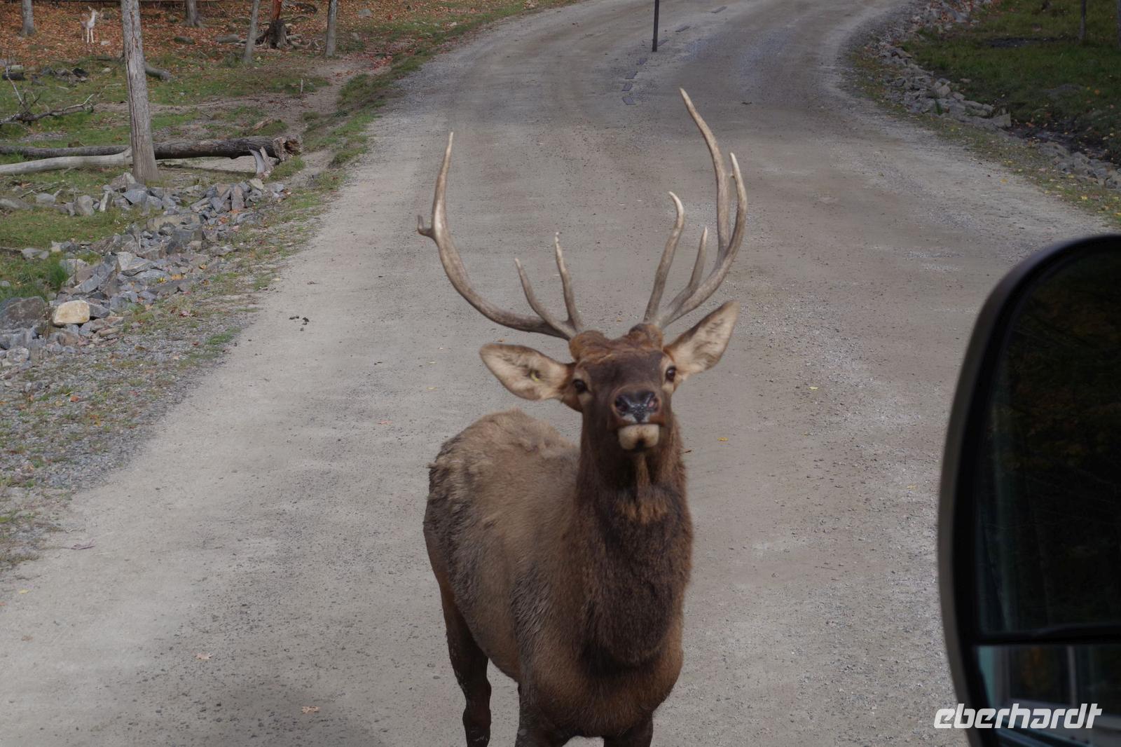 Heute reisten wir weiter nach Montreal. Auf dem Weg dahin besuchten wir den Omega Wildlife Park, wo wir in einen anderen Bus umstiegen. In diesem konnte man die Fenster öffnen, so dass wir die Tiere besser beobachten konnten. Auch Möhren wurde zum Füttern verteilt, durch die offenen Fenster ging das super. Es war eine wirklich abwechslunsreiche Fahrt durch den Park. Wir sahen jede Menge Hirsche und Rehe, aber beispielsweise auch Kojoten, Bergziegen, Bisons, Wölfe, einen Elch und Zimtbären.