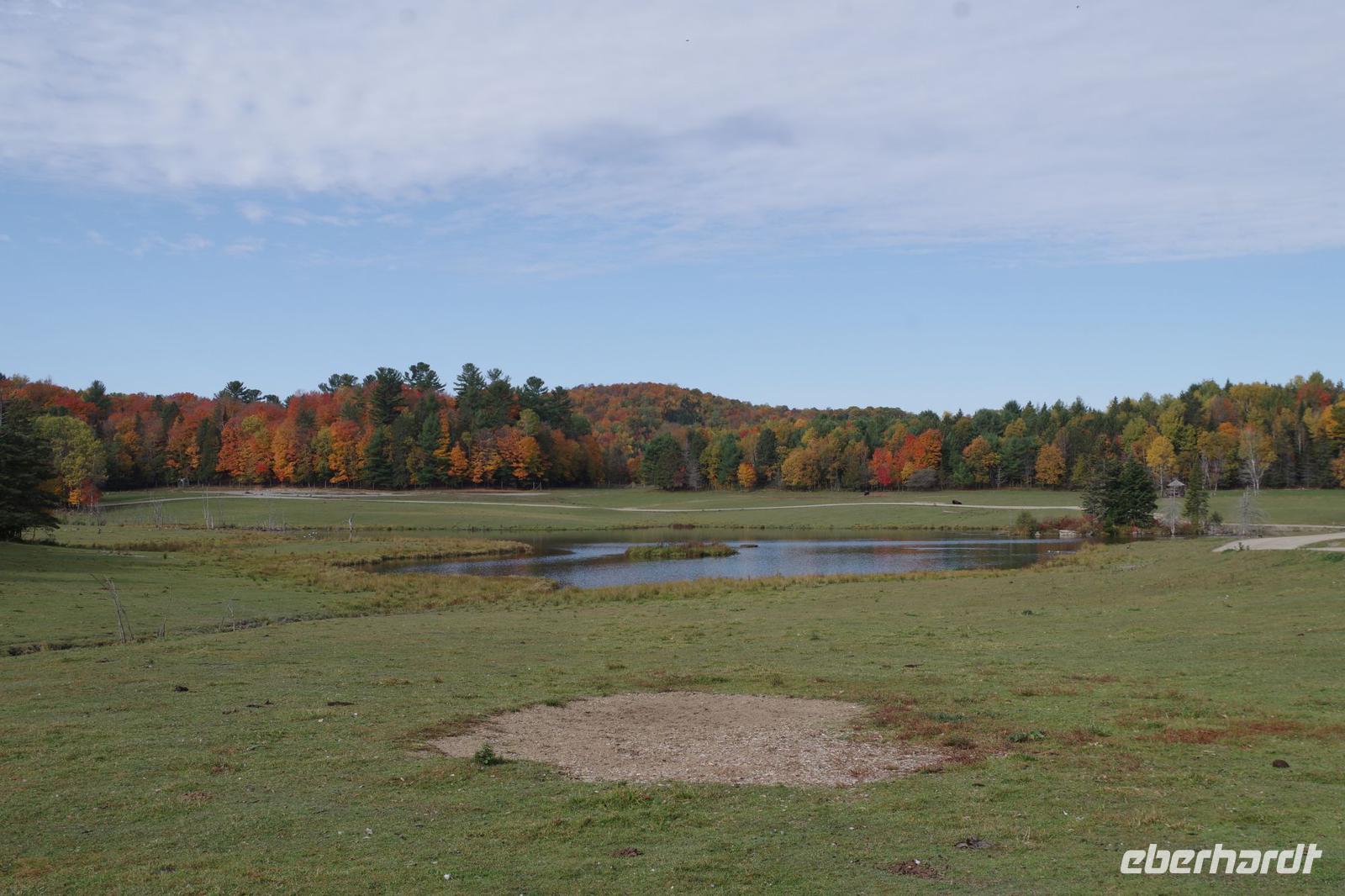 Weiter führte uns die Busfahrt dann entlang Landstraßen, von denen wir den Indian Summer mit der orangeroten Laubfärbung wieder wirklich wunderbar betrachten konnten. Währenddessen erklärte Margarith uns einiges zum so bekannten Ahornsirup. Dieser befindet sich im Ahornbaum zwischen der Rinde und dem Holz, sodass die Gewinnung recht aufwendig ist. Die Entdeckung dessen war tatsächlich ein Zufall. Indianer entdeckten einst, wie der Saft vom Baum tropfte und es wurde zunächst Tee daraus gekocht. Einmal wurde dieser aber im Topf vergessen, sodass er dick wurde - zum Sirup also. Der Saft besteht zunächst zu 98 Prozent aus Wasser und zu zwei Prozent aus Zucker. Er wird dann so lange gekocht, bis der Zuckergehalt 66 Prozent beträgt. Die Indianer stellten fest, dass es wirklich gut schmeckt und stellten den Sirup von nun an immer wieder her. Man benötigt allerdings 40 Liter Ahornsaft, um 12 Liter Ahornsirup herzustellen. In Kanada verwendet man den Sirup beispielsweise für Pfannkuchen, aber auch zum Verfeinern von Braten oder Schinken.