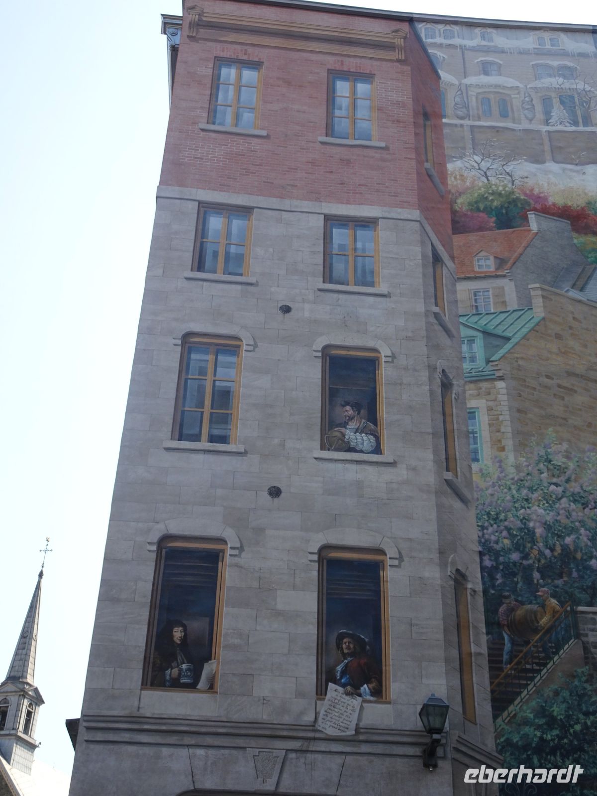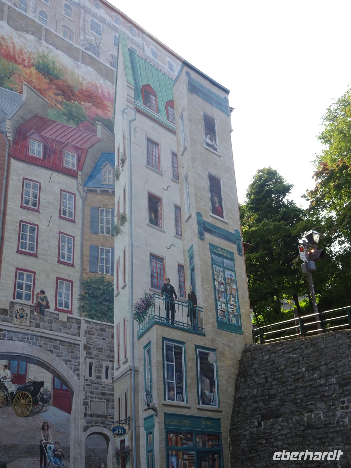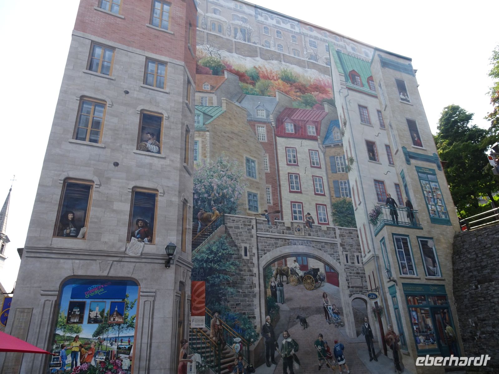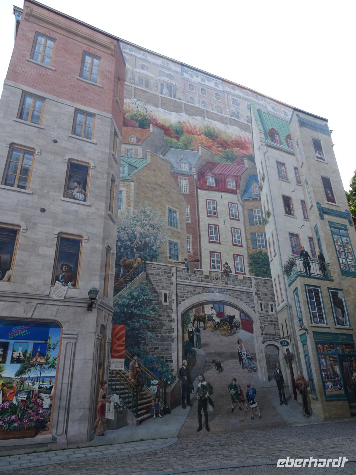 Ein kurzes frühes Frühstück und schon heißt es wieder, Koffer verladen und weiterfahren. Noch in Montreal legen wir einen kurzen Fotostopp am Olympiazentrum ein. Bis nach Québec benötigen wir etwa vier Stunden. Zum Mittagessen halten wir in der Oberstadt von „3-Flüsse“. Hier befindet sich ein großer Supermarkt, Tim Hortens und natürlich Mac Donald. Gegen 13 Uhr erreichen wir Québec und treffen unsere Stadtführerin, auch sie stammt aus der Schweiz. Heute findet in Québec ein internationales Radrennen statt. Die Straßen sind abgesperrt und von Menschen, die den Radfahrern zujubeln gesäumt. Wir spazieren durch Ober- und Unterstadt, immer auf der Hut, niemanden zu verlieren. Die Zeit ist ziemlich knapp, dennoch gelingt es einigen, Ansichtskarten zu ergattern. Den letzten Fotostopp legen wir an einer kunstvoll bemalten Häuserfassade ein, auf der sich die Geschichte der Stadt widerspiegelt.