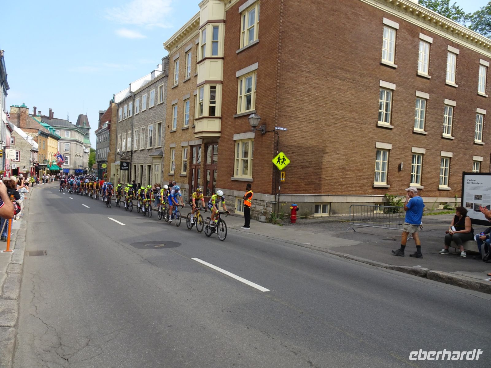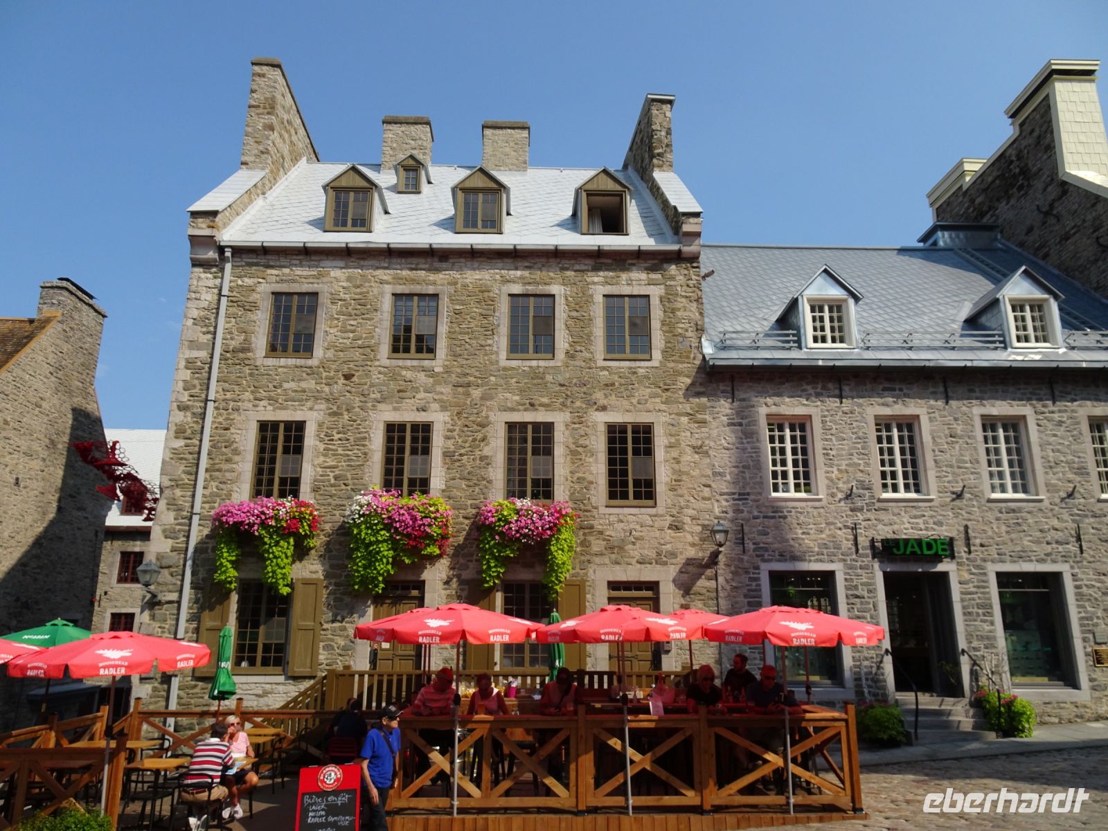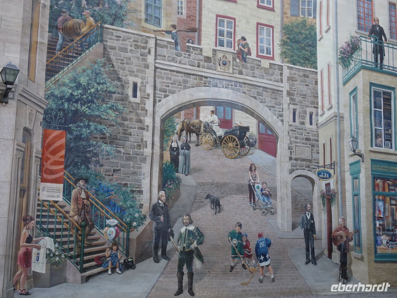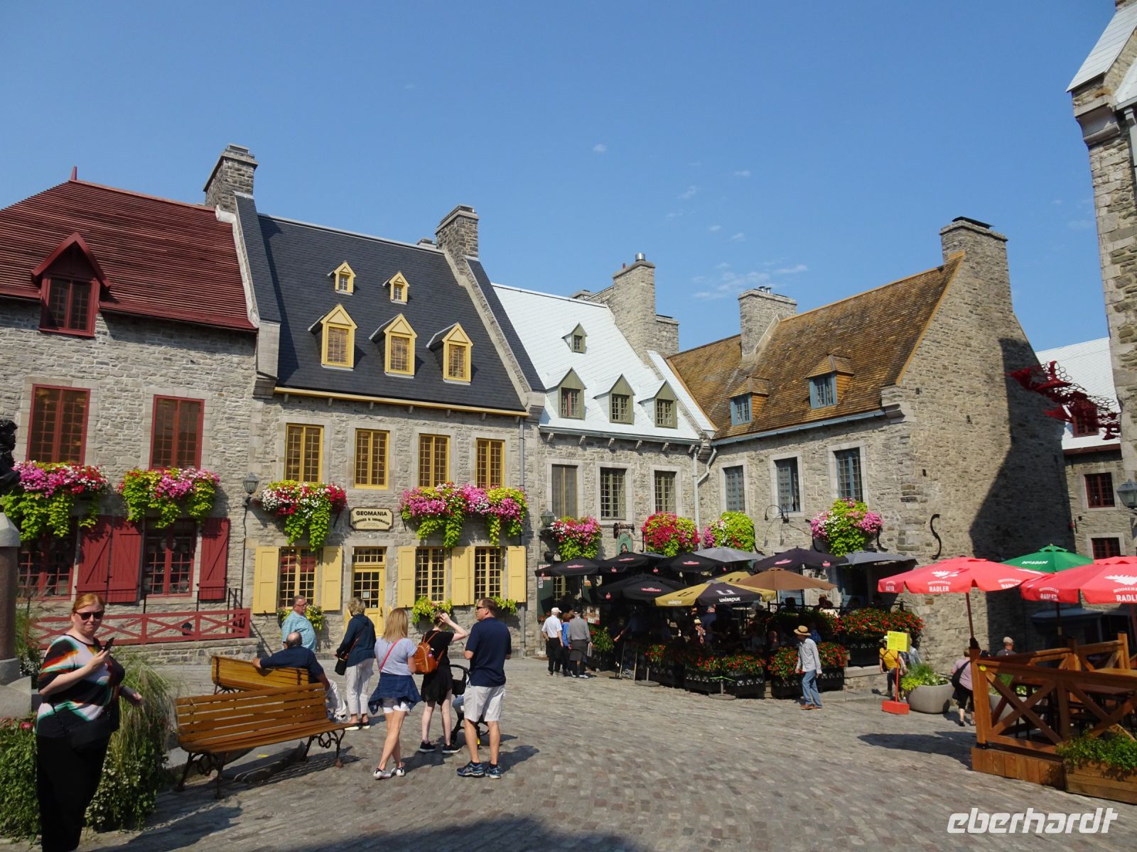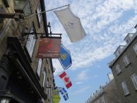 Ein kurzes frühes Frühstück und schon heißt es wieder, Koffer verladen und weiterfahren. Noch in Montreal legen wir einen kurzen Fotostopp am Olympiazentrum ein. Bis nach Québec benötigen wir etwa vier Stunden. Zum Mittagessen halten wir in der Oberstadt von „3-Flüsse“. Hier befindet sich ein großer Supermarkt, Tim Hortens und natürlich Mac Donald. Gegen 13 Uhr erreichen wir Québec und treffen unsere Stadtführerin, auch sie stammt aus der Schweiz. Heute findet in Québec ein internationales Radrennen statt. Die Straßen sind abgesperrt und von Menschen, die den Radfahrern zujubeln gesäumt. Wir spazieren durch Ober- und Unterstadt, immer auf der Hut, niemanden zu verlieren. Die Zeit ist ziemlich knapp, dennoch gelingt es einigen, Ansichtskarten zu ergattern. Den letzten Fotostopp legen wir an einer kunstvoll bemalten Häuserfassade ein, auf der sich die Geschichte der Stadt widerspiegelt.