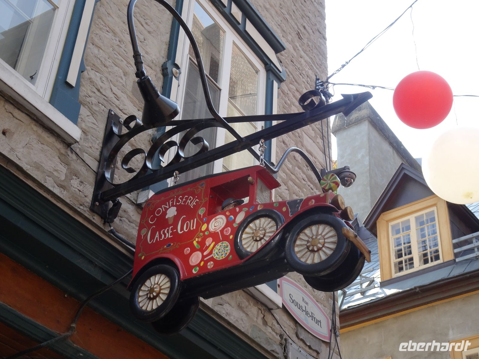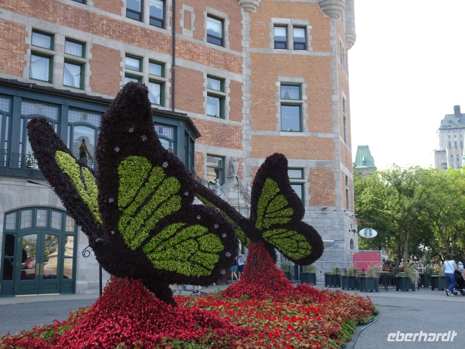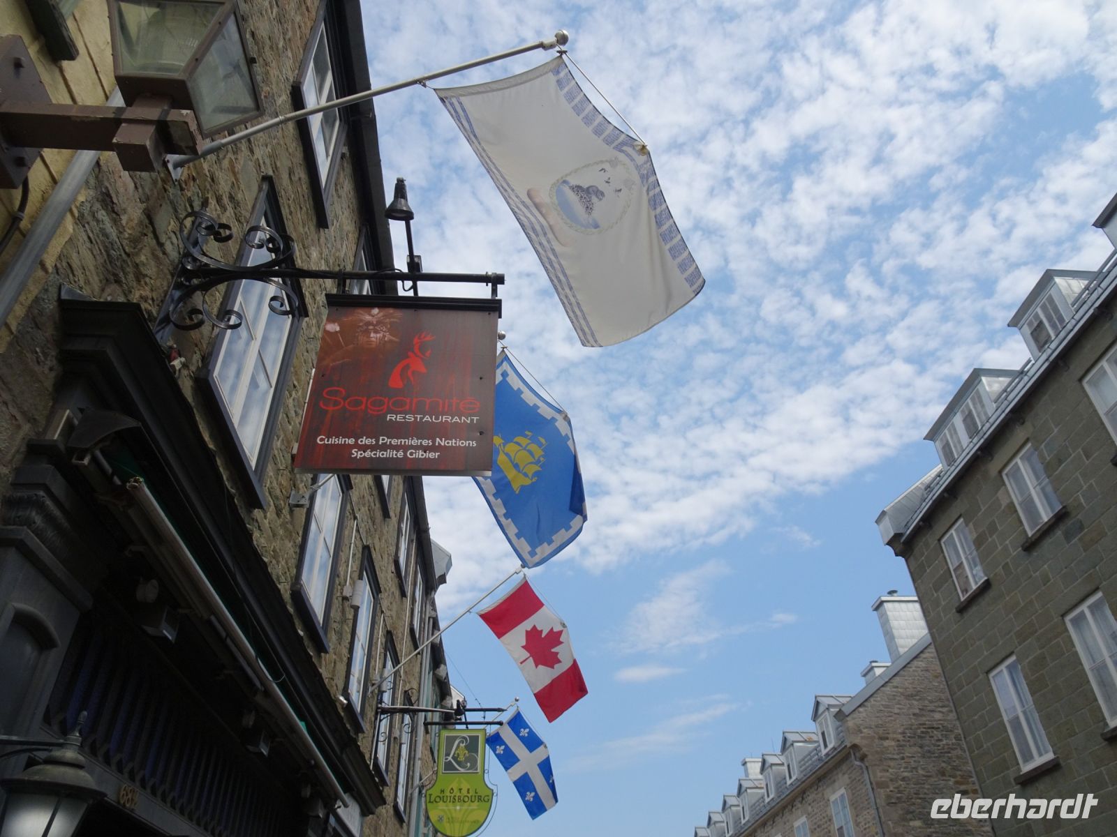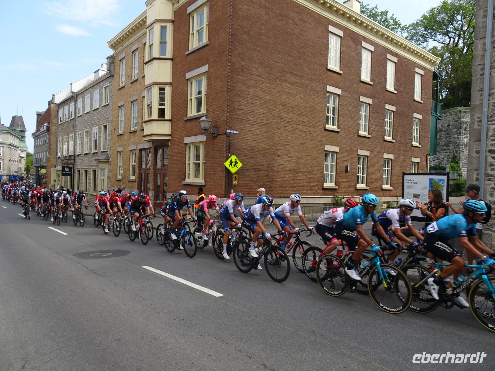 Ein kurzes frühes Frühstück und schon heißt es wieder, Koffer verladen und weiterfahren. Noch in Montreal legen wir einen kurzen Fotostopp am Olympiazentrum ein. Bis nach Québec benötigen wir etwa vier Stunden. Zum Mittagessen halten wir in der Oberstadt von „3-Flüsse“. Hier befindet sich ein großer Supermarkt, Tim Hortens und natürlich Mac Donald. Gegen 13 Uhr erreichen wir Québec und treffen unsere Stadtführerin, auch sie stammt aus der Schweiz. Heute findet in Québec ein internationales Radrennen statt. Die Straßen sind abgesperrt und von Menschen, die den Radfahrern zujubeln gesäumt. Wir spazieren durch Ober- und Unterstadt, immer auf der Hut, niemanden zu verlieren. Die Zeit ist ziemlich knapp, dennoch gelingt es einigen, Ansichtskarten zu ergattern. Den letzten Fotostopp legen wir an einer kunstvoll bemalten Häuserfassade ein, auf der sich die Geschichte der Stadt widerspiegelt.