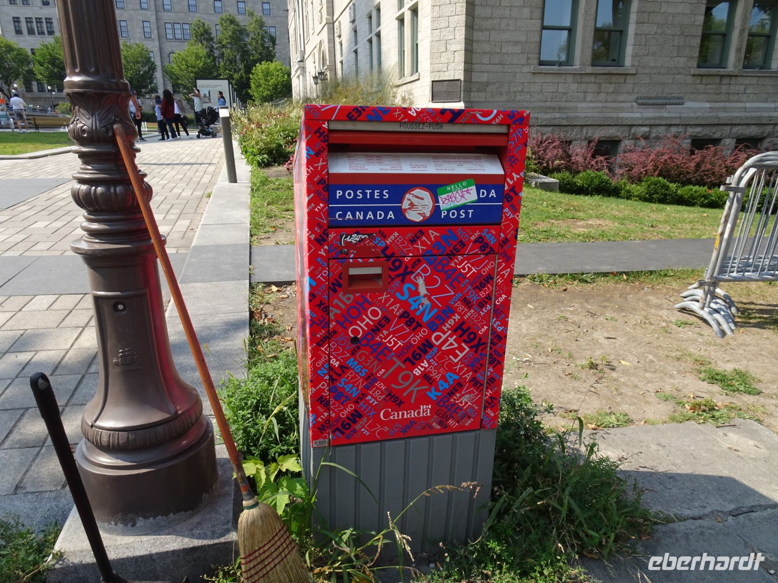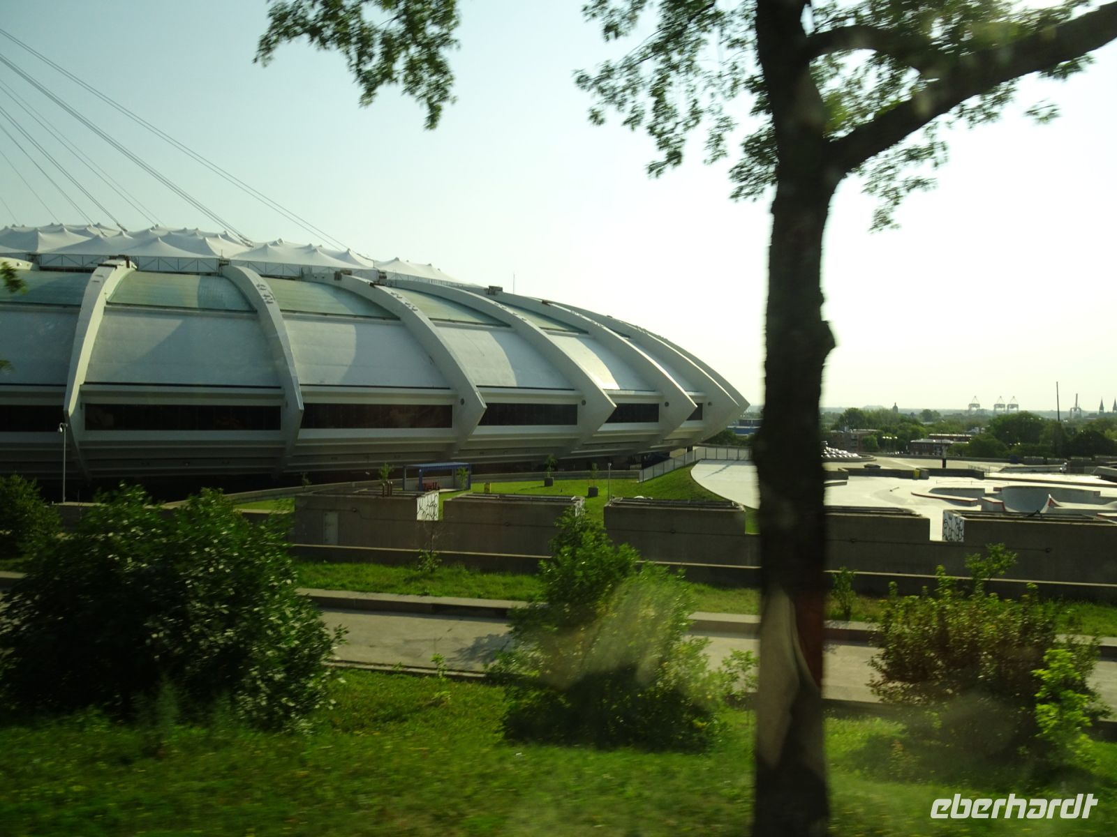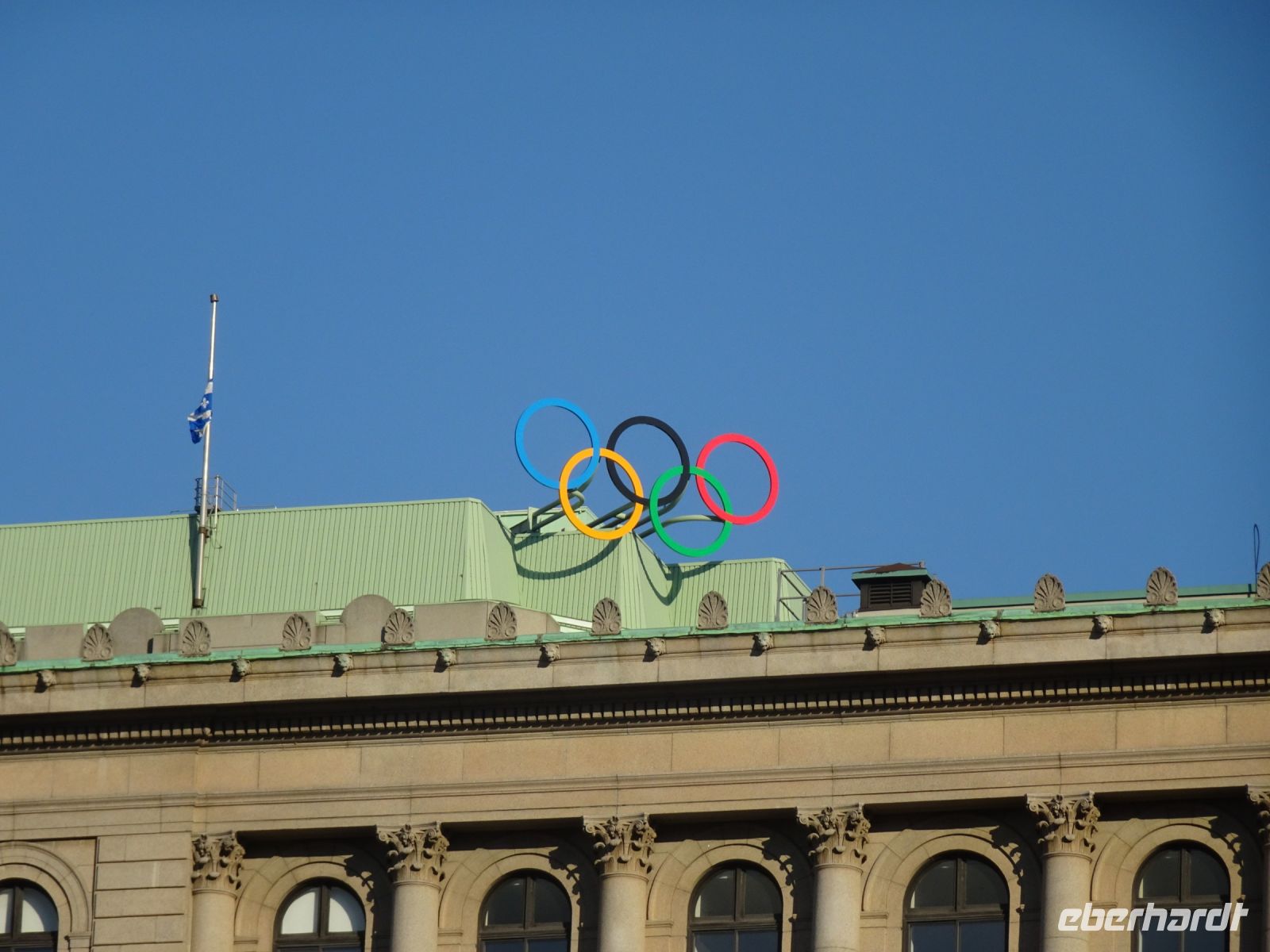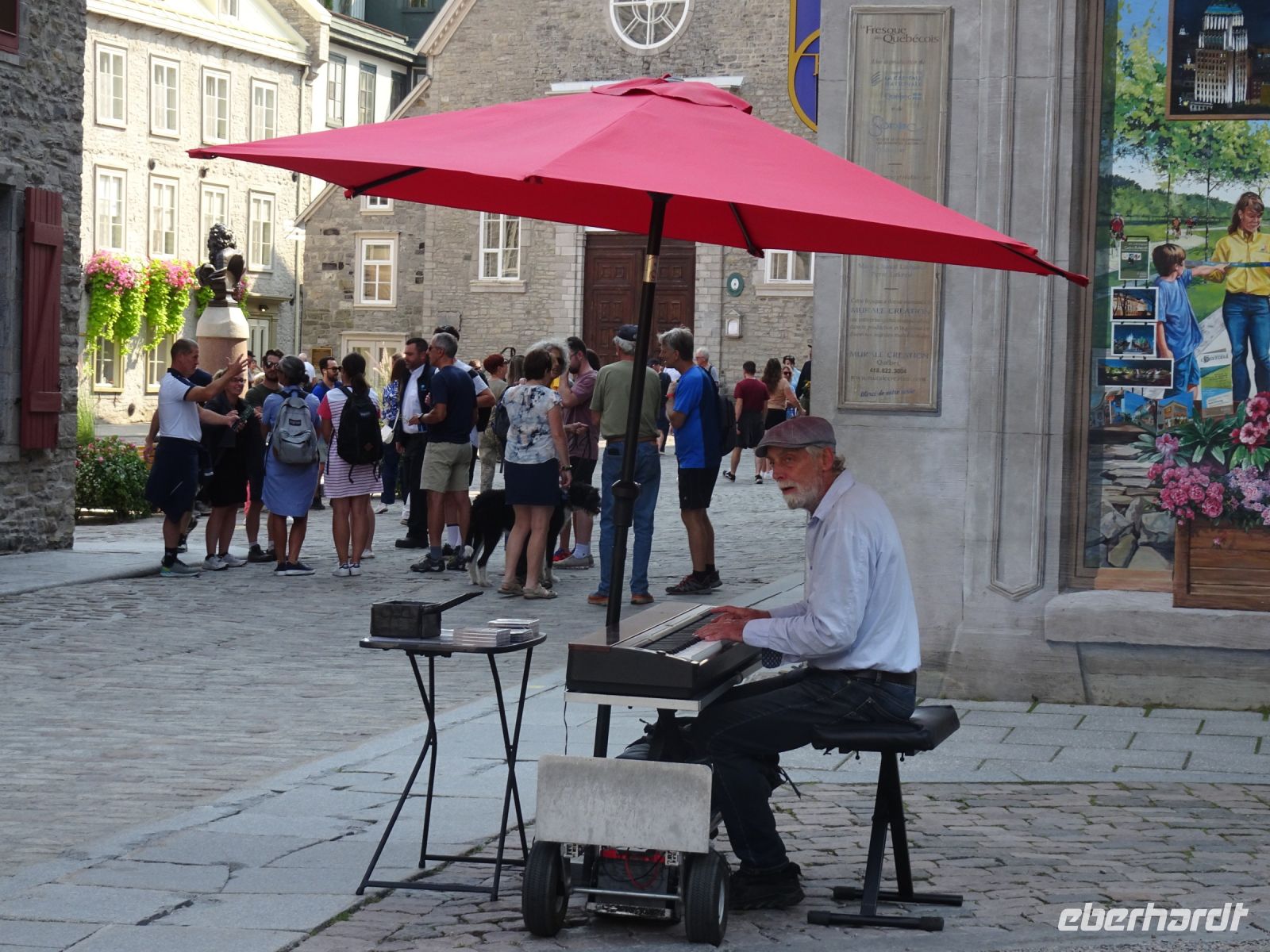 Ein kurzes frühes Frühstück und schon heißt es wieder, Koffer verladen und weiterfahren. Noch in Montreal legen wir einen kurzen Fotostopp am Olympiazentrum ein. Bis nach Québec benötigen wir etwa vier Stunden. Zum Mittagessen halten wir in der Oberstadt von „3-Flüsse“. Hier befindet sich ein großer Supermarkt, Tim Hortens und natürlich Mac Donald. Gegen 13 Uhr erreichen wir Québec und treffen unsere Stadtführerin, auch sie stammt aus der Schweiz. Heute findet in Québec ein internationales Radrennen statt. Die Straßen sind abgesperrt und von Menschen, die den Radfahrern zujubeln gesäumt. Wir spazieren durch Ober- und Unterstadt, immer auf der Hut, niemanden zu verlieren. Die Zeit ist ziemlich knapp, dennoch gelingt es einigen, Ansichtskarten zu ergattern. Den letzten Fotostopp legen wir an einer kunstvoll bemalten Häuserfassade ein, auf der sich die Geschichte der Stadt widerspiegelt.