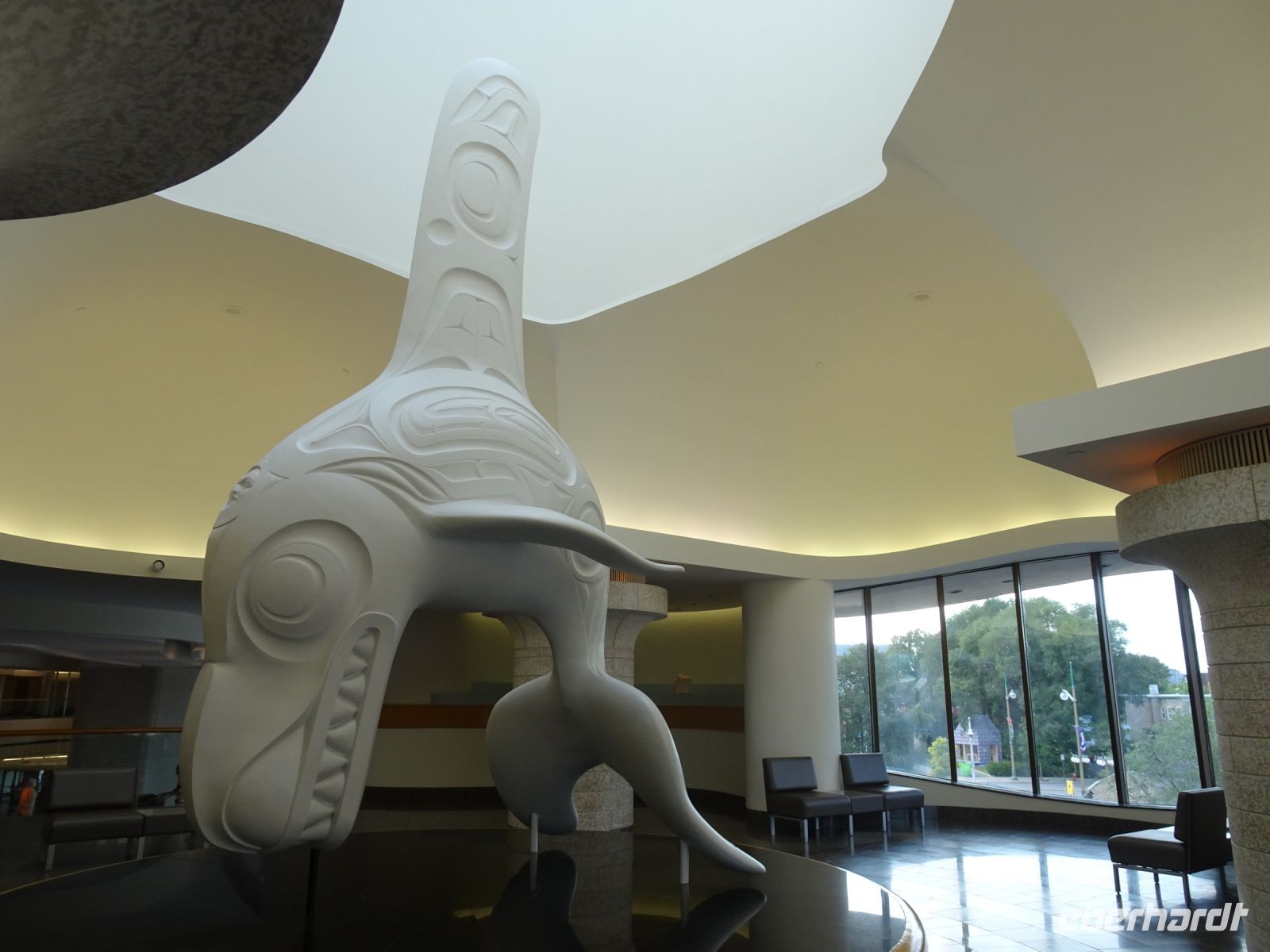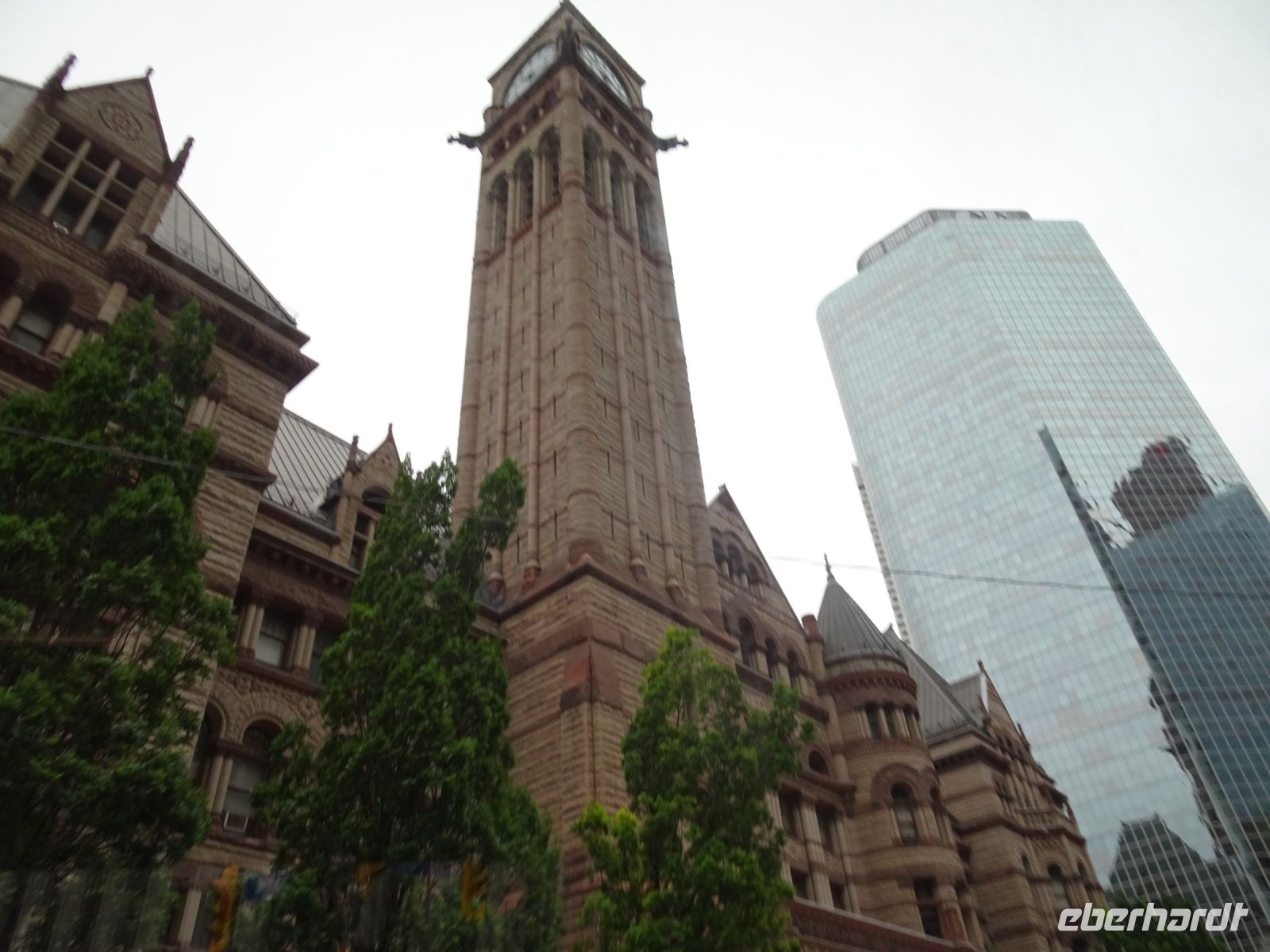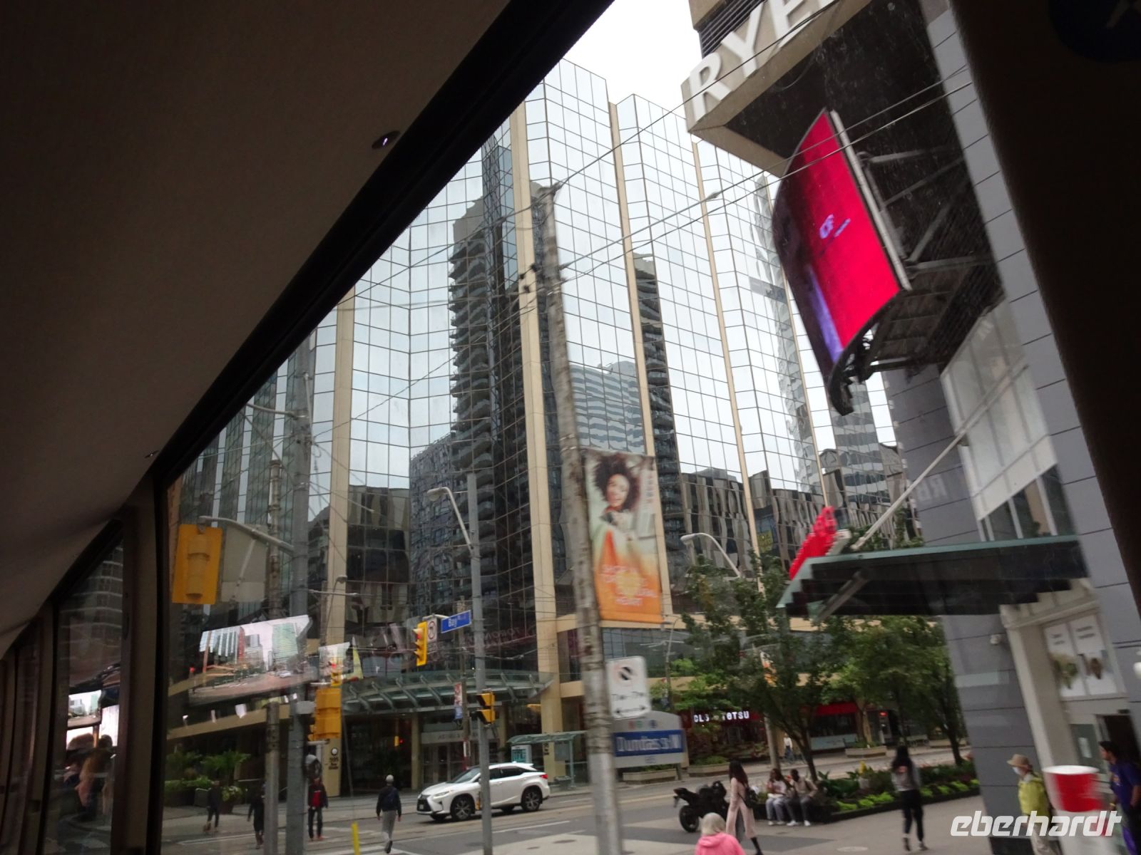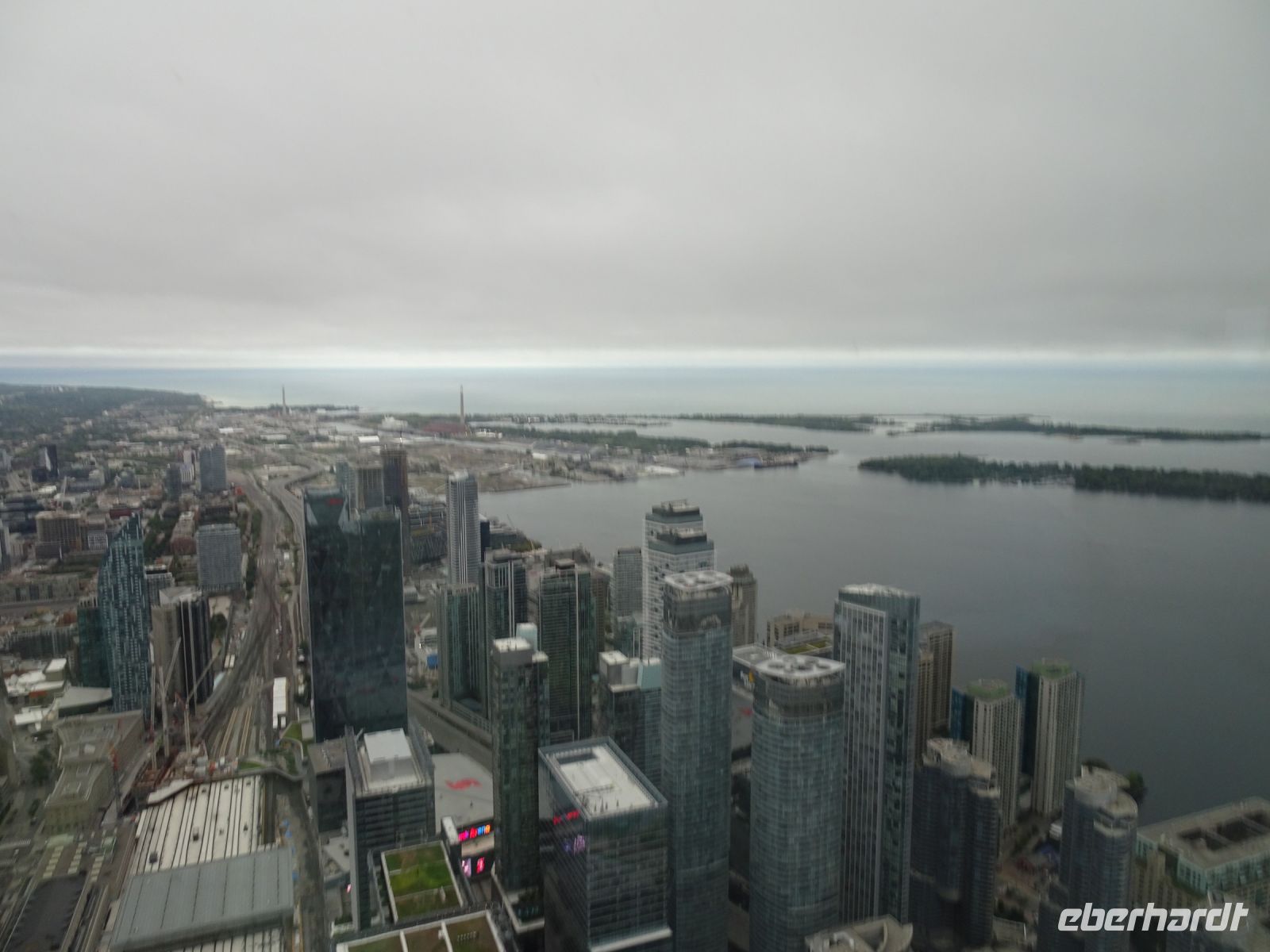 8.15 Uhr verladen wir unser Gepäck in den Bus und beginnen mit der Besichtigung von Toronto. Margarith hat einen schönen Fotostopp für uns ausgewählt, von dort können wir auch das Bügeleisenhaus fotografieren. Heute ist ein Feiertag, viele Straßen sind gesperrt, dazu kommen viele Baustellen. Es ist kompliziert für unseren Busfahrer Blake. Um neun sind wir am CN-Tower. Über dreißig Jahre lang war dies der höchste freistehende Turm der Welt. In 58 Sekunden erreichen wir mit dem Fahrstuhl die auf 346 Metern gelegene Indoor-Aussichtsplattform. Wir haben einen fantastischen Blick auf die Stadt, die direkt am Ontariosee liegt. Obwohl der Himmel grau ist, haben wir klare Sicht. Nach einer Stunde und dem Gang durch den Souvenirshop steigen wir wieder in den Bus ein und setzen die Stadtbesichtigung fort. Während unserer Stadtrundfahrt betrachten wir die glasverspiegelten Wolkenkratzer, die sich hier auf engstem Raum konzentrieren. Im Universitätsviertel erfahren wir, dass in Toronto der Herzschrittmacher erfunden wurde und auch weltweit wichtige Medikamente produziert wurden.