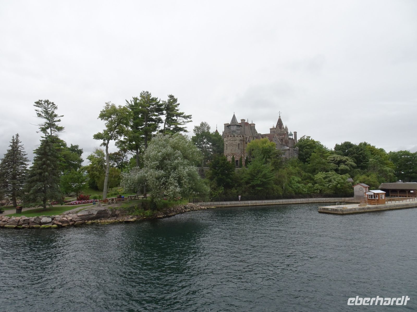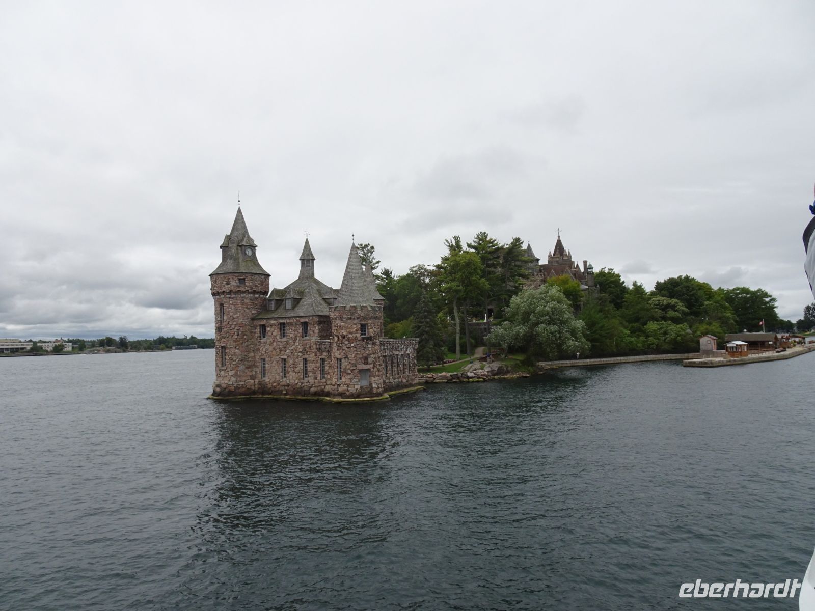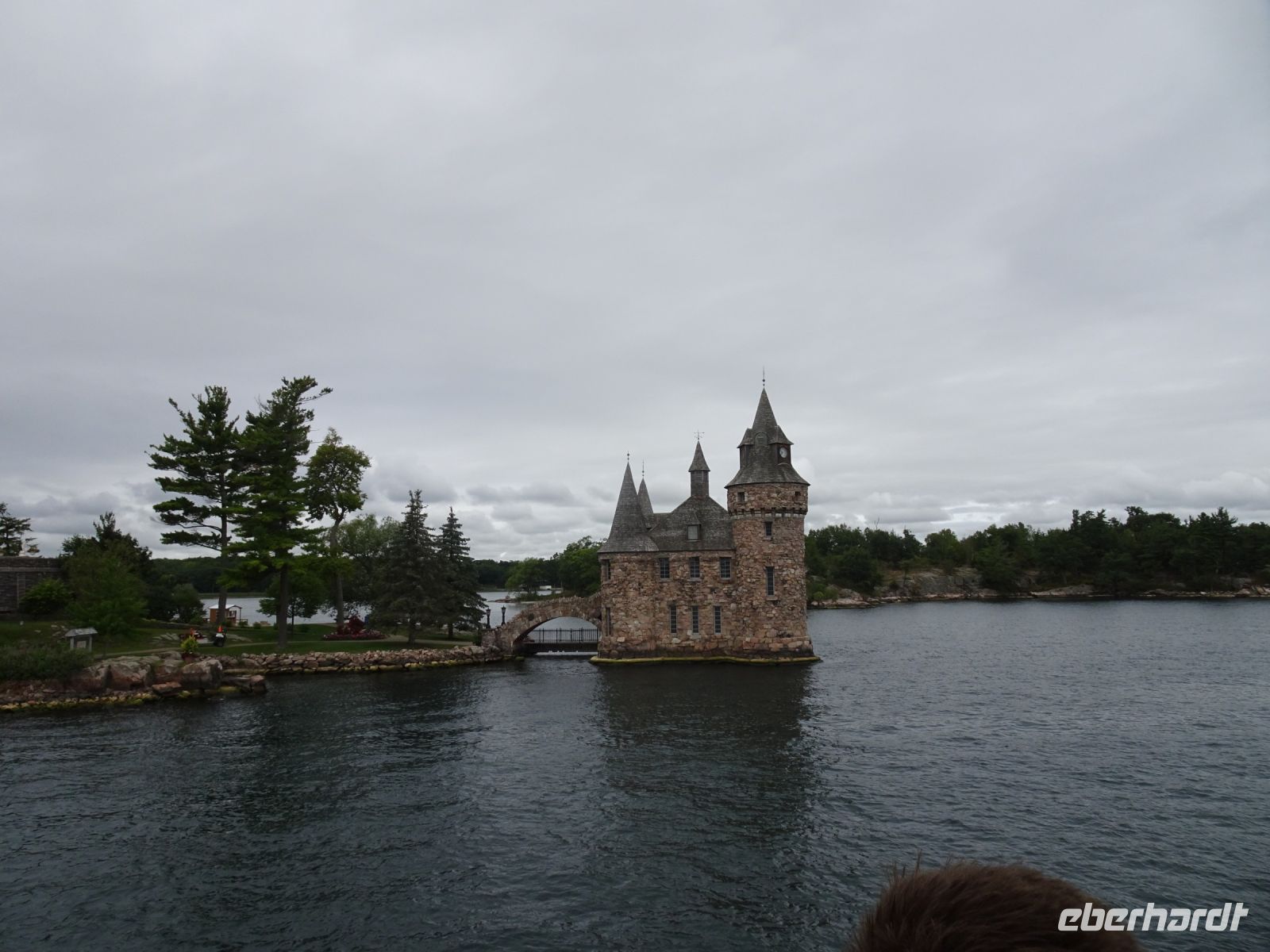 In Rockport beginnt unsere Bootsfahrt auf dem St.-Lorenz-Strom. Eine Stunde kreuzt unser Schiff durch die Inselwelt. Es gibt sogar mehr als tausend Inseln. Minimum zwei mal zwei Meter und ein Baum: dann darf sich das Stück Land Insel nennen beziehungsweise wird in die Zählung mit aufgenommen. Steht das Wasser hoch bei der Zählung gibt es weniger Inseln als wenn das Wasser zu diesem Zeitpunkt tief steht - also kaum zu sagen, wie viele Inseln es tatsächlich sind. Unser Boot umrundet die Heart Insel. Hier hat Mister Bold ein Schloss für seine geliebte Frau errichten lassen. Leider ist sie gestorben bevor der Bau vollendet war. Mister Bold ließ alle Arbeiten einstellen und betrat die Insel nie mehr. Heute ist das Schloss ein Museum. Da es sich auf amerikanischer Seite befindet, legen meist auch nur amerikanische Schiffe dort an, um das Schloss zu besichtigen. Unsere Frage, wie denn die Inseln mit Strom versorgt werden, wird auf dem Schiff beantwortet: die Kabel liegen unterirdisch. Es gibt eine weitere Kuriosität: zwei Inseln, eine auf amerikanischer Seite, eine auf kanadischer Seite sind mit einer kleinen Brücke verbunden. Diese gilt als kleinste internationale Brücke der Welt.