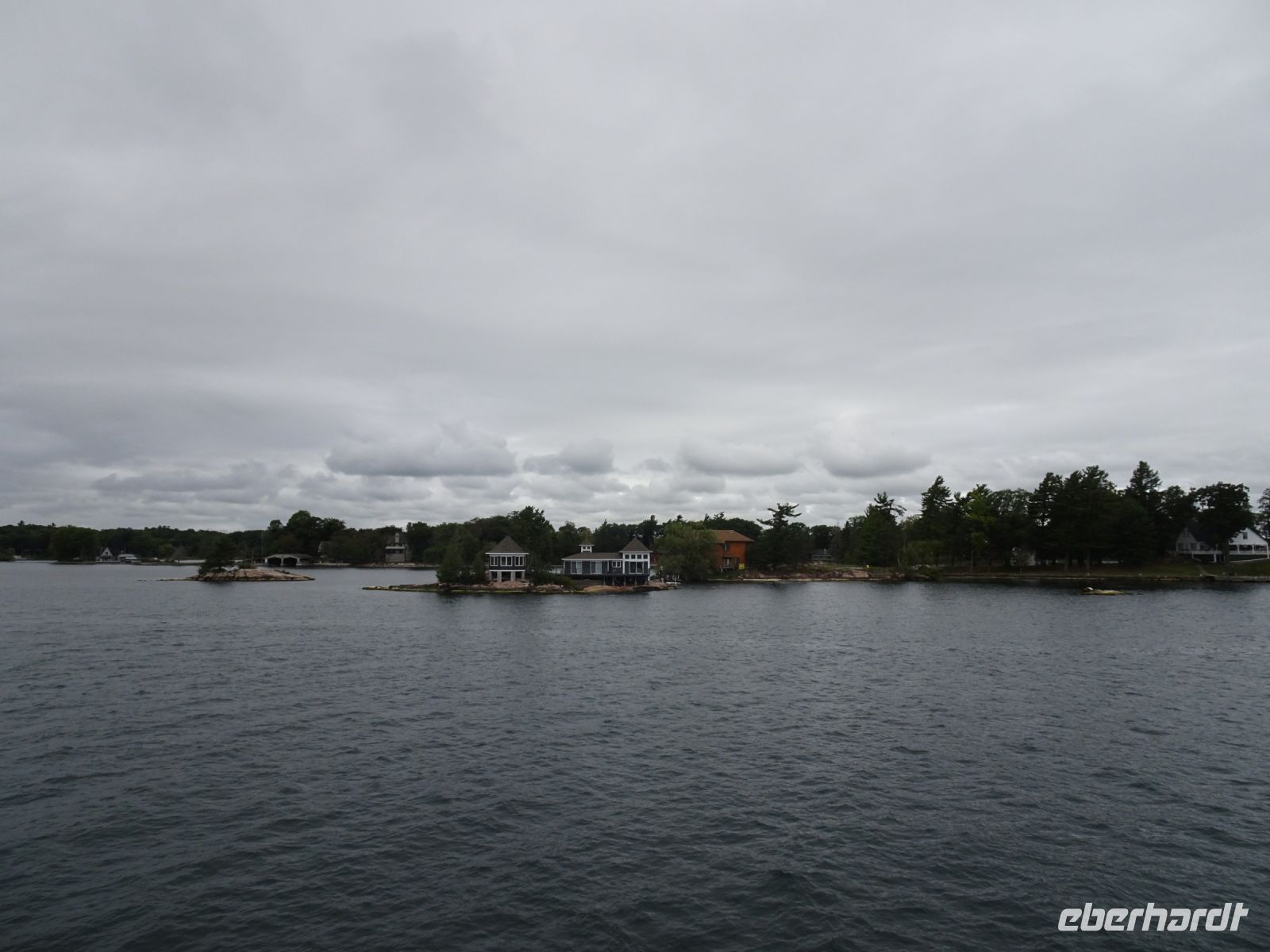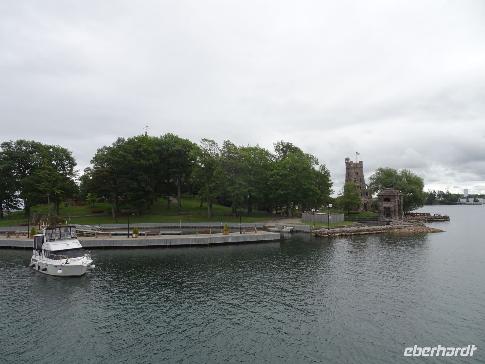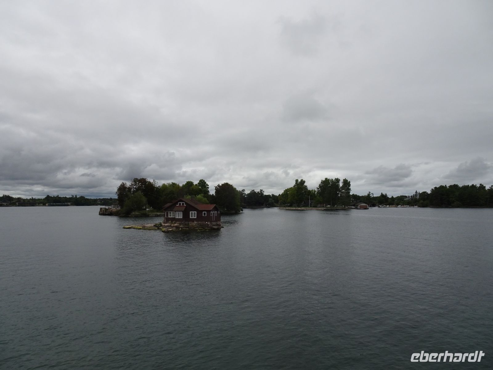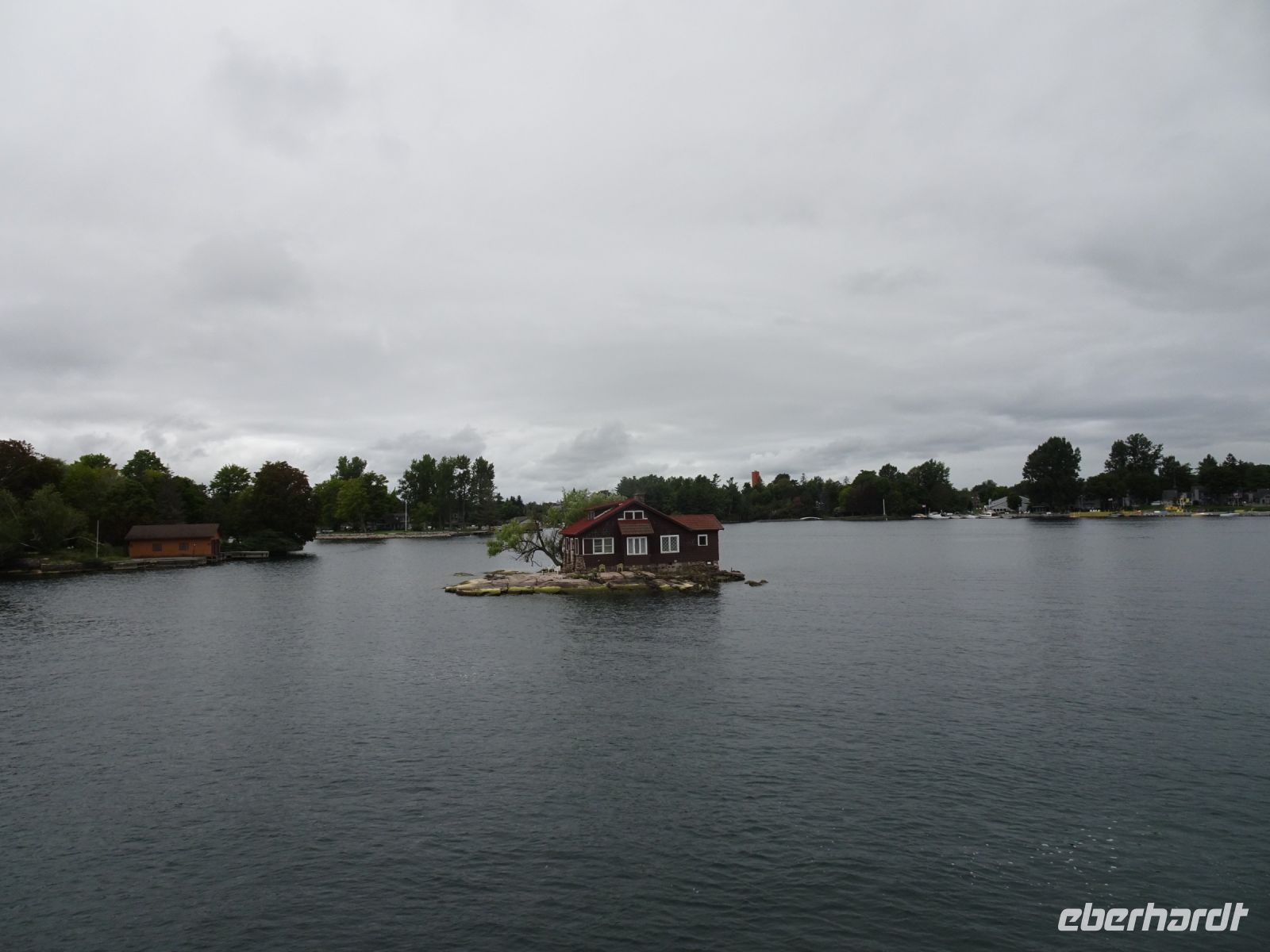 In Rockport beginnt unsere Bootsfahrt auf dem St.-Lorenz-Strom. Eine Stunde kreuzt unser Schiff durch die Inselwelt. Es gibt sogar mehr als tausend Inseln. Minimum zwei mal zwei Meter und ein Baum: dann darf sich das Stück Land Insel nennen beziehungsweise wird in die Zählung mit aufgenommen. Steht das Wasser hoch bei der Zählung gibt es weniger Inseln als wenn das Wasser zu diesem Zeitpunkt tief steht - also kaum zu sagen, wie viele Inseln es tatsächlich sind. Unser Boot umrundet die Heart Insel. Hier hat Mister Bold ein Schloss für seine geliebte Frau errichten lassen. Leider ist sie gestorben bevor der Bau vollendet war. Mister Bold ließ alle Arbeiten einstellen und betrat die Insel nie mehr. Heute ist das Schloss ein Museum. Da es sich auf amerikanischer Seite befindet, legen meist auch nur amerikanische Schiffe dort an, um das Schloss zu besichtigen. Unsere Frage, wie denn die Inseln mit Strom versorgt werden, wird auf dem Schiff beantwortet: die Kabel liegen unterirdisch. Es gibt eine weitere Kuriosität: zwei Inseln, eine auf amerikanischer Seite, eine auf kanadischer Seite sind mit einer kleinen Brücke verbunden. Diese gilt als kleinste internationale Brücke der Welt.