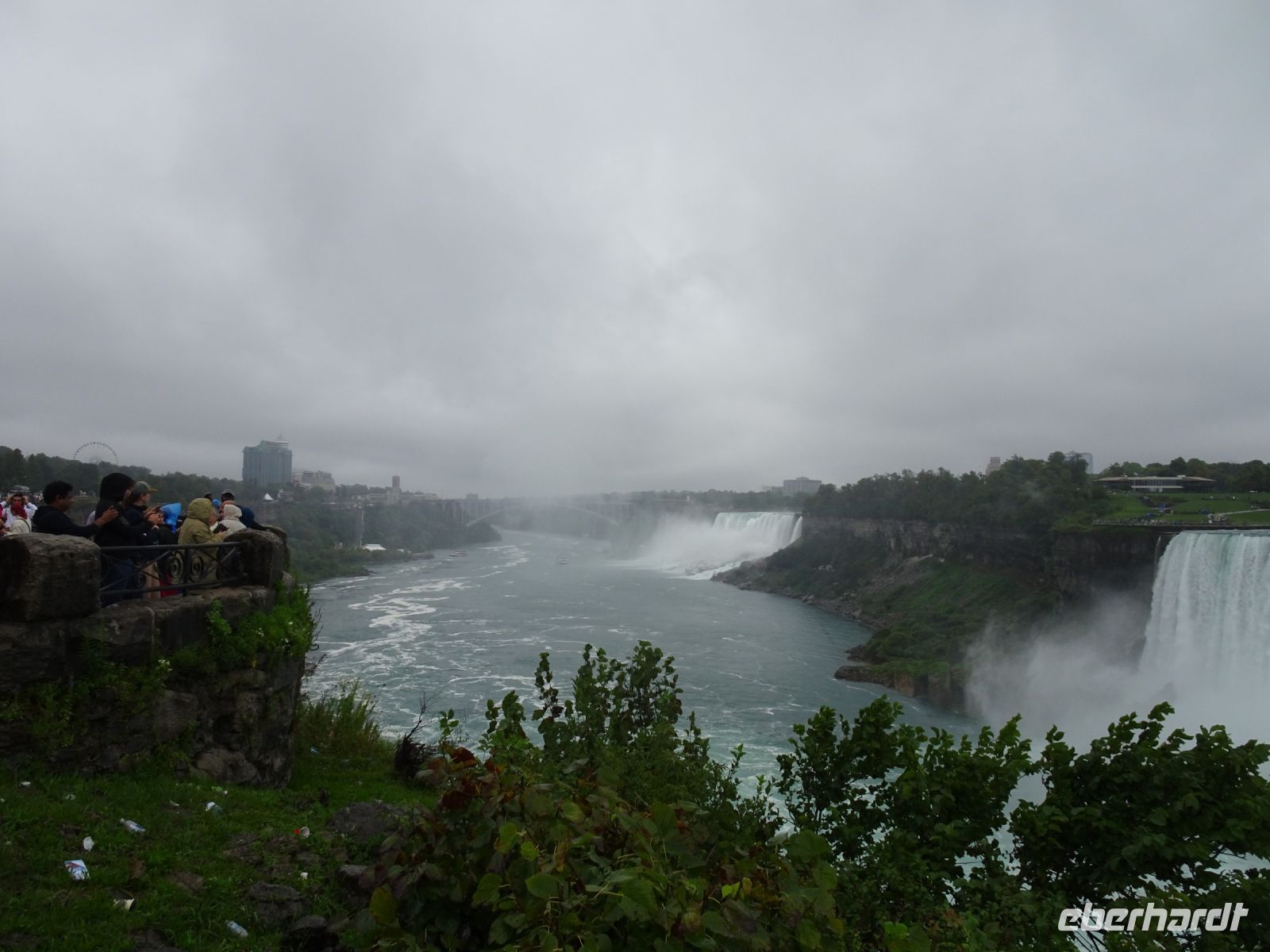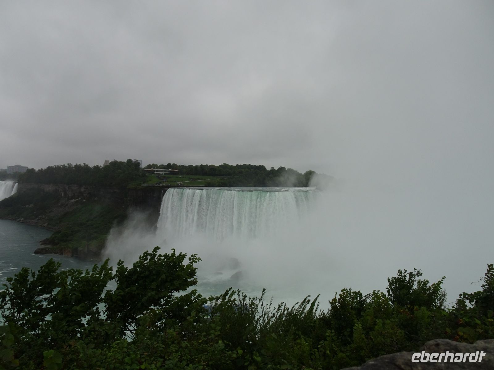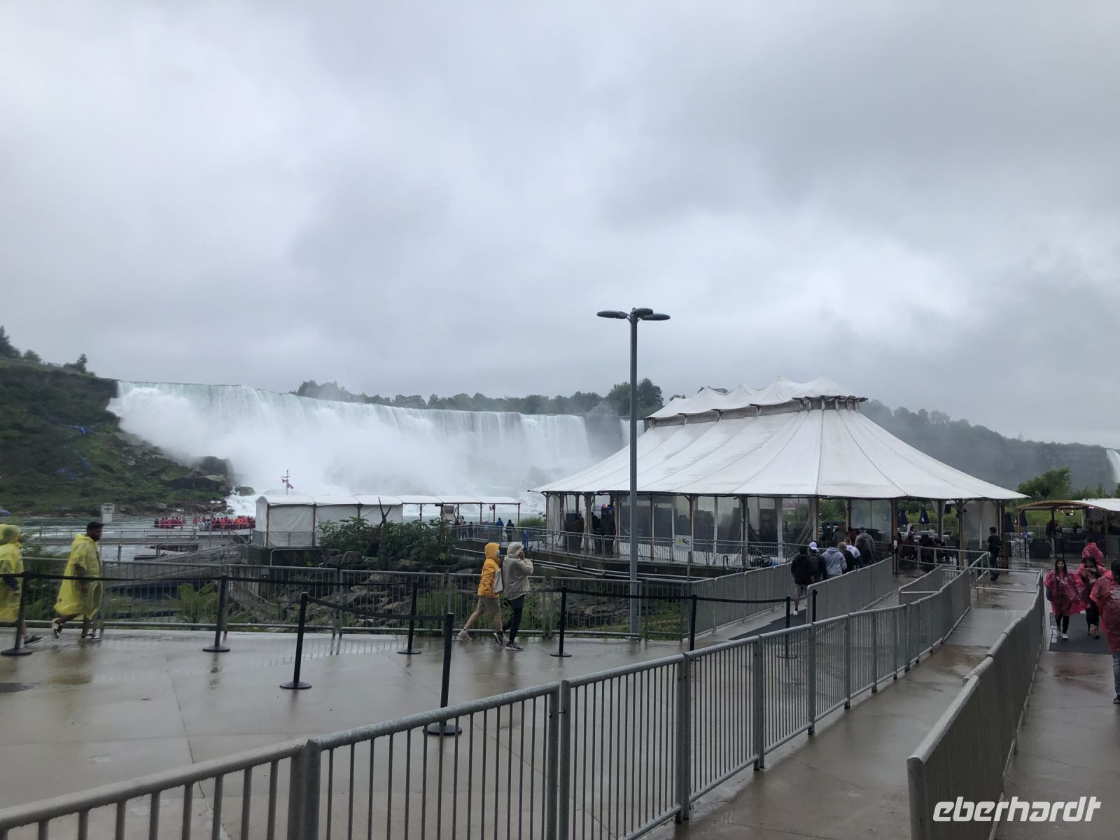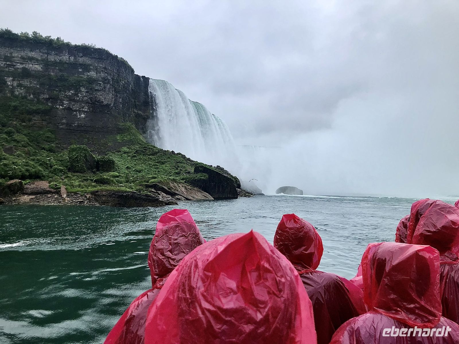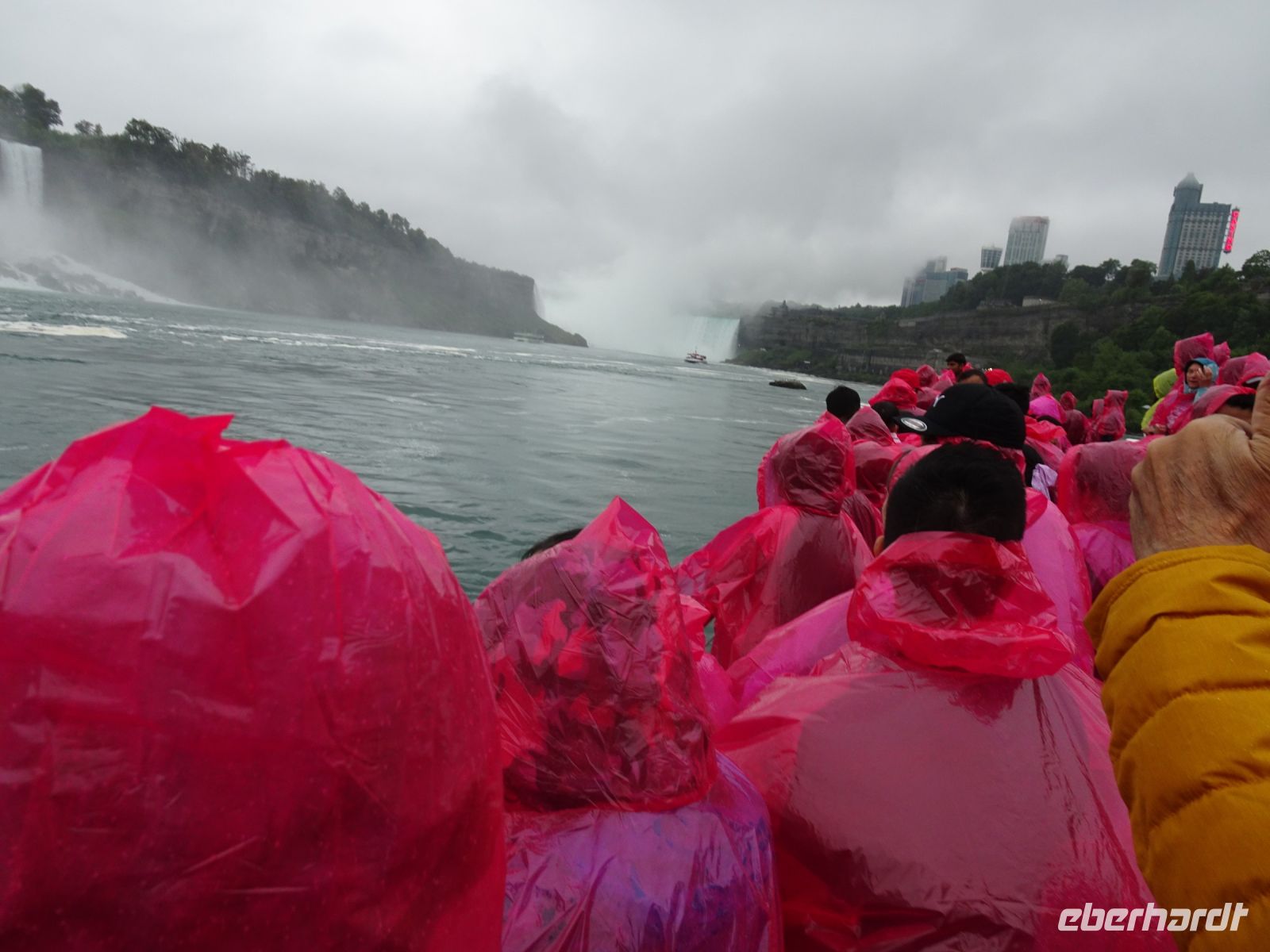 Am Nachmittag erreichen wir die Niagarafälle. Dieses Naturwunder befindet sich an der kanadisch-amerikanischen Grenze. Auf der einen Seite der Bundesstaat New York auf der anderen die kanadische Provinz Ontario. Es regnet wie verrückt, dennoch lassen wir uns nicht von einem Fotostopp am Table Rock abhalten. Hier befindet sich die Felskante, über die das Wasser in die Tiefe stürzt. Halb vier beginnt unsere Bootsfahrt direkt in die Fälle hinein. Der Regen hat vorübergehend aufgehört, aber nun werden wir von der Gischt durchweicht. Ganz nah fährt unser Kapitän das Boot an die Canadian Horseshoe Falls heran. Auf einer Kantenlänge von 820 Metern fällt hier das Wasser mit lautem Getöse 54 Meter hinab. Alle Passagiere sind in rote Regencapes gehüllt und quietschen vor Vergnügen, wenn die Gischt das ganze Boot unter Wasser setzt. So können wir die Niagarafälle mit allen Sinnen in uns aufnehmen: sehen, hören und ganz gewiss spüren. Nach einer halben Stunde kehren wir glücklich und patschnass an Land zurück. Auf Freizeit hat jetzt keiner mehr Lust, eher auf eine warme Dusche. Also ruft Margarith unseren Fahrer Blake an und wir fahren zum Hotel. Der Check In geht schnell, bald haben alle ihre Zimmerschlüssel und können ein wenig ausruhen.