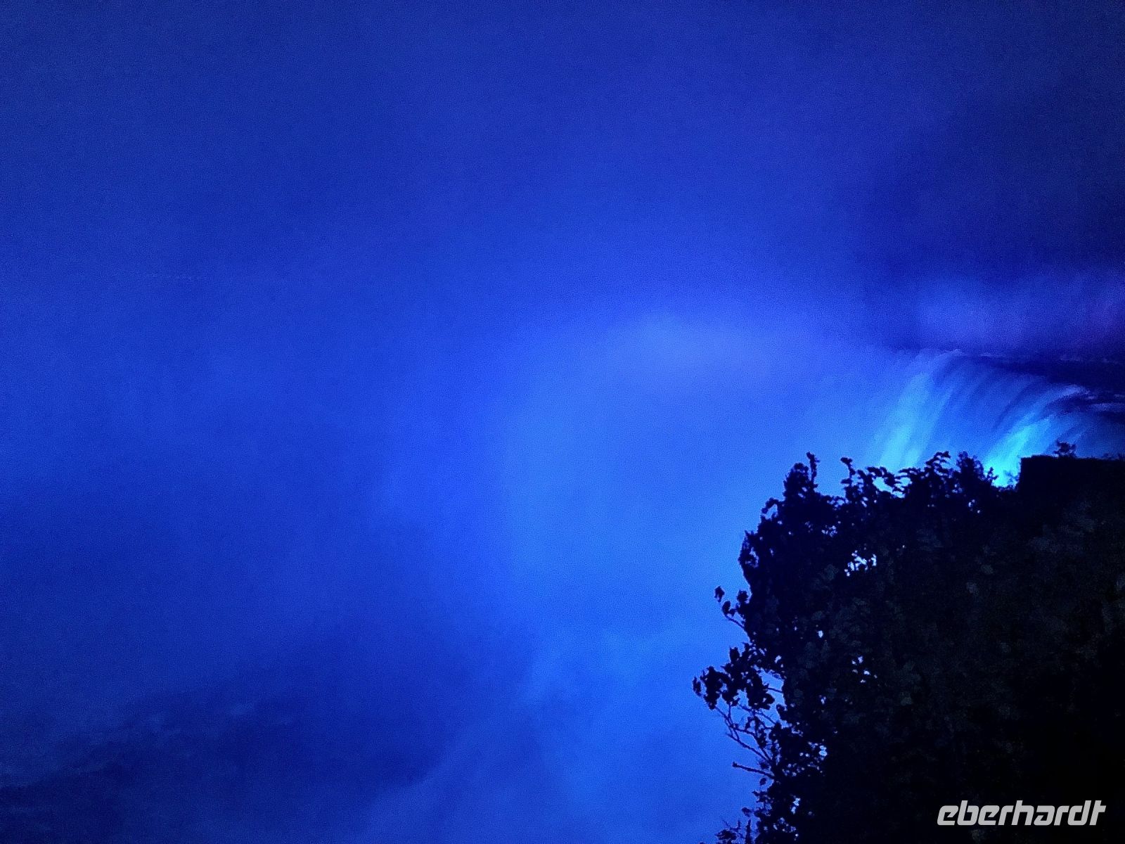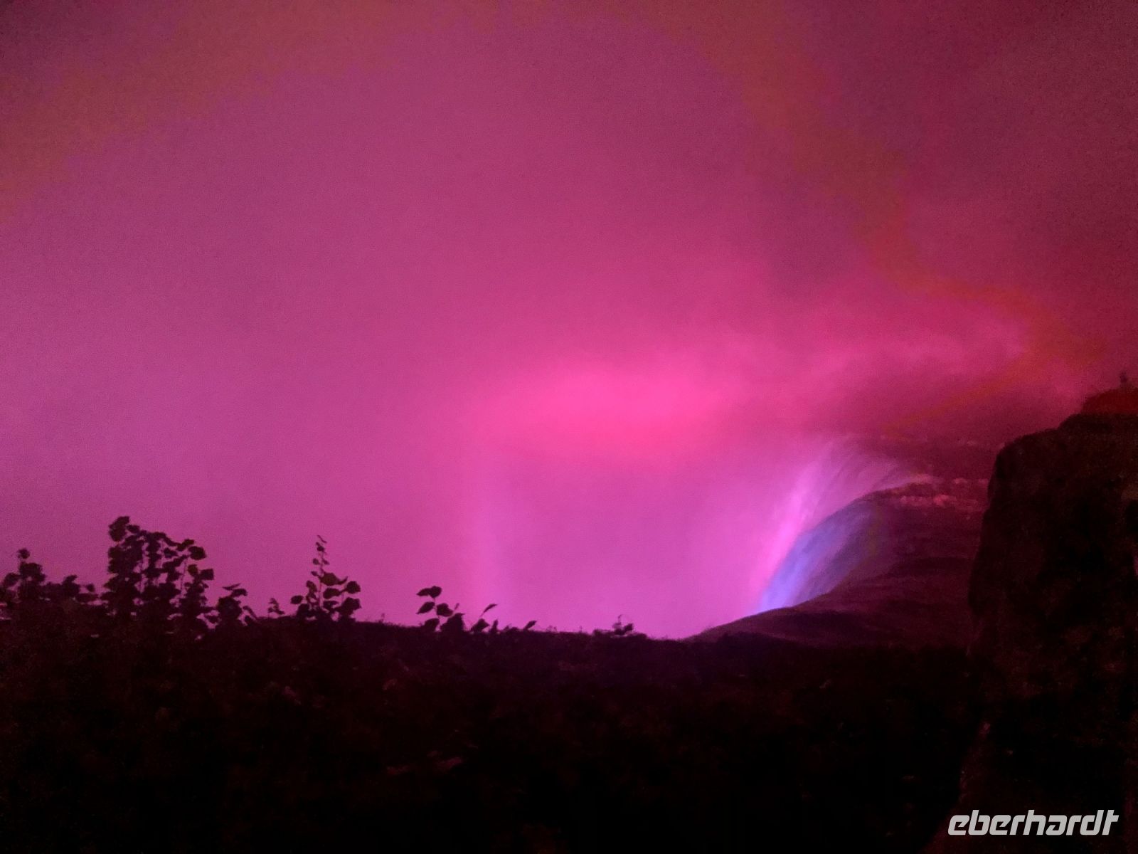 18.15 Uhr treffen wir uns in der Lobby. Es regnet wieder. Das Abendessen nehmen wir heute auf dem Skylon Tower ein. Schon gestern haben wir unsere Hauptspeise gewählt und Margarith hat die Bestellung aufgegeben. Mit dem Lift fahren wir zum Restaurant, dass sich einmal in der Stunde rundherum dreht. Trotz des miserablen Wetters ist die Aussicht erstaunlich. Wir werden platziert und einige Gäste haben das Glück, direkt am Fenster zu sitzen. Aber von allen anderen Plätzen können wir auch gut sehen oder wir stehen zum Fotografieren auf. Das Menü besteht aus einem grünen Salat, ganz frischem Brot und Butter, dem jeweils gewählten Hauptgericht (Lachs, Steak, Hähnchen Cordon Bleu und eine vegetarische Variante überbackenen Aubergine waren im Angebot) und einer Süßspeise. Nach dem Abendessen unternehmen Blake und Margarith mit uns noch eine kleine Lichterfahrt und noch einmal steigen wir aus. Jetzt sind die Fälle beleuchtet - rot, gelb, grün und blau wechseln einander ab. Das nächtliche Feuerwerk bestaunen wir von unseren Zimmerfenstern aus.