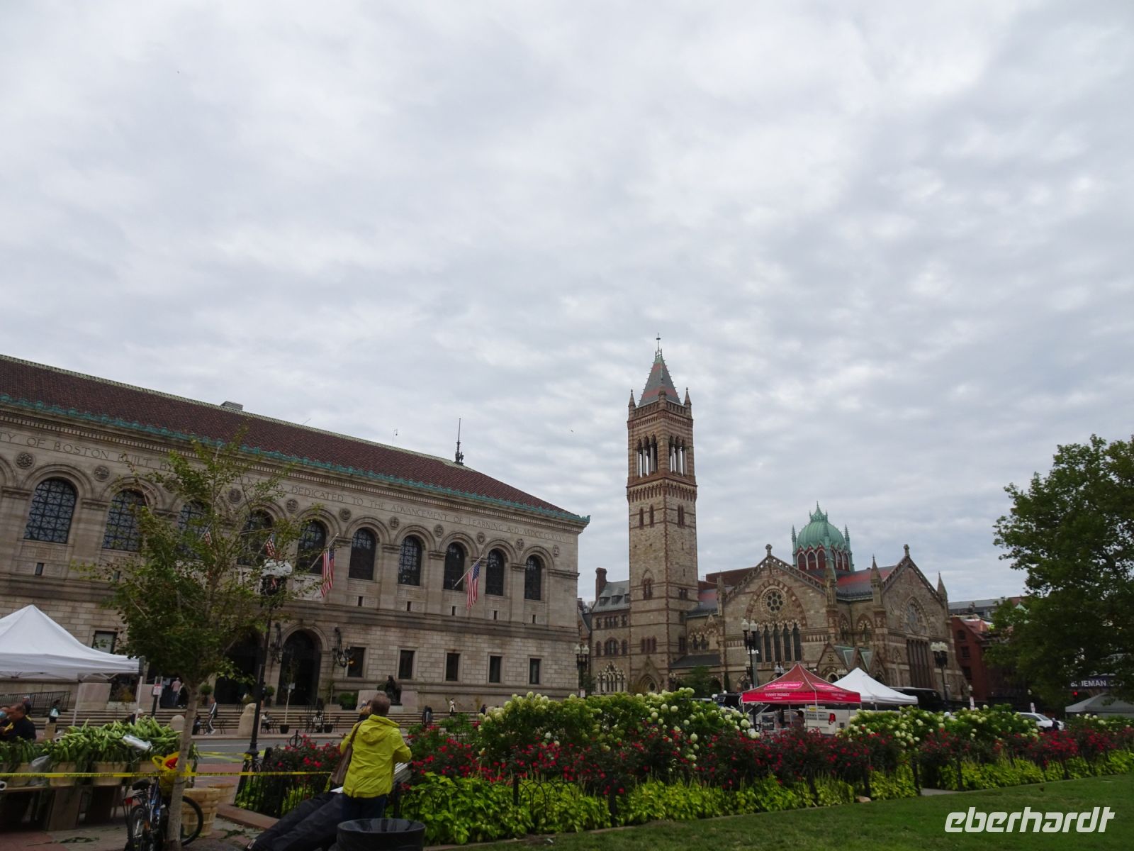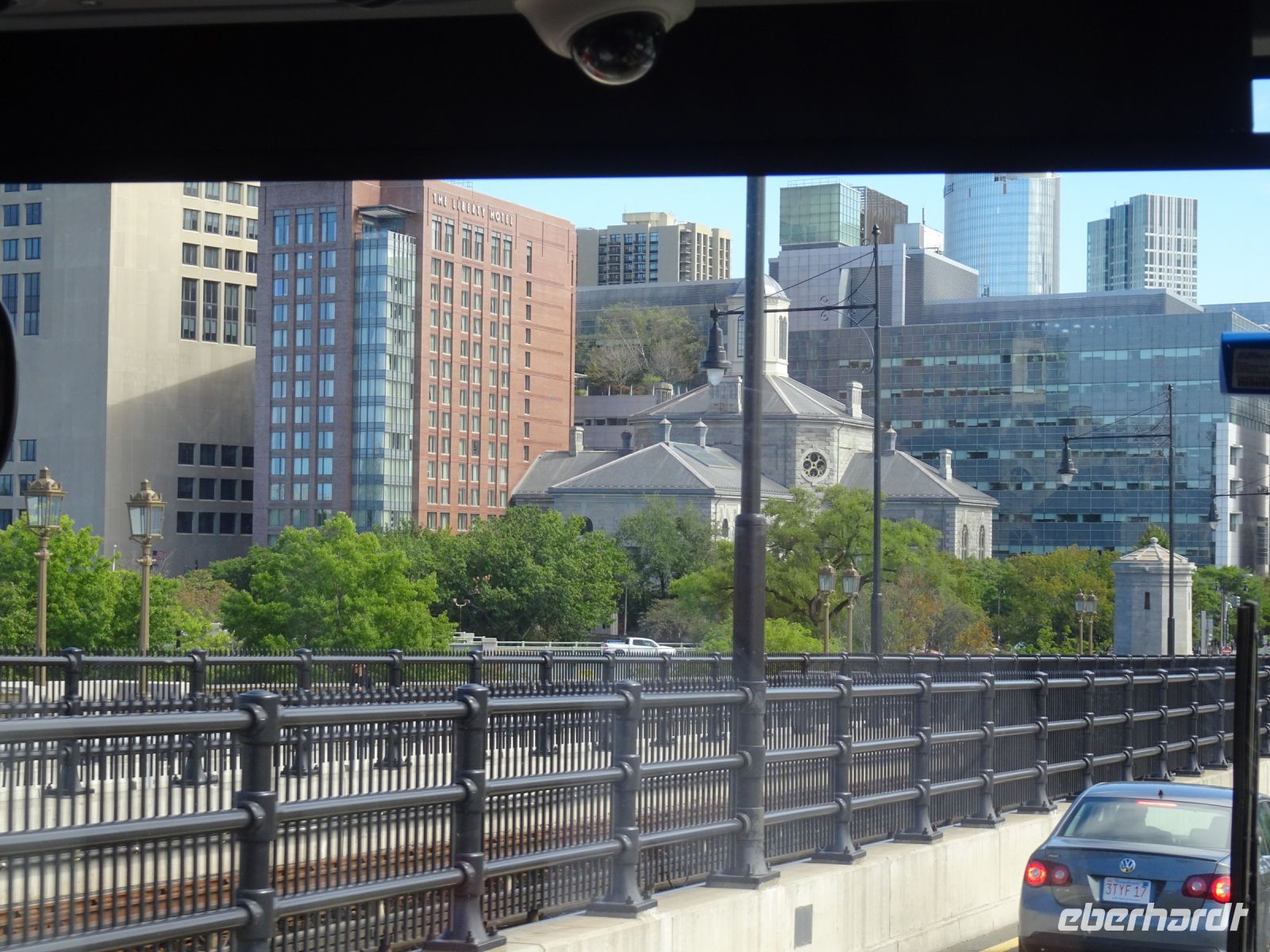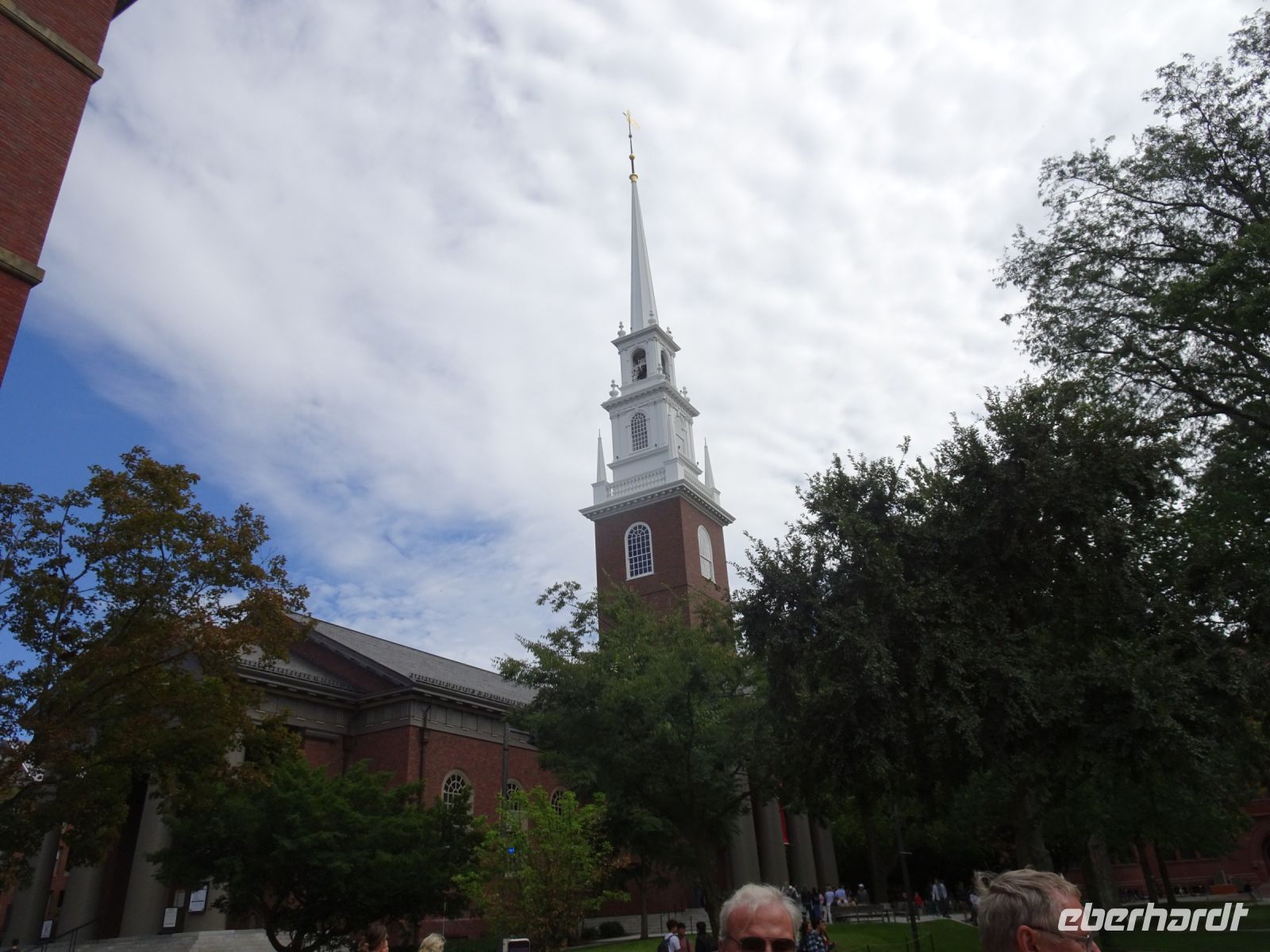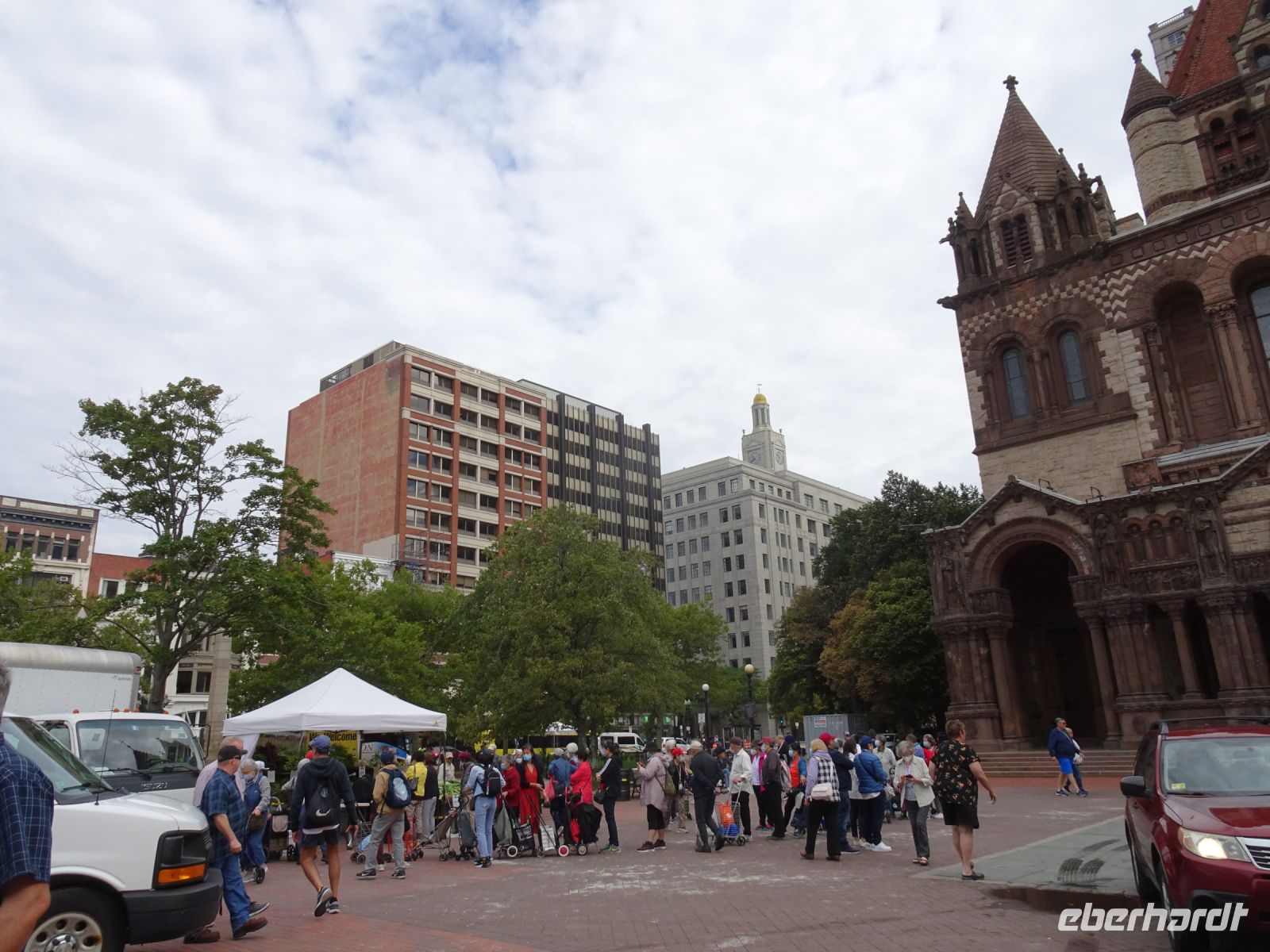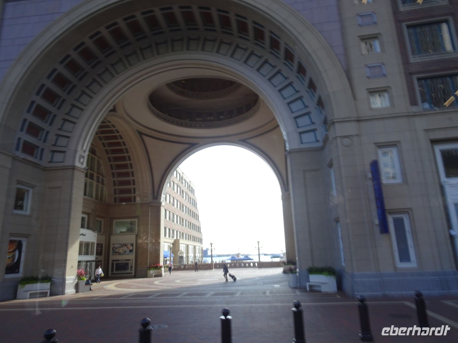Ein Sahnehäubchen auf unserer Rundreise folgt zum Abschluss. Zunächst einmal müssen wir aber aus checken. Natürlich geht das nicht ohne ein Miniproblem ab, wie sollte es auch anders sein. Eine Kreditkarte wurde nicht richtig gezogen, wir müssen noch einmal zur Rezeption und das in Ordnung bringen. In der Zwischenzeit haben alle anderen Gäste ihre Koffer und die heutige Stadtführerin gefunden. Wir sind in Boston, der größten Stadt in Neuengland/USA und Massachusetts. Entsprechend haben wir es wieder mit spiegelverglasten Wolkenkratzern zu tun. Mit dem Bus fahren wir durch Boston Downtown und am Hafen entlang. Unser erster Stopp gilt dem ältesten noch seetüchtigem Segelschiff der Welt (18. Jahrhundert). Es ist der Drei-Master USS Constitution mit einer bewegten Geschichte. Gegenüber vom Hafen befinden sich hübsche Häuschen, eines mit einem seltsamen Dachaufbau. Von hier aus haben die Seemannsfrauen, in Erwartung ihrer Männer früher über den Hafen und das Meer schauen können. Unsere Fahrt geht weiter durch die Stadt. Wir bewundern Museen von Außen, U-Bahn-Eingänge und Kirchen, das Theaterviertel und vieles mehr. Am Copley Square steigen wir aus. Wir bewundern die schönen Fresken der Trinity Church und besuchen die öffentliche Bibliothek. Anschließend fahren wir nach Cambridge zum Gelände der berühmten Harvard Universität, die immerhin schon 1636 gegründet wurde und damit die älteste Universität der Vereinigten Staaten ist. Hier befindet sich unter anderem die Harry Elkins Widener Bibliothek, deren Namen auf den Sohn einer reichen Familie zurückgeht, der mit seinem Vater beim Titanic-Unglück ums Leben kam. Harry Widener war Harvard Absolvent und leidenschaftlicher Sammler von Büchern und Schriften. Er besaß unter anderem ein Schreiben von William Shakespeare und eine Gutenberg Bibel. Nach seinem Tod spendete seine Mutter 200.000 US-Dollar für den Aufbau einer Bibliothek, die die Werke ihres Sohnes aufbewahren sollte. Von Cambridge fahren wir zurück nach Boston und legen bei schönstem Sonnenschein eine Pause am Quincy Market ein.