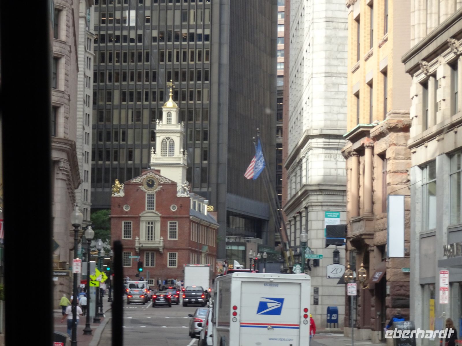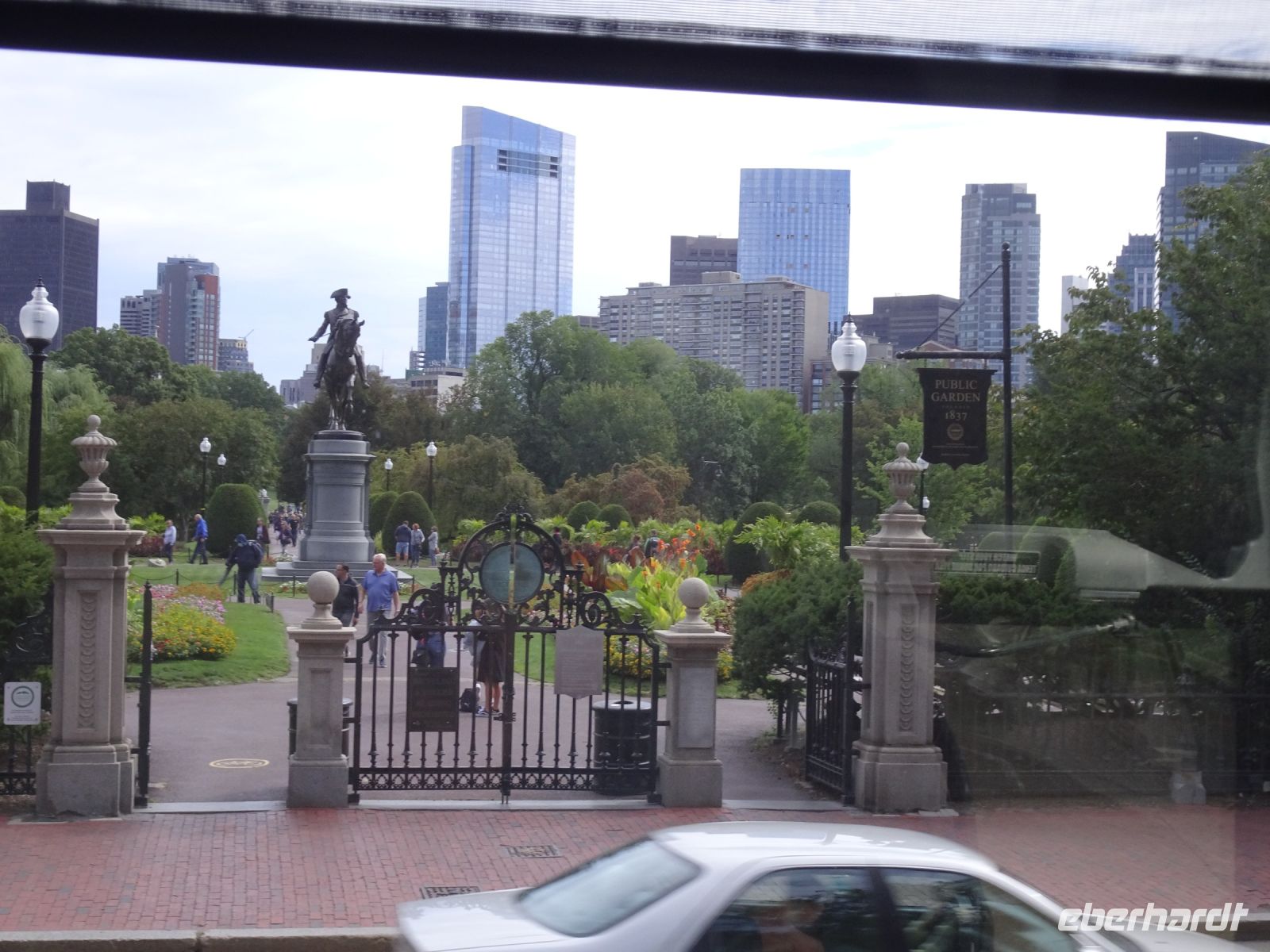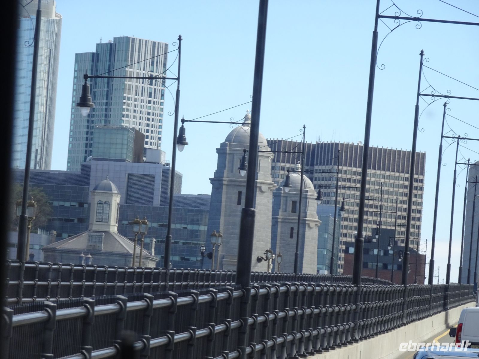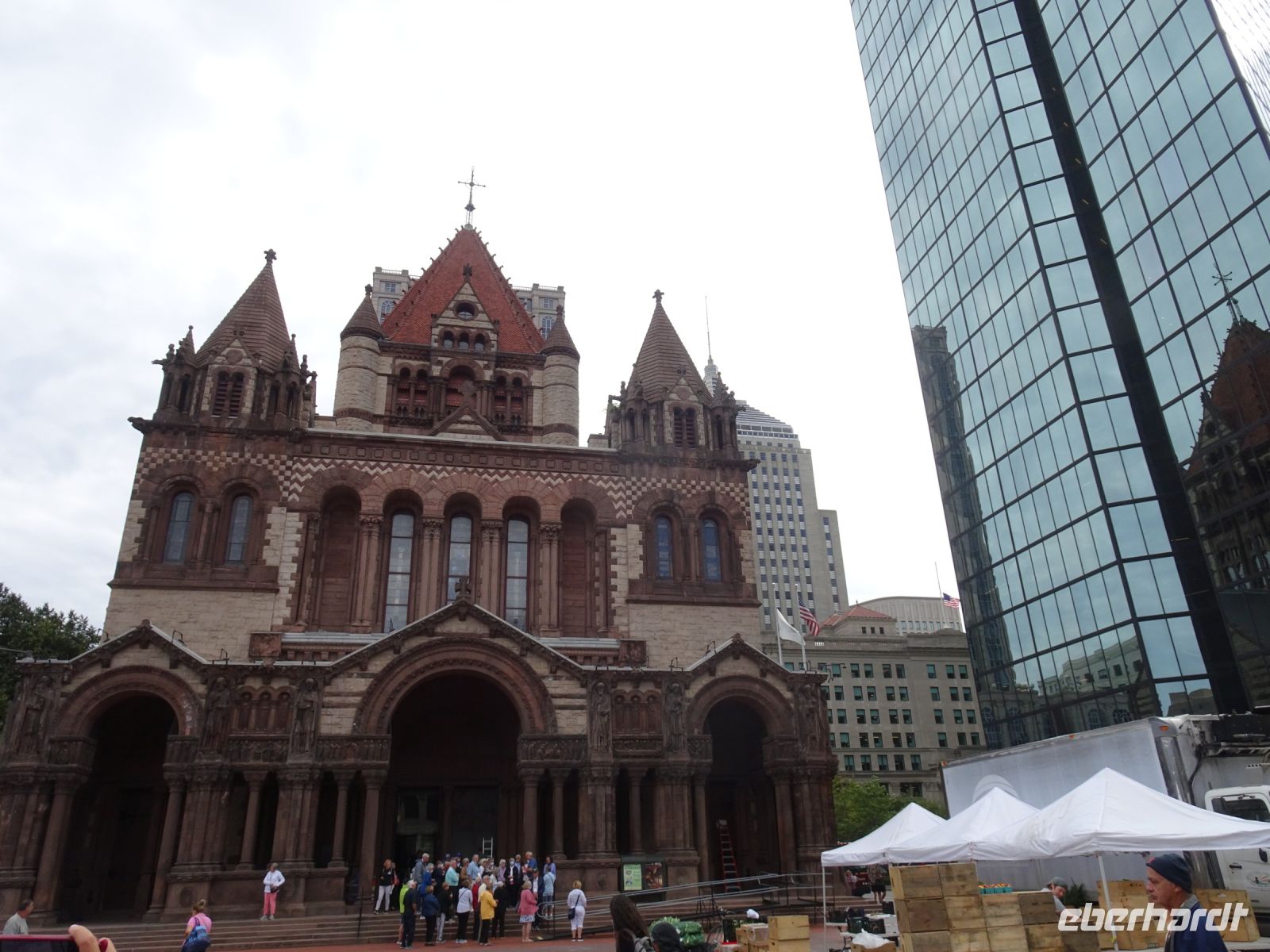 Ein Sahnehäubchen auf unserer Rundreise folgt zum Abschluss. Zunächst einmal müssen wir aber aus checken. Natürlich geht das nicht ohne ein Miniproblem ab, wie sollte es auch anders sein. Eine Kreditkarte wurde nicht richtig gezogen, wir müssen noch einmal zur Rezeption und das in Ordnung bringen. In der Zwischenzeit haben alle anderen Gäste ihre Koffer und die heutige Stadtführerin gefunden. Wir sind in Boston, der größten Stadt in Neuengland/USA und Massachusetts. Entsprechend haben wir es wieder mit spiegelverglasten Wolkenkratzern zu tun. Mit dem Bus fahren wir durch Boston Downtown und am Hafen entlang. Unser erster Stopp gilt dem ältesten noch seetüchtigem Segelschiff der Welt (18. Jahrhundert). Es ist der Drei-Master USS Constitution mit einer bewegten Geschichte. Gegenüber vom Hafen befinden sich hübsche Häuschen, eines mit einem seltsamen Dachaufbau. Von hier aus haben die Seemannsfrauen, in Erwartung ihrer Männer früher über den Hafen und das Meer schauen können. Unsere Fahrt geht weiter durch die Stadt. Wir bewundern Museen von Außen, U-Bahn-Eingänge und Kirchen, das Theaterviertel und vieles mehr. Am Copley Square steigen wir aus. Wir bewundern die schönen Fresken der Trinity Church und besuchen die öffentliche Bibliothek. Anschließend fahren wir nach Cambridge zum Gelände der berühmten Harvard Universität, die immerhin schon 1636 gegründet wurde und damit die älteste Universität der Vereinigten Staaten ist. Hier befindet sich unter anderem die Harry Elkins Widener Bibliothek, deren Namen auf den Sohn einer reichen Familie zurückgeht, der mit seinem Vater beim Titanic-Unglück ums Leben kam. Harry Widener war Harvard Absolvent und leidenschaftlicher Sammler von Büchern und Schriften. Er besaß unter anderem ein Schreiben von William Shakespeare und eine Gutenberg Bibel. Nach seinem Tod spendete seine Mutter 200.000 US-Dollar für den Aufbau einer Bibliothek, die die Werke ihres Sohnes aufbewahren sollte. Von Cambridge fahren wir zurück nach Boston und legen bei schönstem Sonnenschein eine Pause am Quincy Market ein.