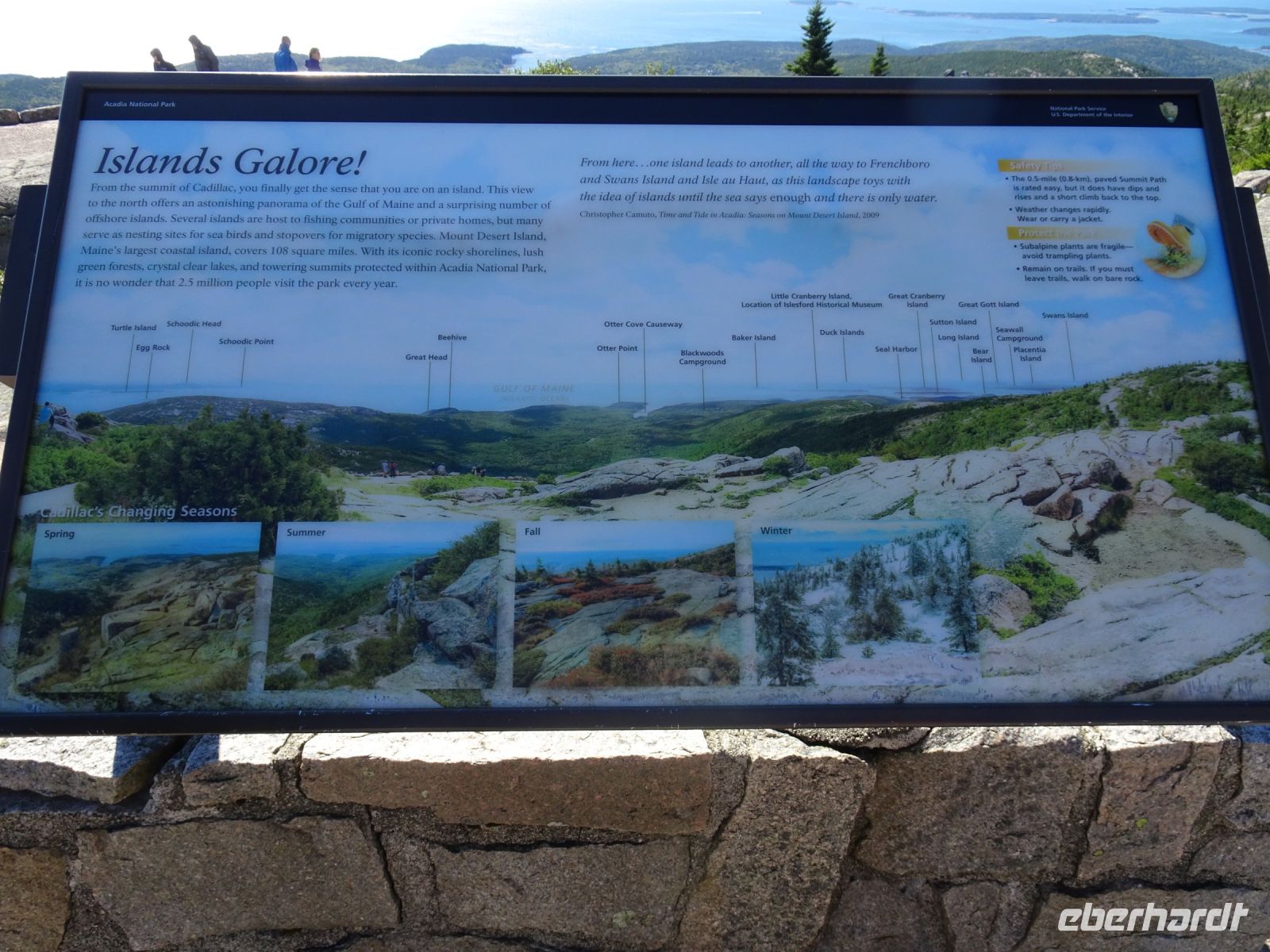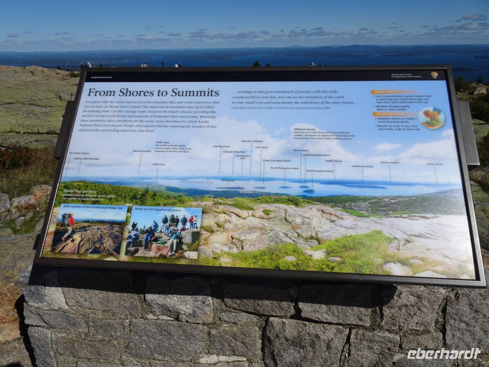 Der Acadia Nationalpark, den wir heute von Bar Harbor aus besuchen, befindet sich größtenteils auf Mount Desert Island, welches die größte Insel vor der Küste von Maine ist. Mag sein, dass es hervorragende Aussichtspunkte in spektakulärer Landschaft gibt, aber leider hält unser Bus nur einmal für einen Fotostopp an. Darüber hinaus haben wir das Pech, auf der falschen (Beifahrer-) Seite zu sitzen, die schönen Aussichten haben wir nicht oder nur wenig.