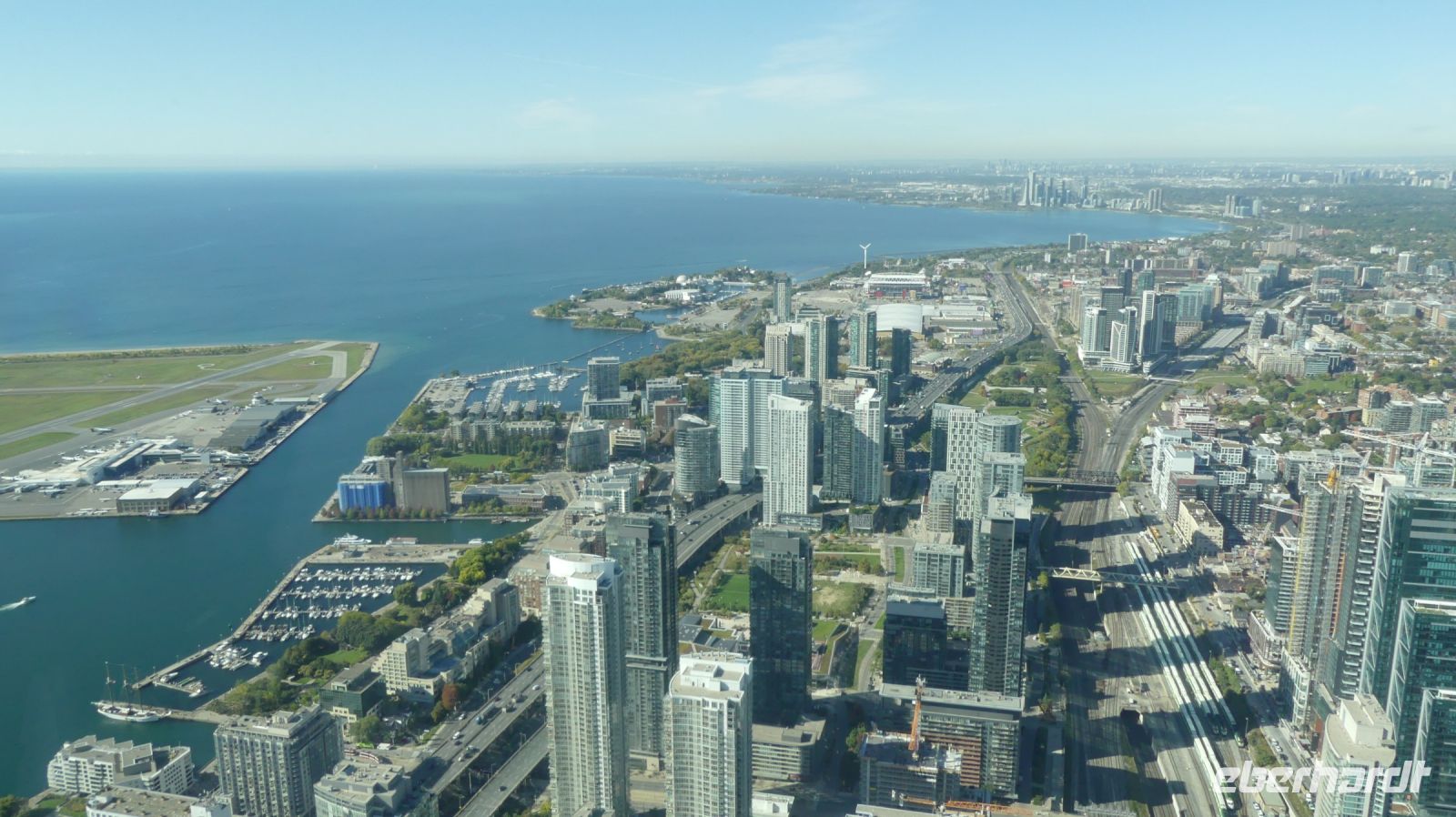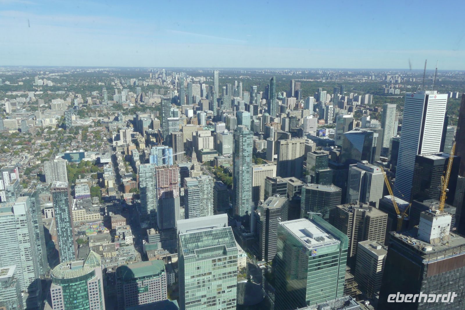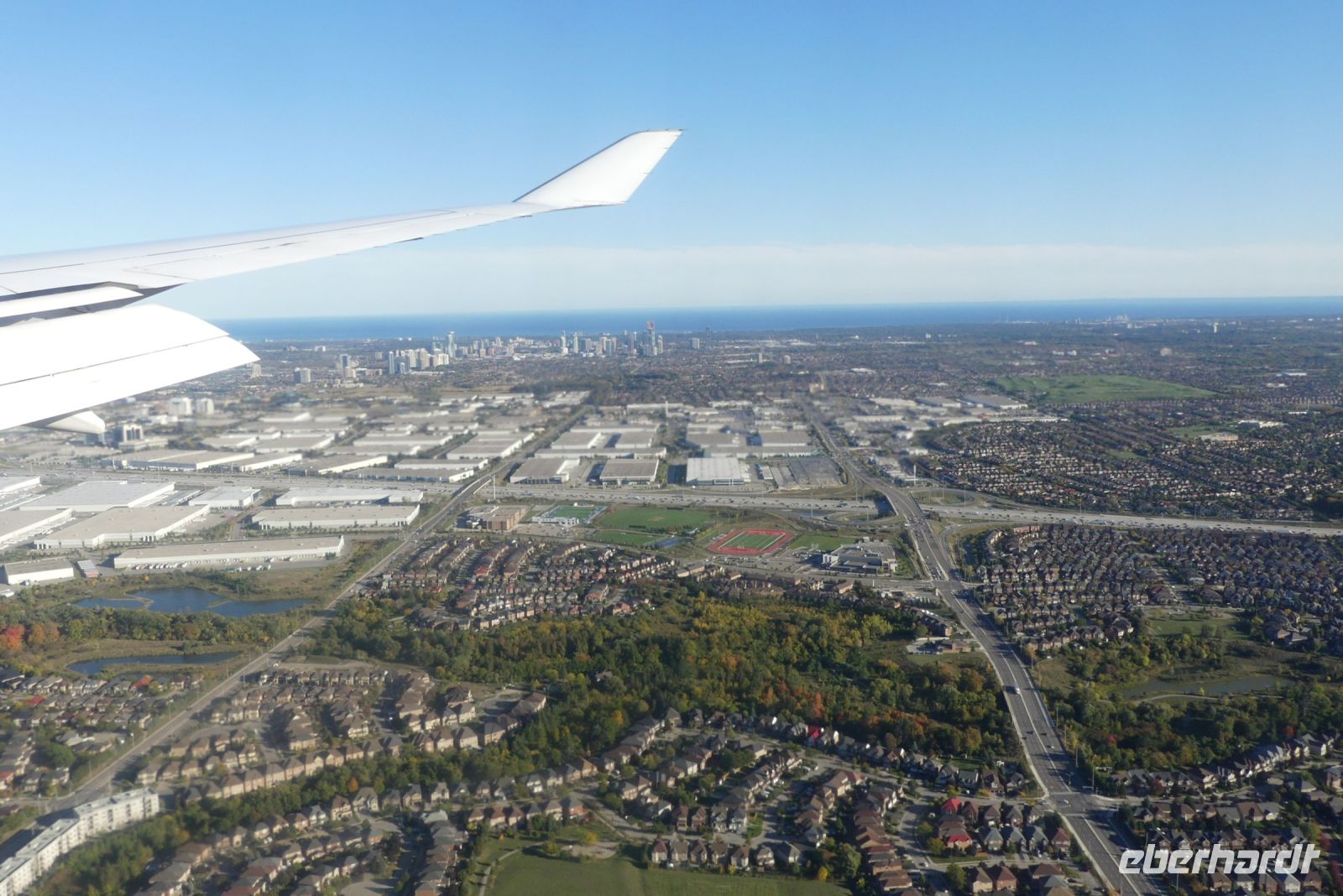 Letztendlich starten wir 90 Minuten später. Es sind acht Stunden Flug über Amsterdam, Schottland, die gut zu sehende Südspitze Grönlands und Labrador in Ostkanada begleitet von der Nachmittagssonne, die für uns auch noch in Toronto bei der Landung scheint. In Toronto erledigen wir die Zollerklärung am Automaten. Am Zoll erwischt es zwei von uns mit einer intensiven Kofferkontrolle. Aber auch das wird gemeistert und so können wir endlich mit unserer örtlichen Reiseleiterin Kathy und Fahrer Marco ins Stadtzentrum fahren.