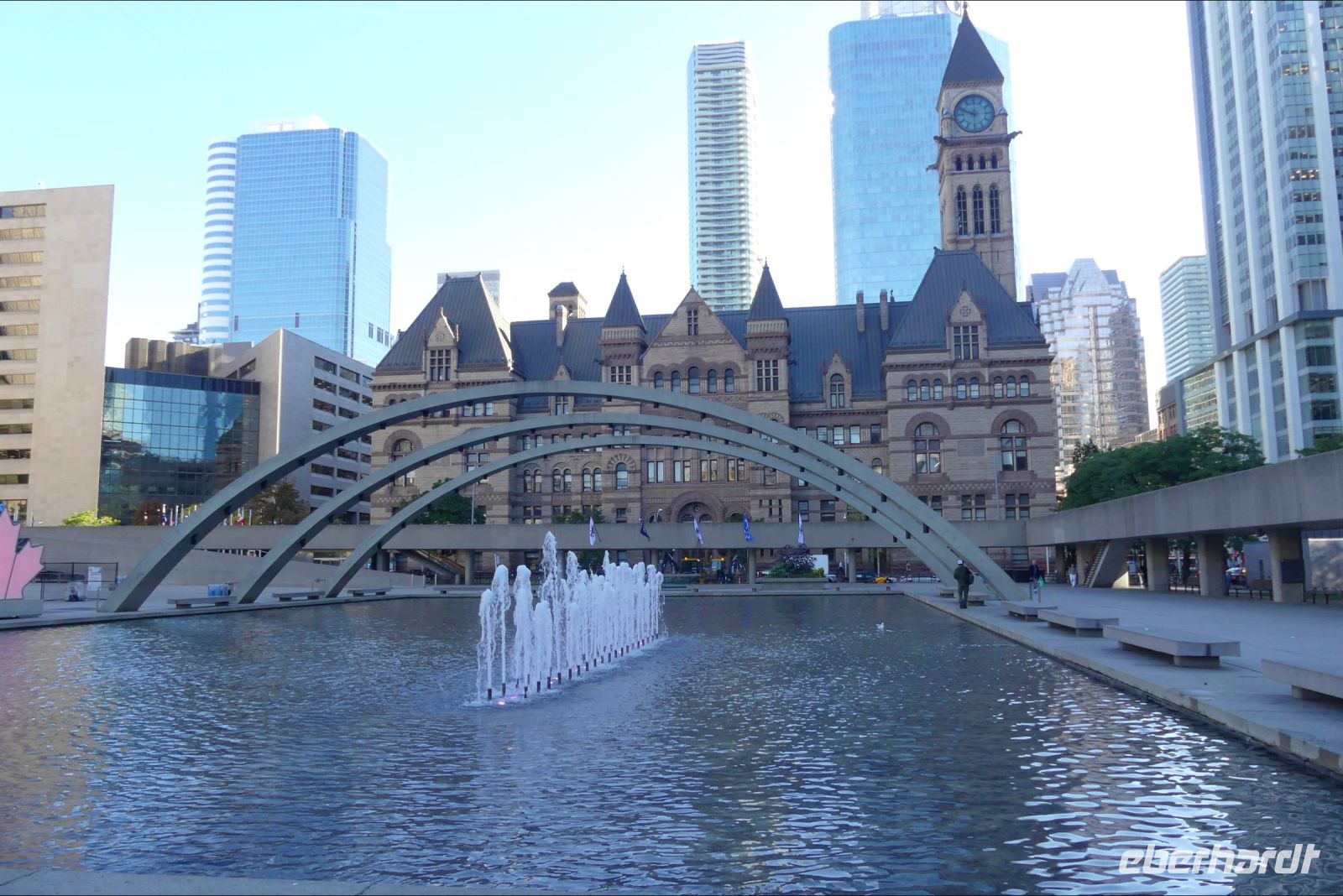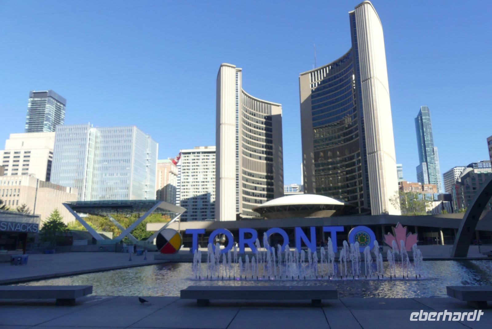 Heute Morgen ist nun unsere Gruppe vollständig. Vier Gäste waren schon zwei Tage vor uns nach Toronto gereist und haben hier ein schönes Wochenende verbracht. Unsere Stadtrundfahrt beginnen wir an der Yonge Street. Kathy sagt, es handelt sich mit ca. 2.000 Kilometer Länge um die längste Straße der Welt. Kathy kennt sich in Toronto sehr gut aus. Lange Zeit war sie hier als Honorarkonsulin für die Schweiz tätig. Wir kommen vorbei an vielen modernen Gebäuden mit Banken, Büros, Kliniken (1920 wurde in Toronto das Insulin erfunden) und dem Parlamentsgebäude,… erreichen das noble Wohnviertel Forest Hill, wo sich entlang der Kilbarry Road wunderschöne Villen und Wohnhäuser befinden. Es geht wieder zurück Richtung Zentrum vorbei am Schloss „Casa Loma“ - 1914 gebaut und heute für alle offen stehend, z. B. für Ausstellungen, Hochzeiten etc. Wir passieren Chinatown, das größte Nationenviertel der Stadt. Unseren ersten Halt haben wir an der City Hall mit dem großen Schriftzug von Toronto.